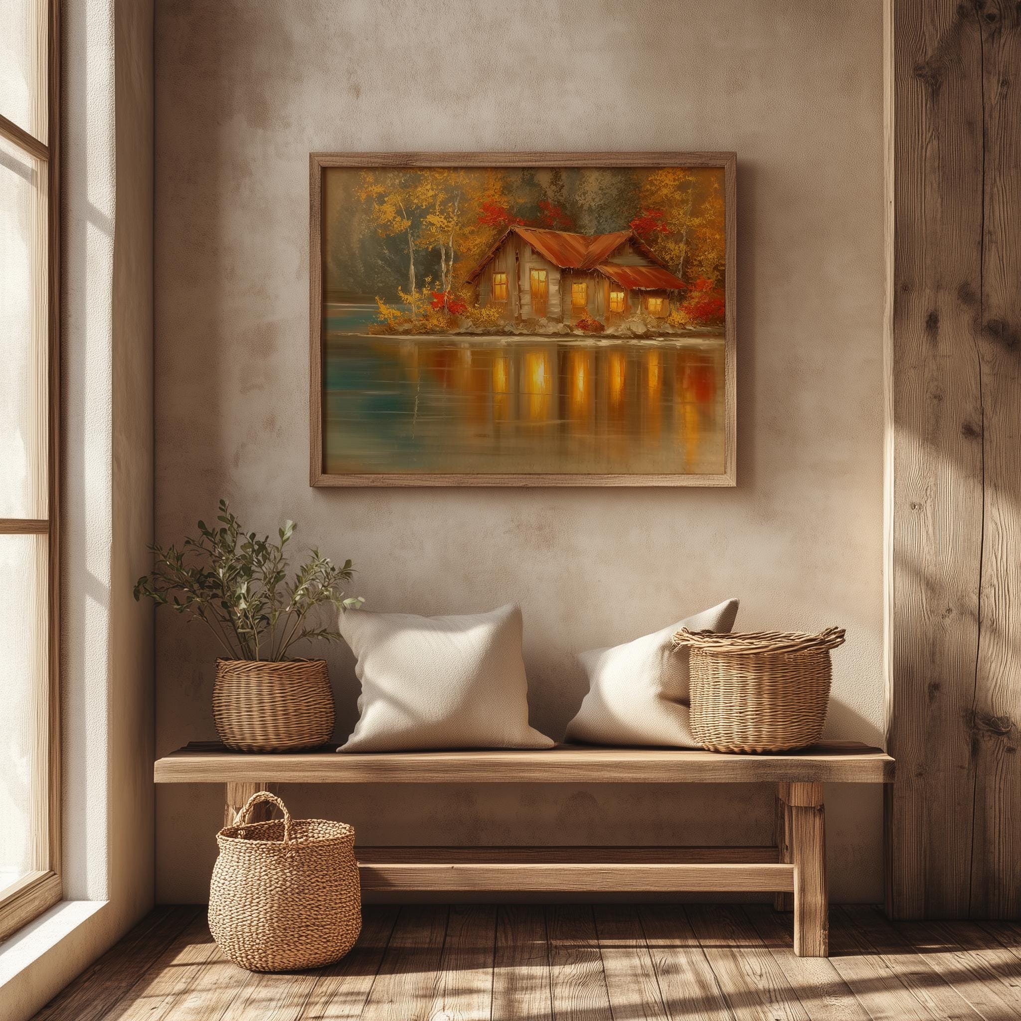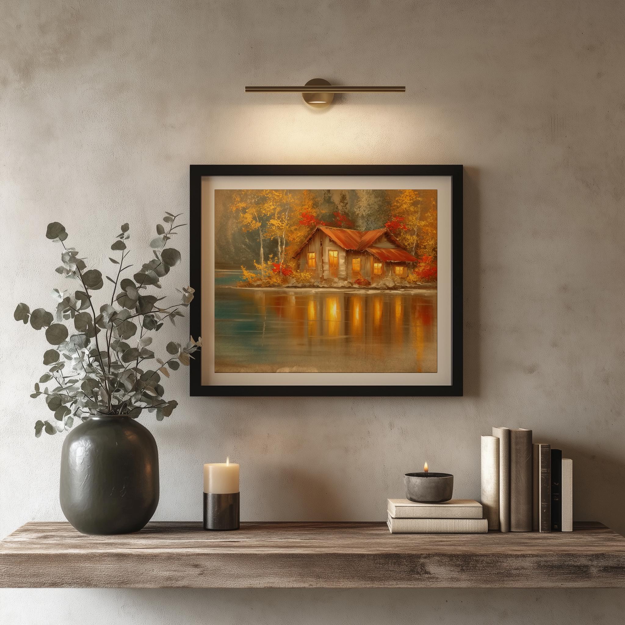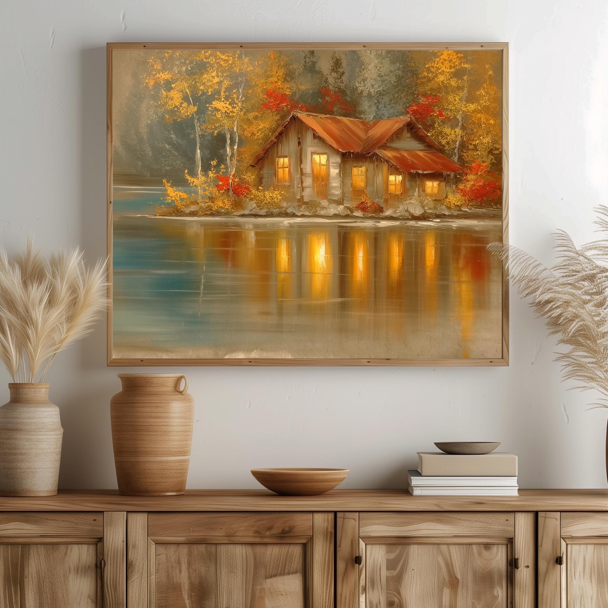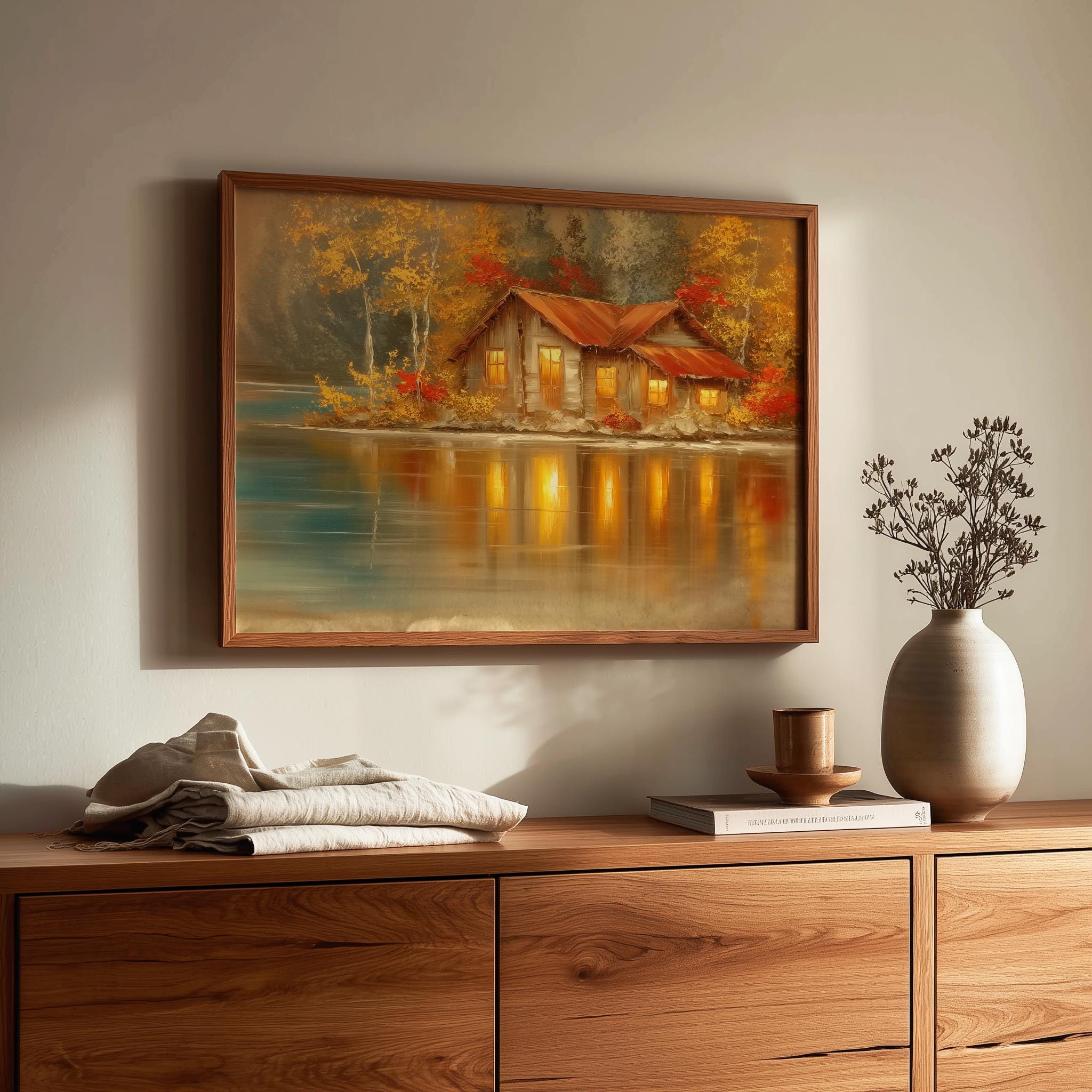 Immerse yourself in the charm with this rustic painting of a serene lakeside cabin at twilight surrounded by autumn foliage. An instantly downloadable print, it's perfect for elevating your decor with budget-friendly charm. This gives you the flexibility to customize the size, frame, and material according to your personal taste and space, ensuring a perfect fit for your walls.