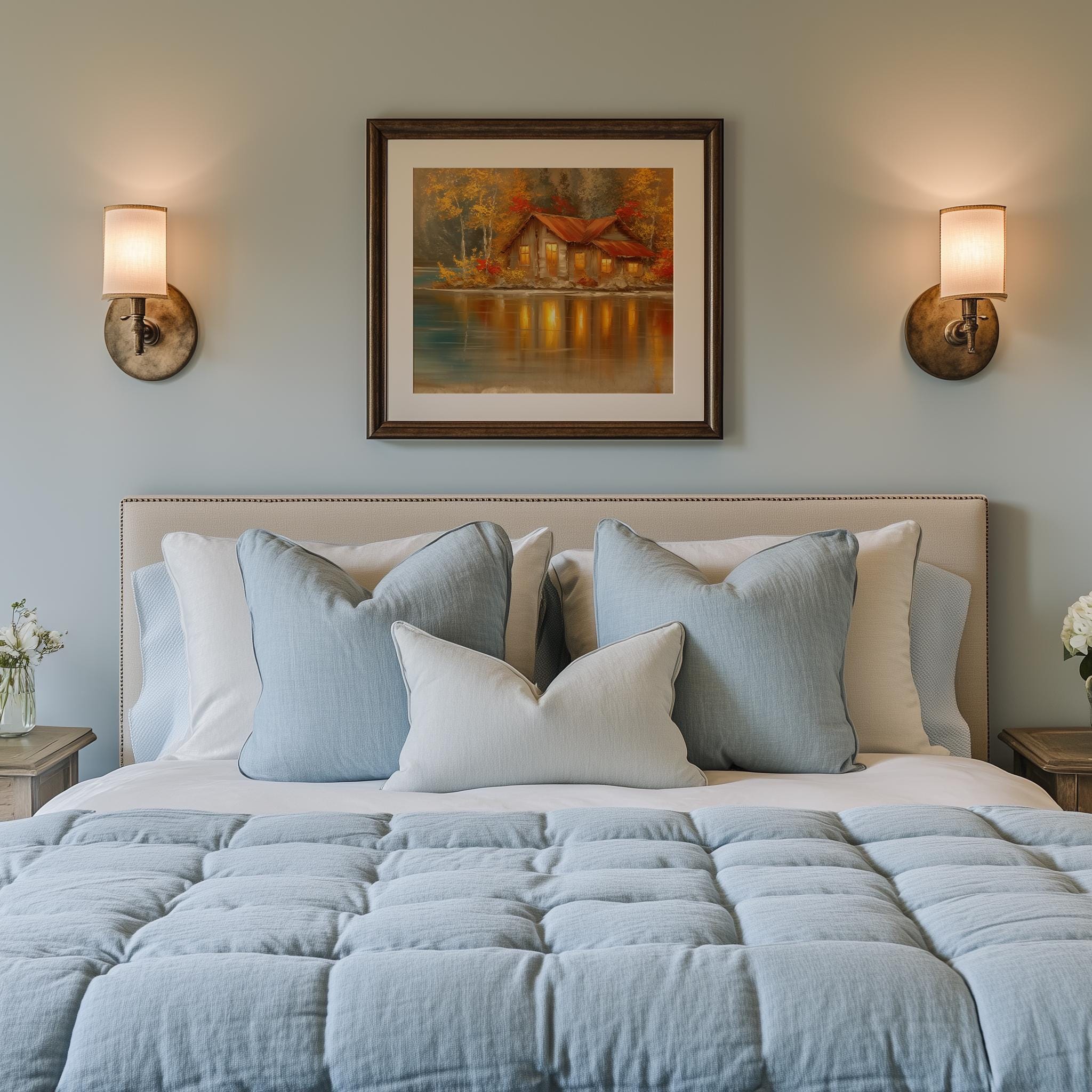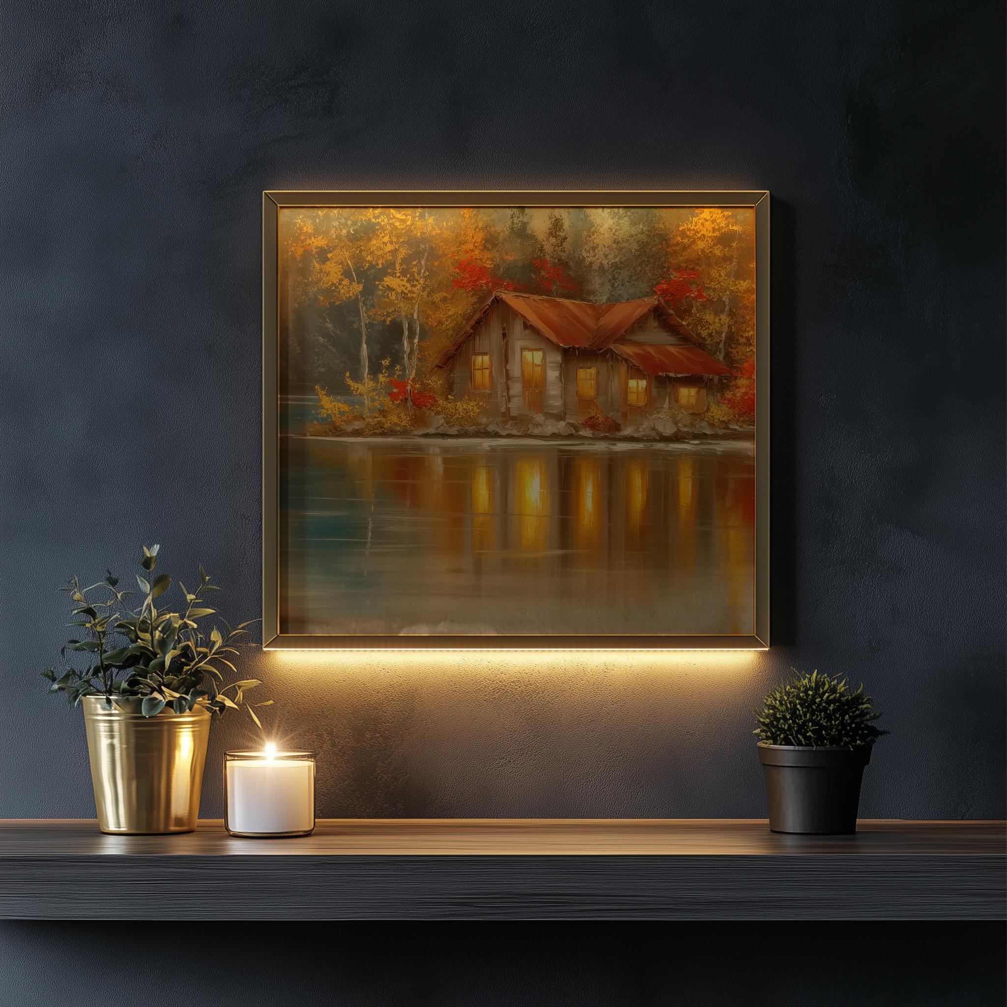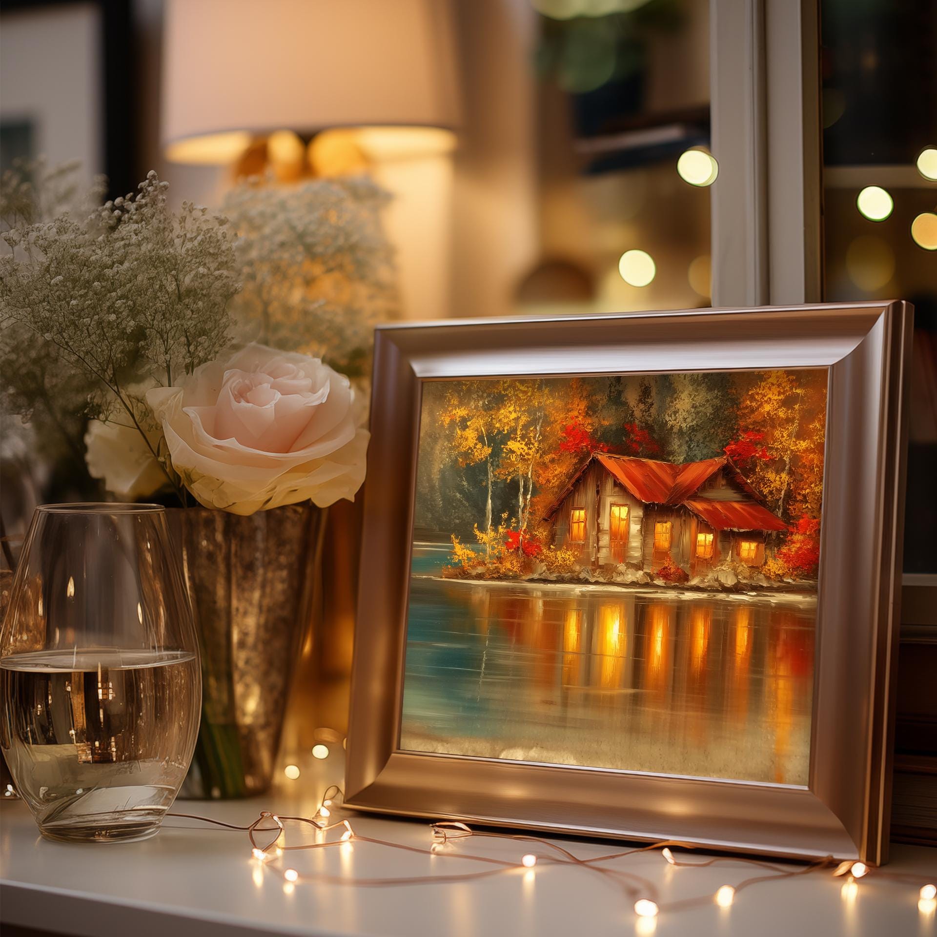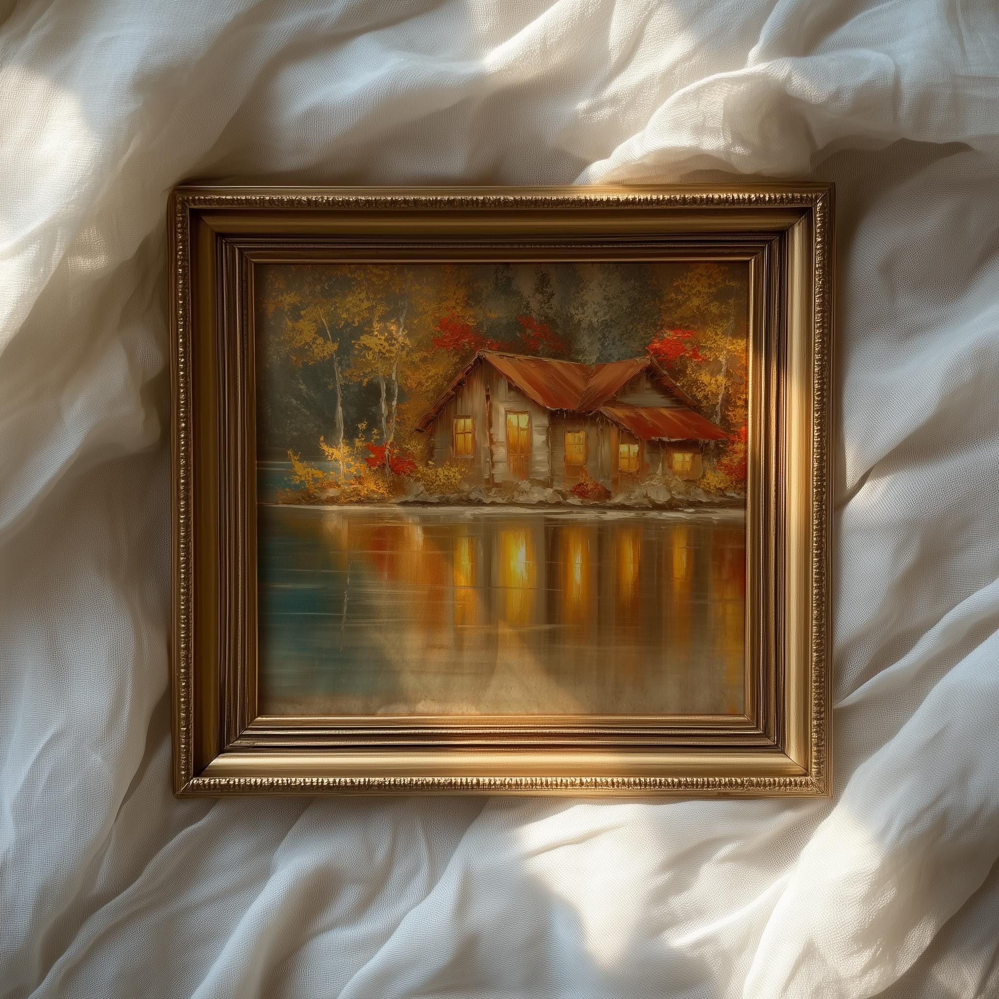 Immerse yourself in the charm with this rustic painting of a serene lakeside cabin at twilight surrounded by autumn foliage. An instantly downloadable print, it's perfect for elevating your decor with budget-friendly charm. This gives you the flexibility to customize the size, frame, and material according to your personal taste and space, ensuring a perfect fit for your walls.