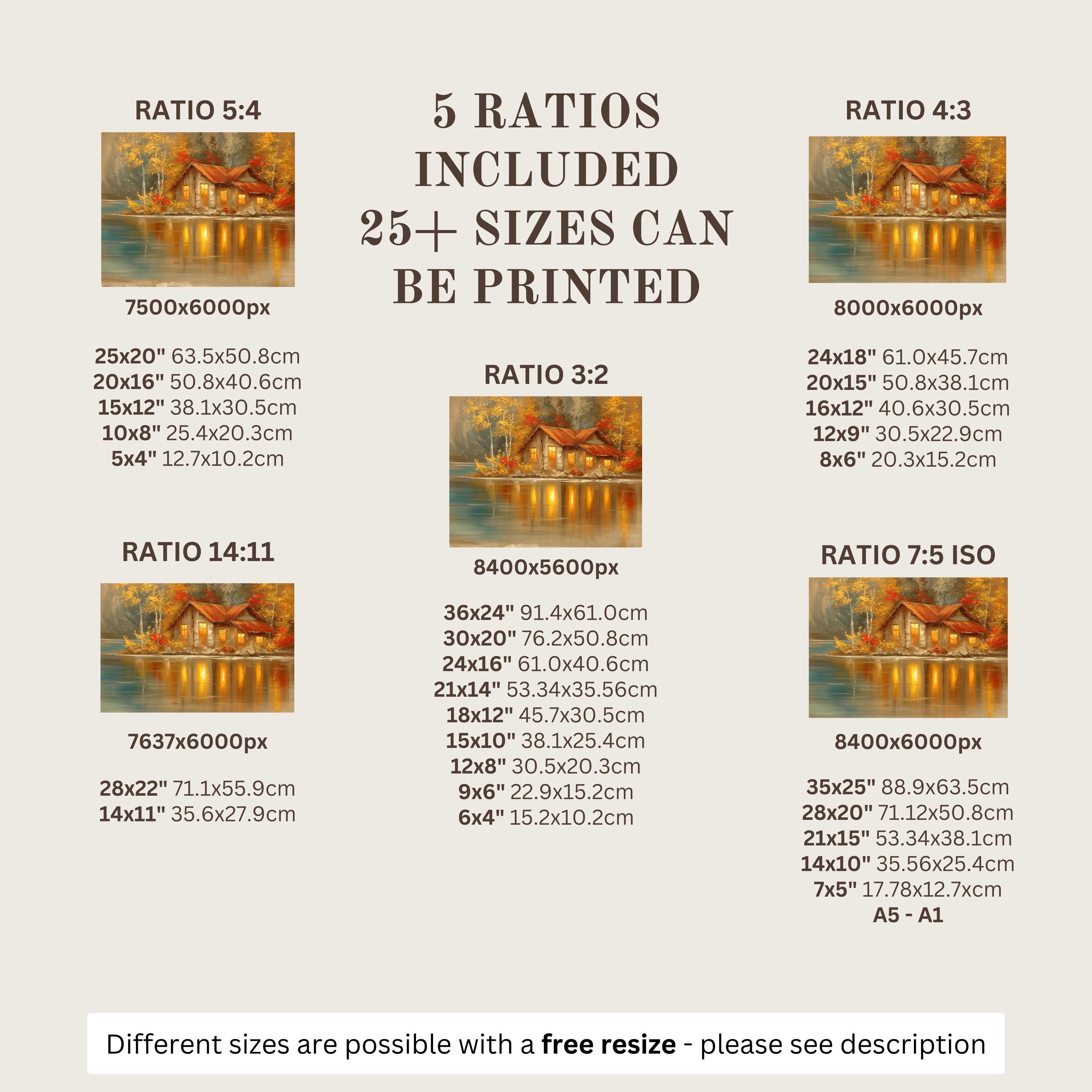 Each artwork includes 5 aspect ratios with 25+ print sizes. Most standard frames are covered. One custom resize per purchase available—message before ordering.