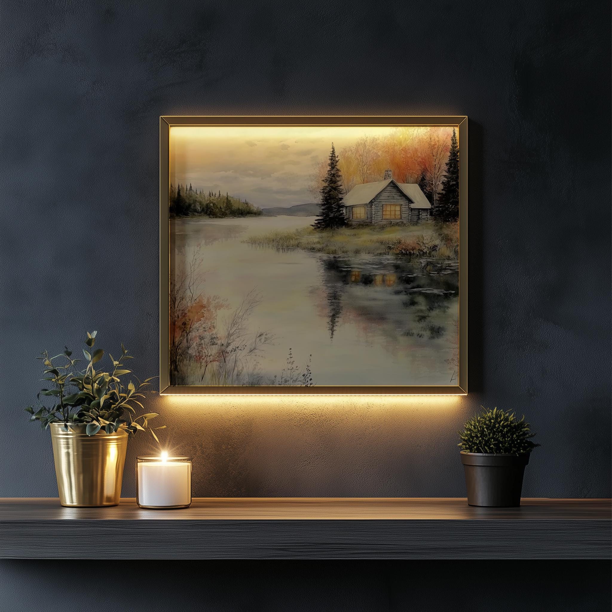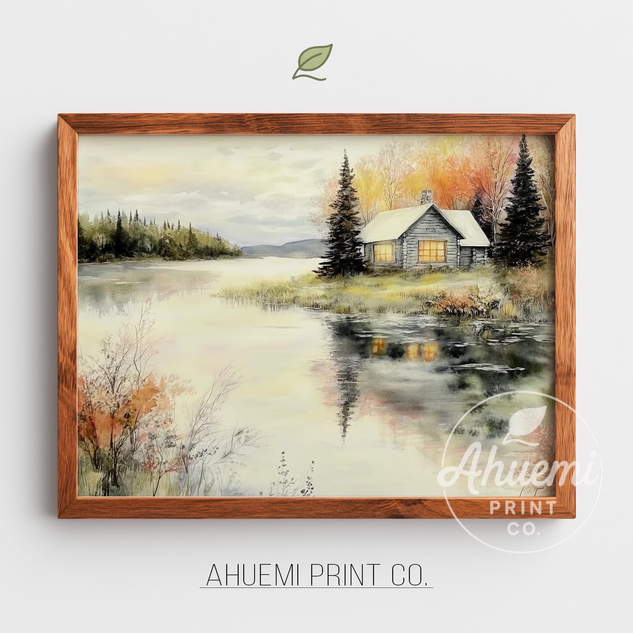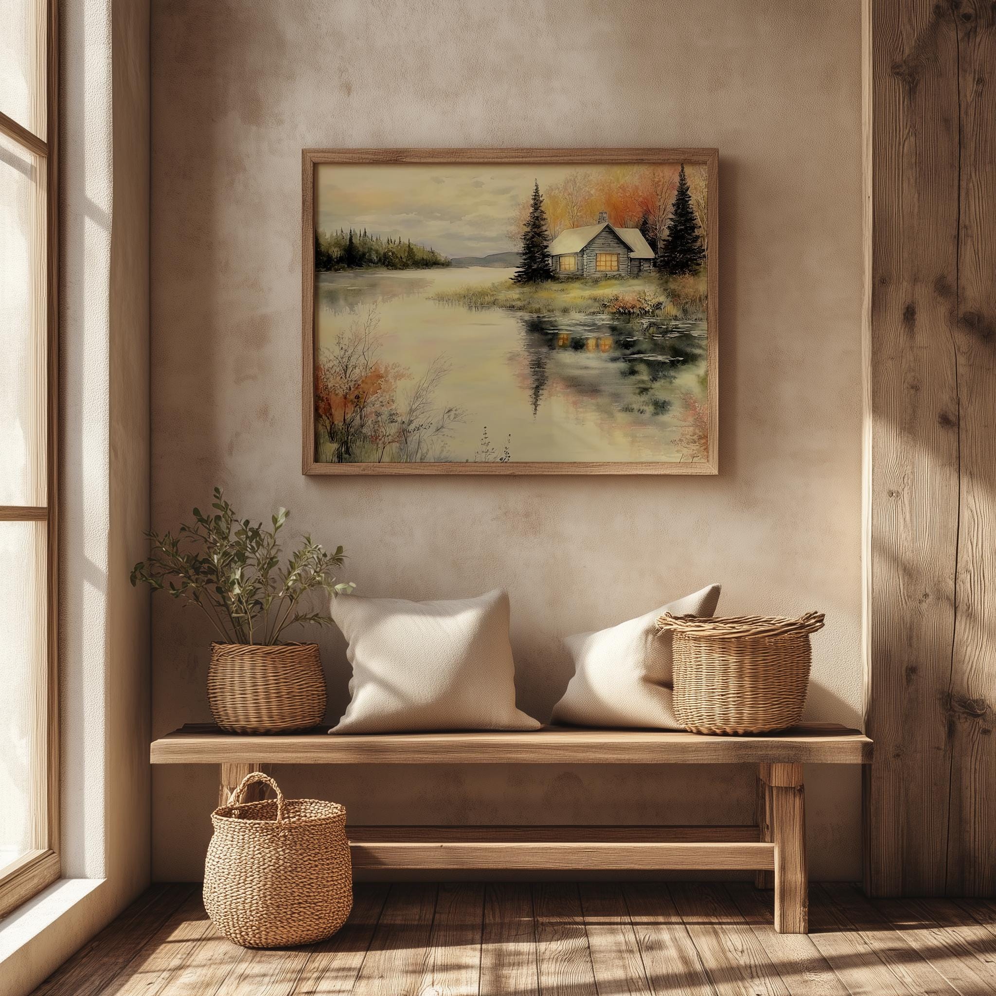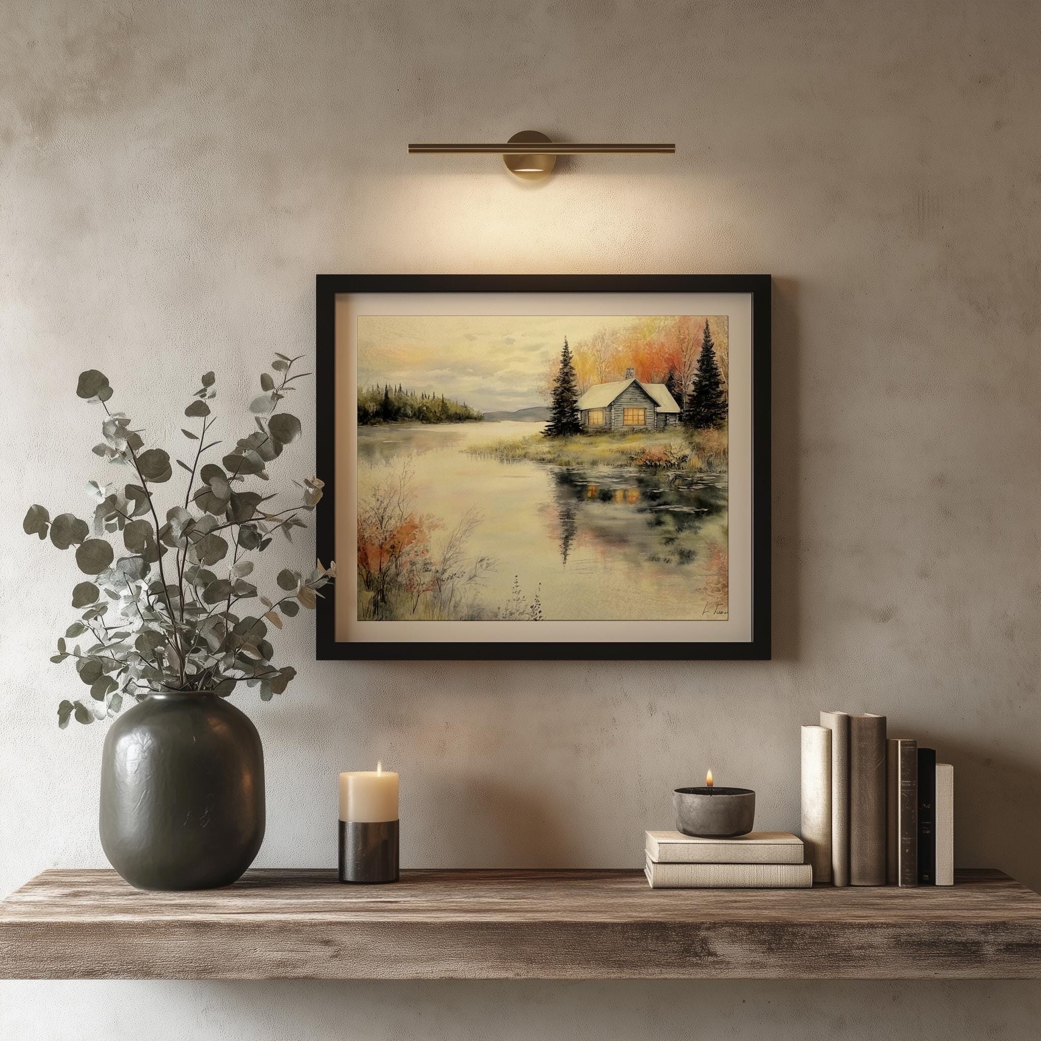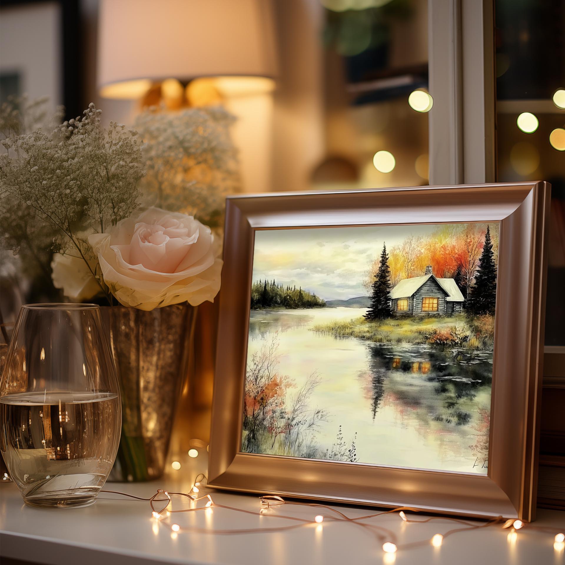 Immerse yourself in the charm with this rustic painting of a serene lakeside cabin at twilight. An instantly downloadable print, it's perfect for elevating your decor with budget-friendly charm. This gives you the flexibility to customize the size, frame, and material according to your personal taste and space, ensuring a perfect fit for your walls.