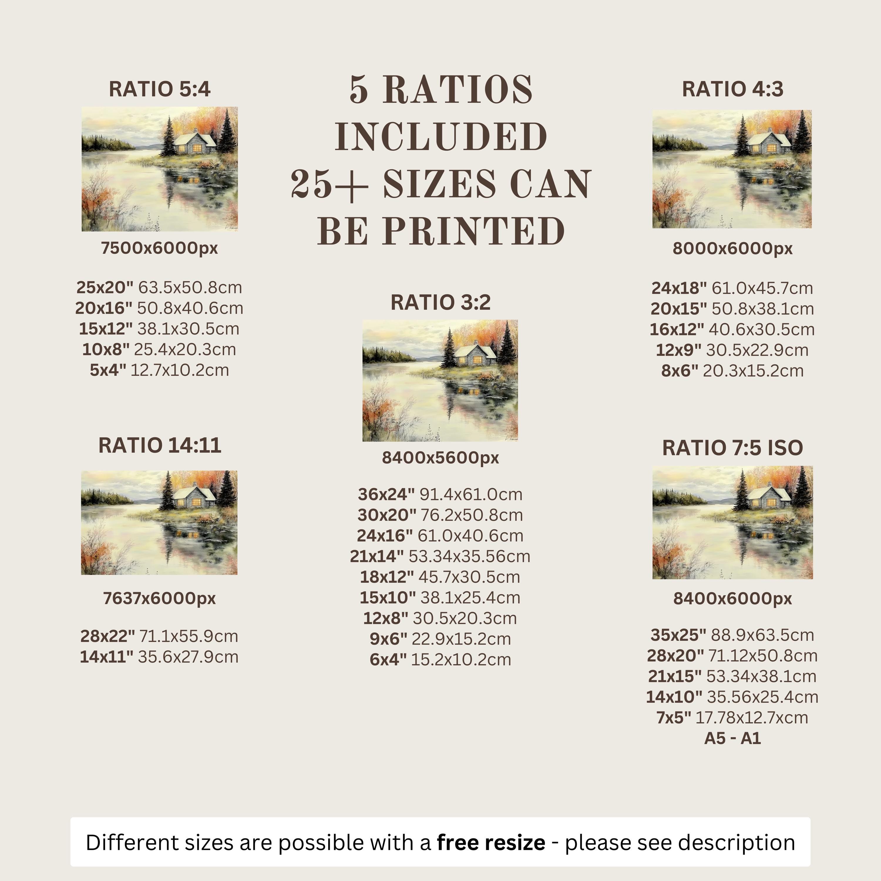 Each artwork includes 5 aspect ratios with 25+ print sizes. Most standard frames are covered. One custom resize per purchase available—message before ordering.
