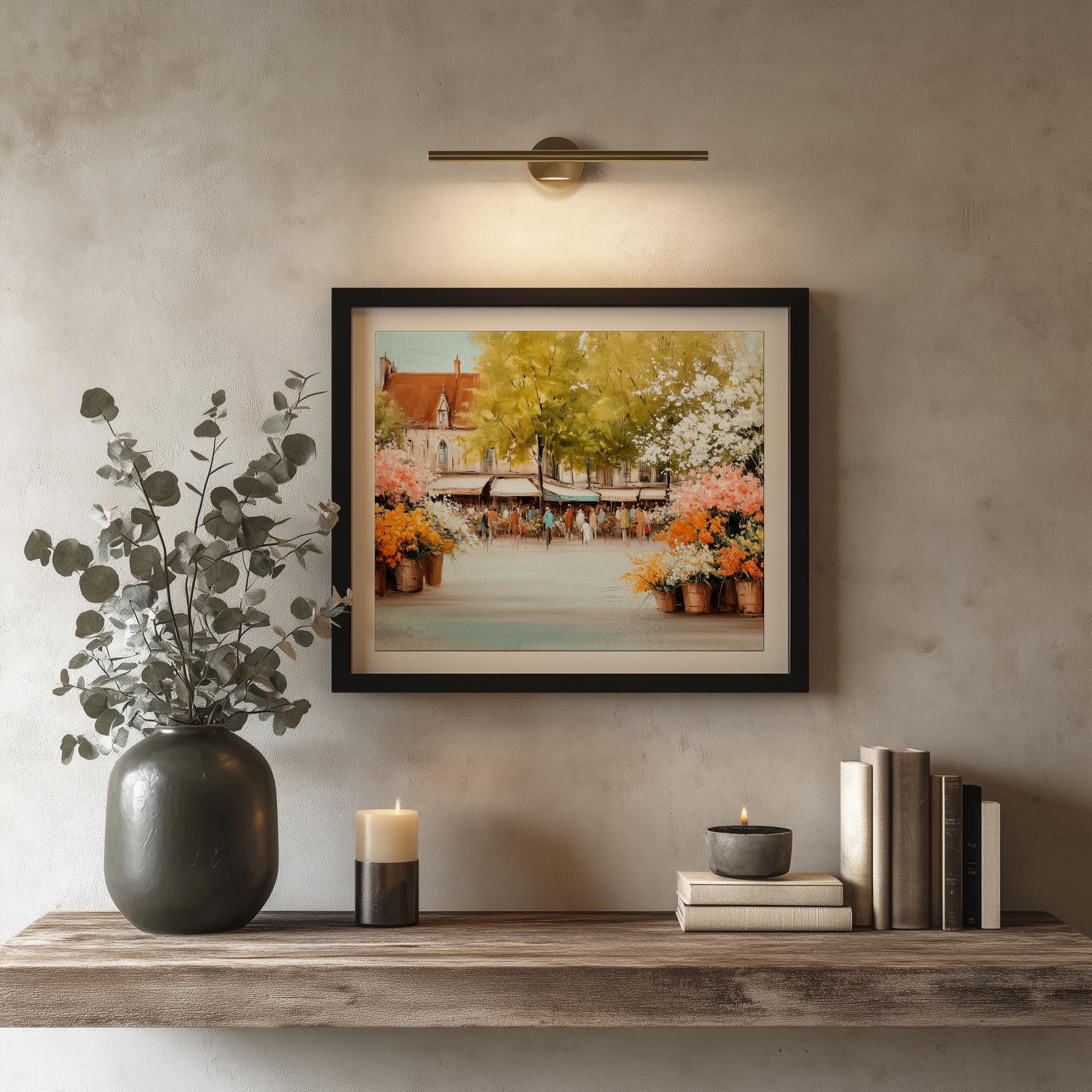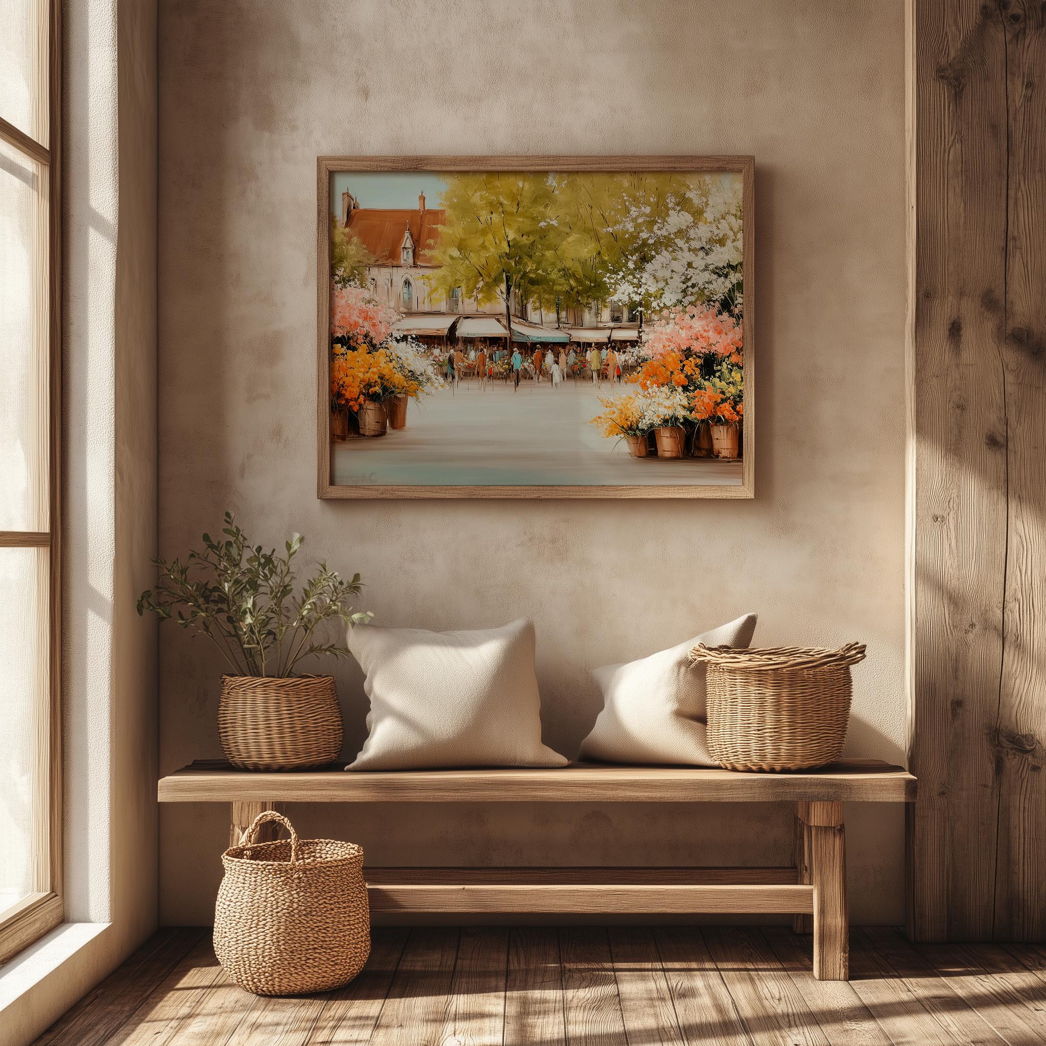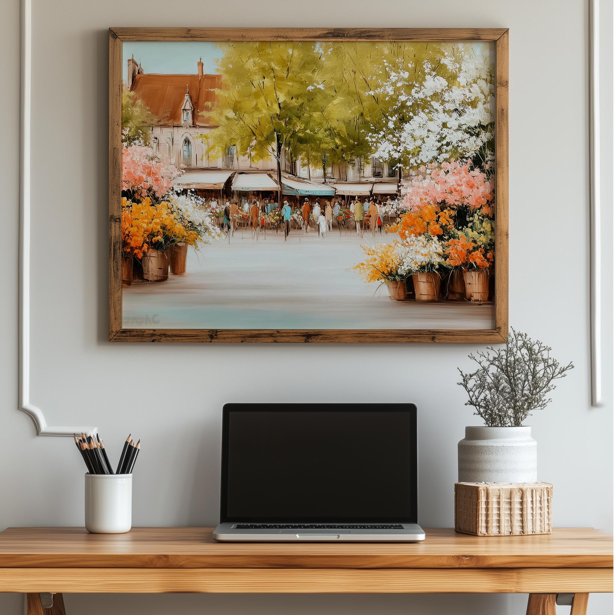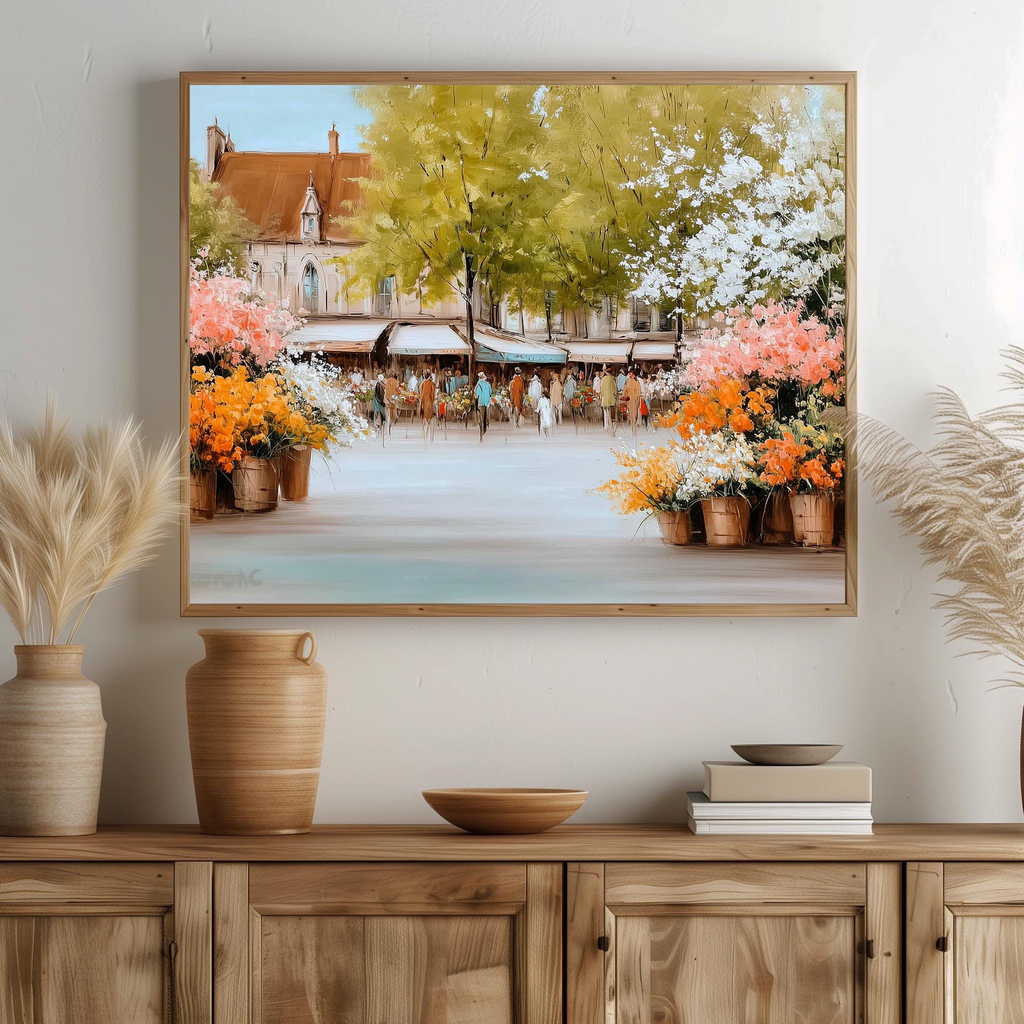 Immerse yourself in the charm with this rustic painting of a charming European flower market, bustling with pastel blooms and rustic stalls. An instantly downloadable print, it's perfect for elevating your decor with budget-friendly charm. This gives you the flexibility to customize the size, frame, and material according to your personal taste and space, ensuring a perfect fit for your walls.