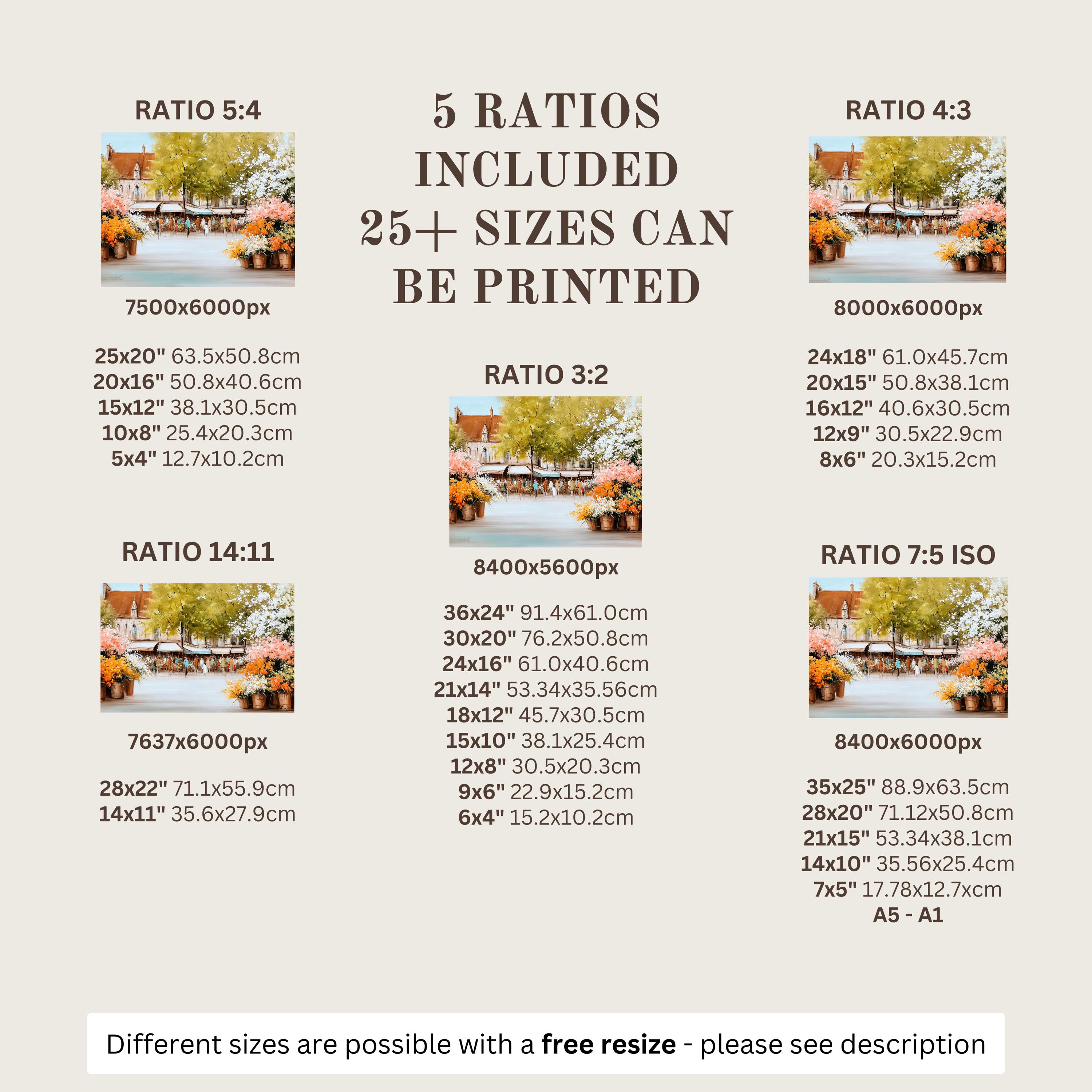 Each artwork includes 5 aspect ratios with 25+ print sizes. Most standard frames are covered. One custom resize per purchase available—message before ordering.