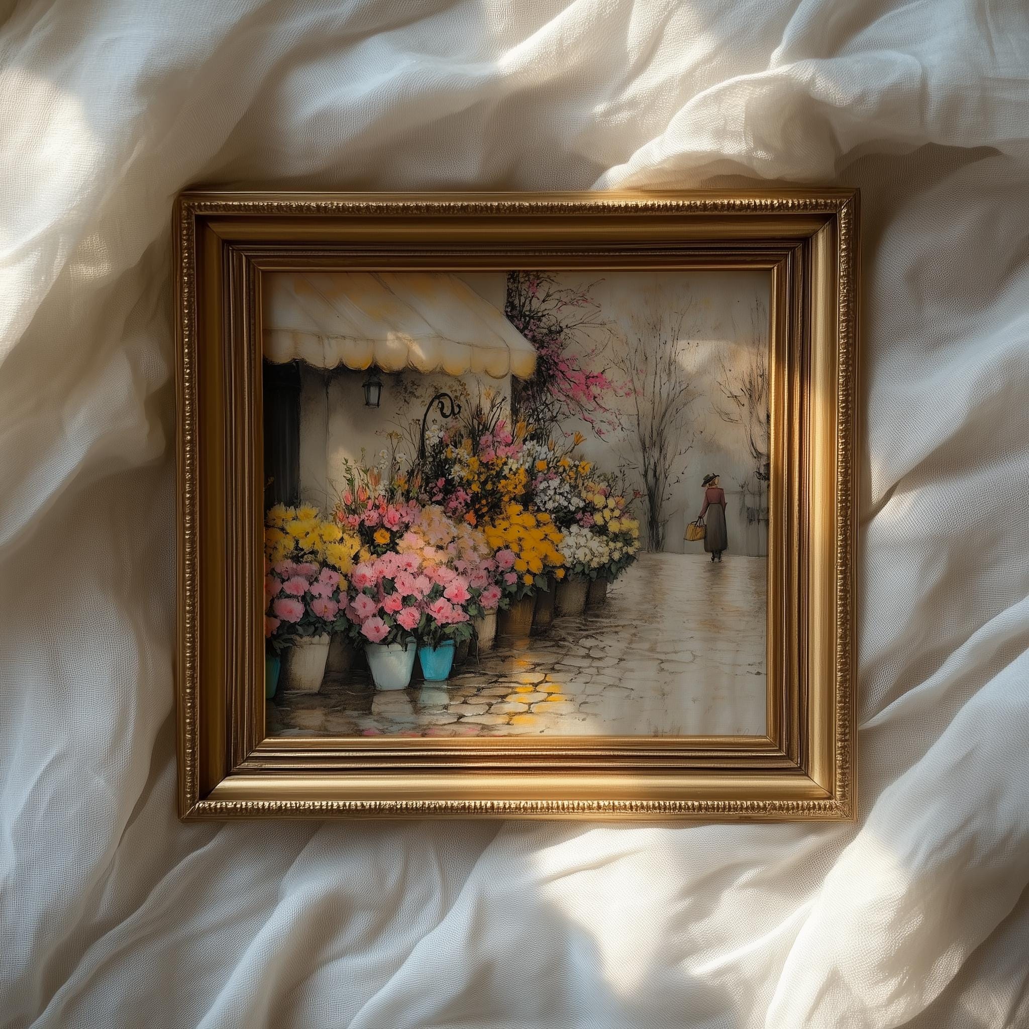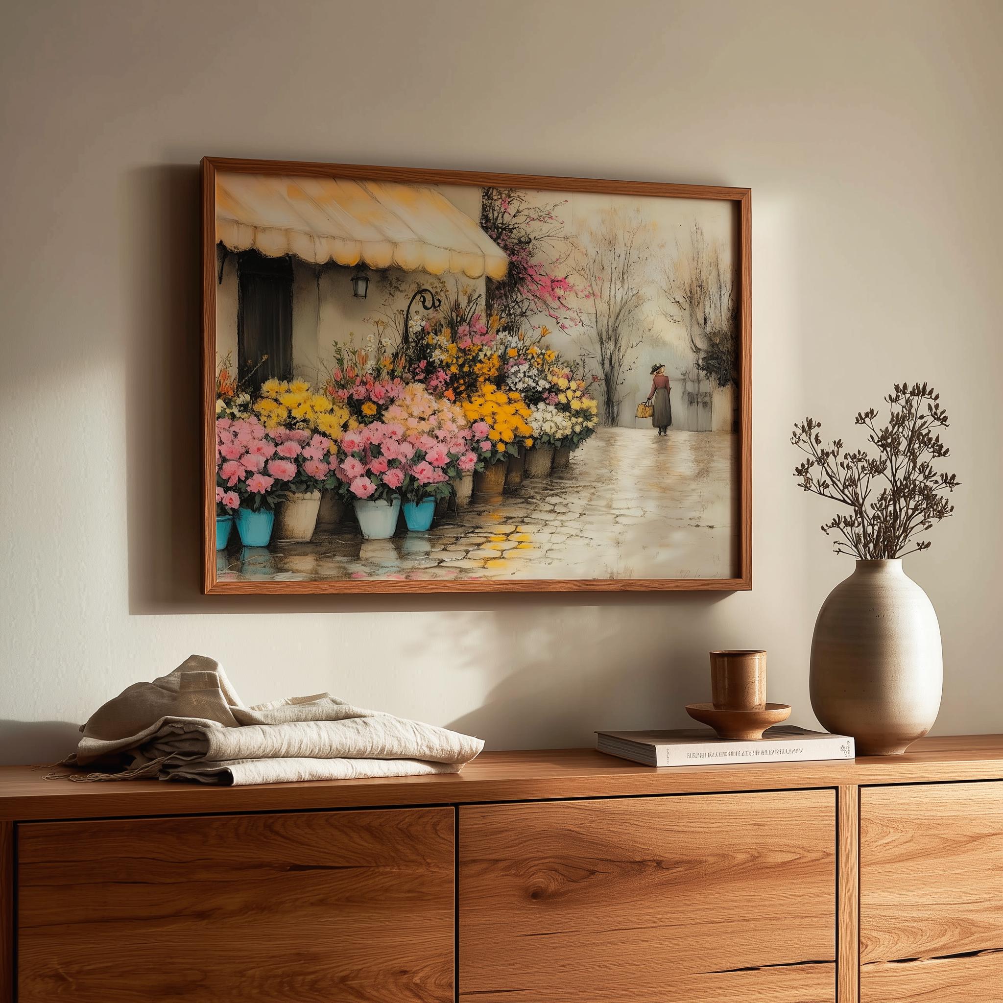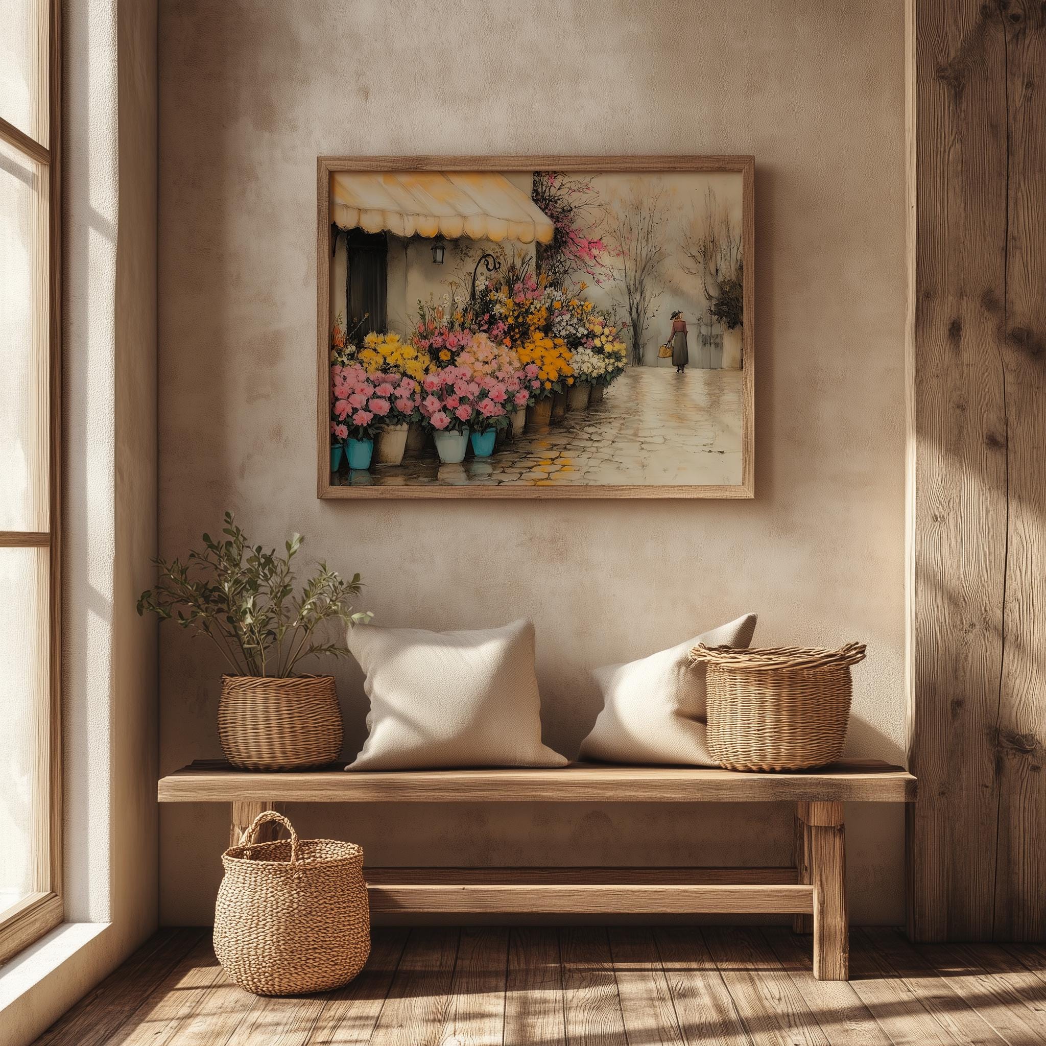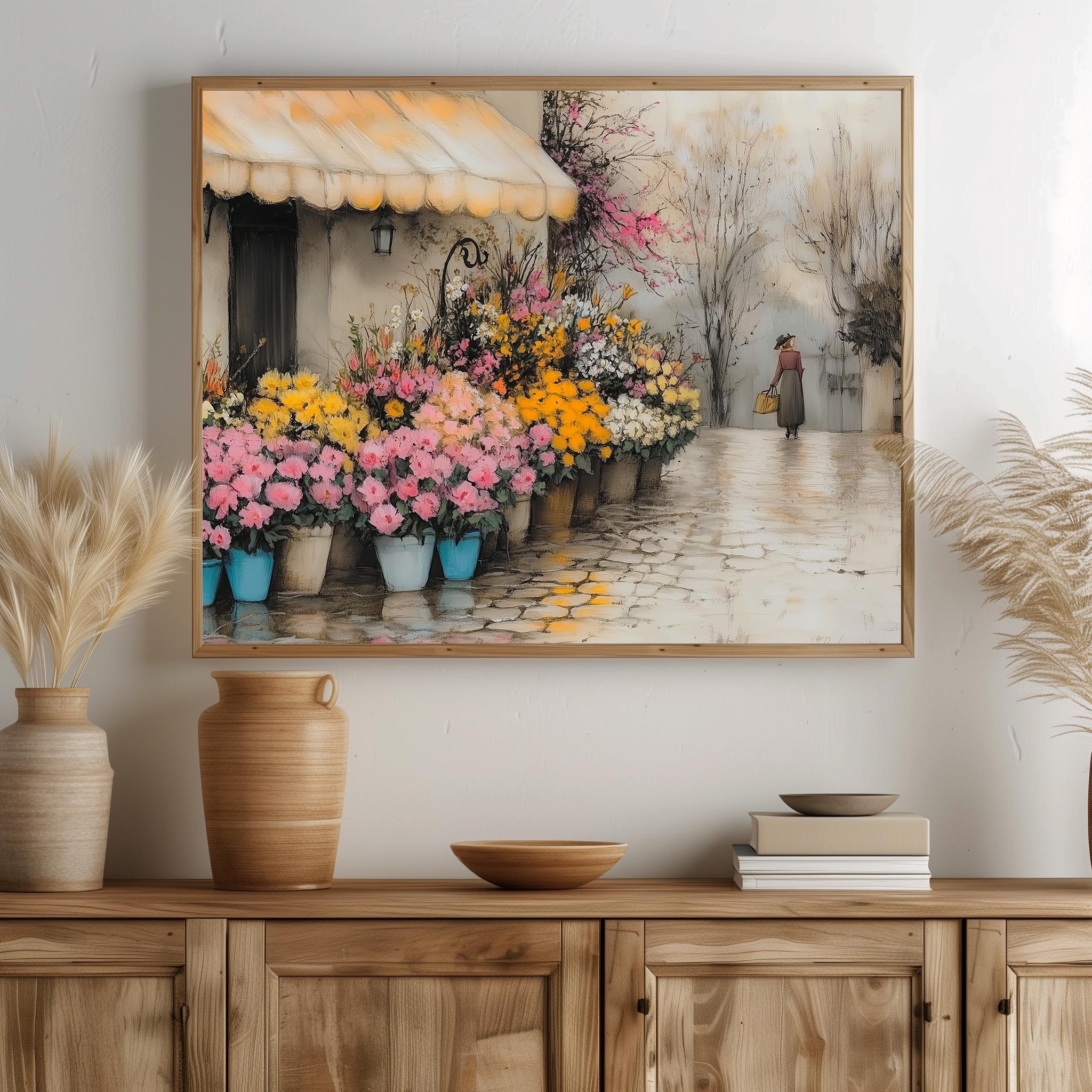 Immerse yourself in the charm with this rustic painting of a charming flower market stall nestled in a vintage cobblestone street. An instantly downloadable print, it's perfect for elevating your decor with budget-friendly charm. This gives you the flexibility to customize the size, frame, and material according to your personal taste and space, ensuring a perfect fit for your walls.