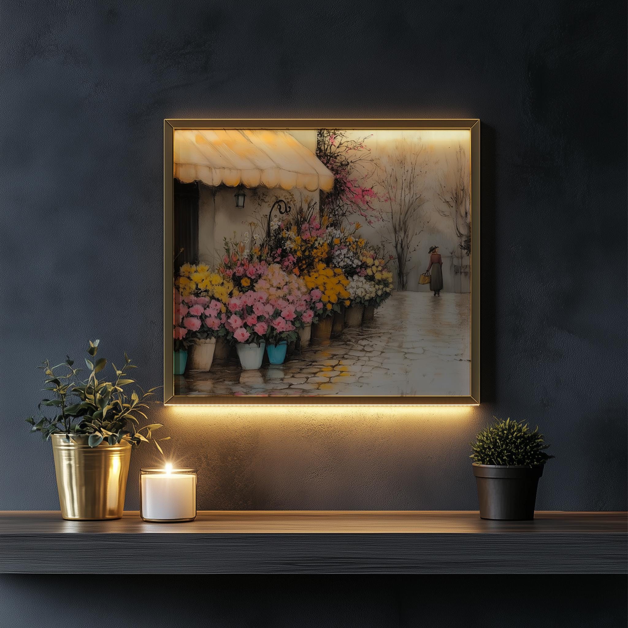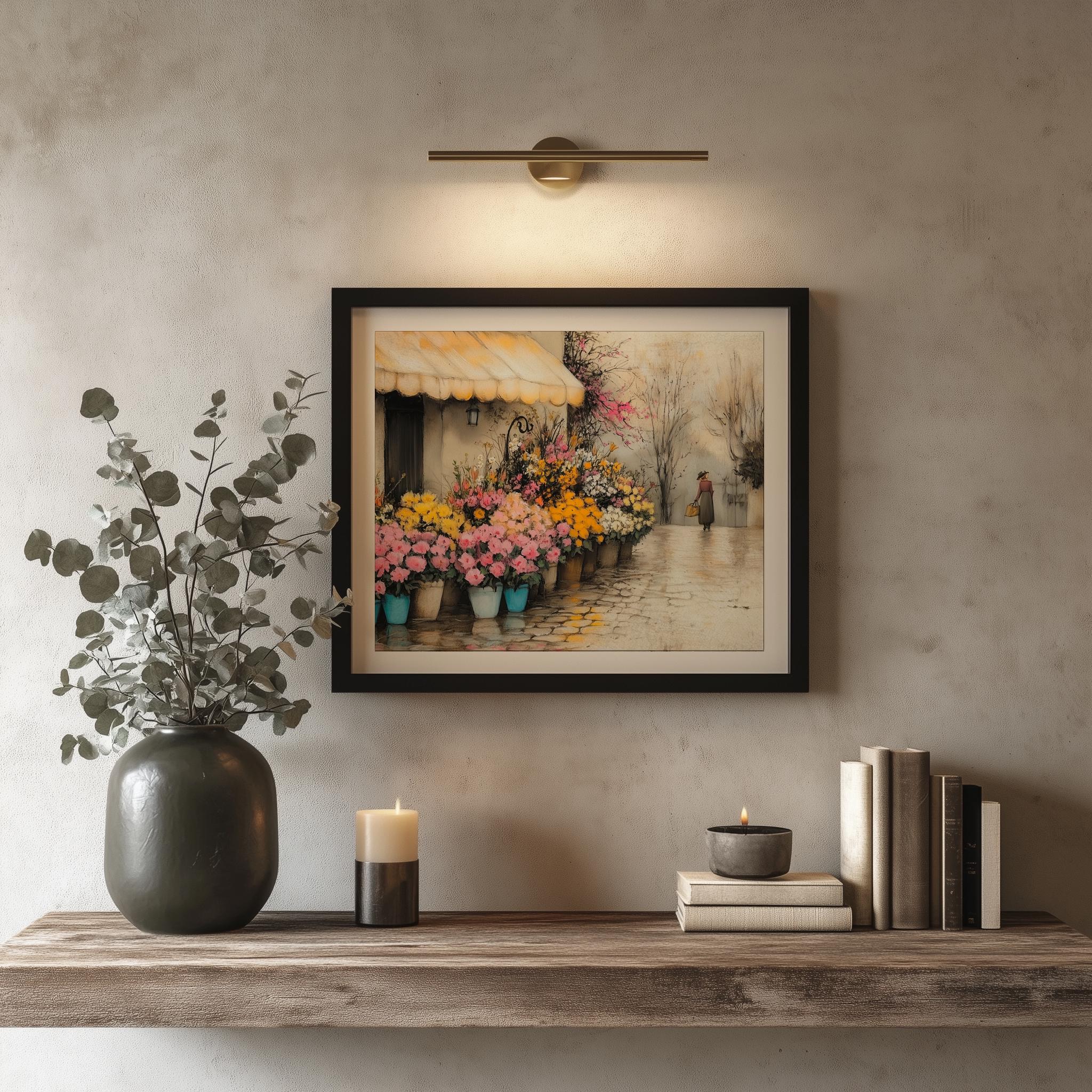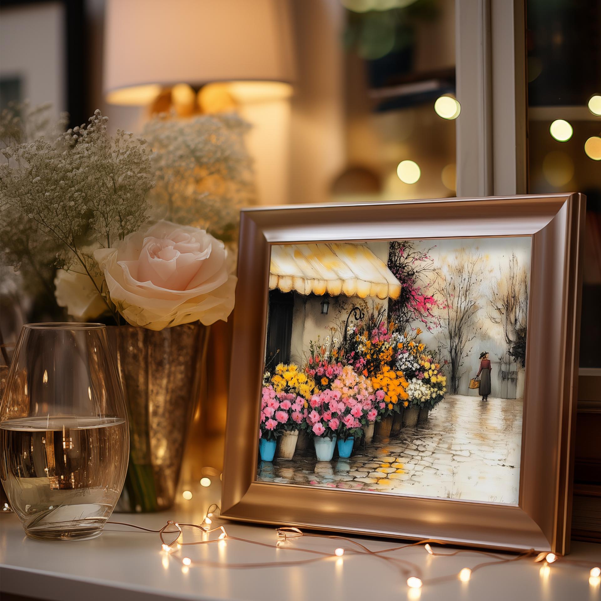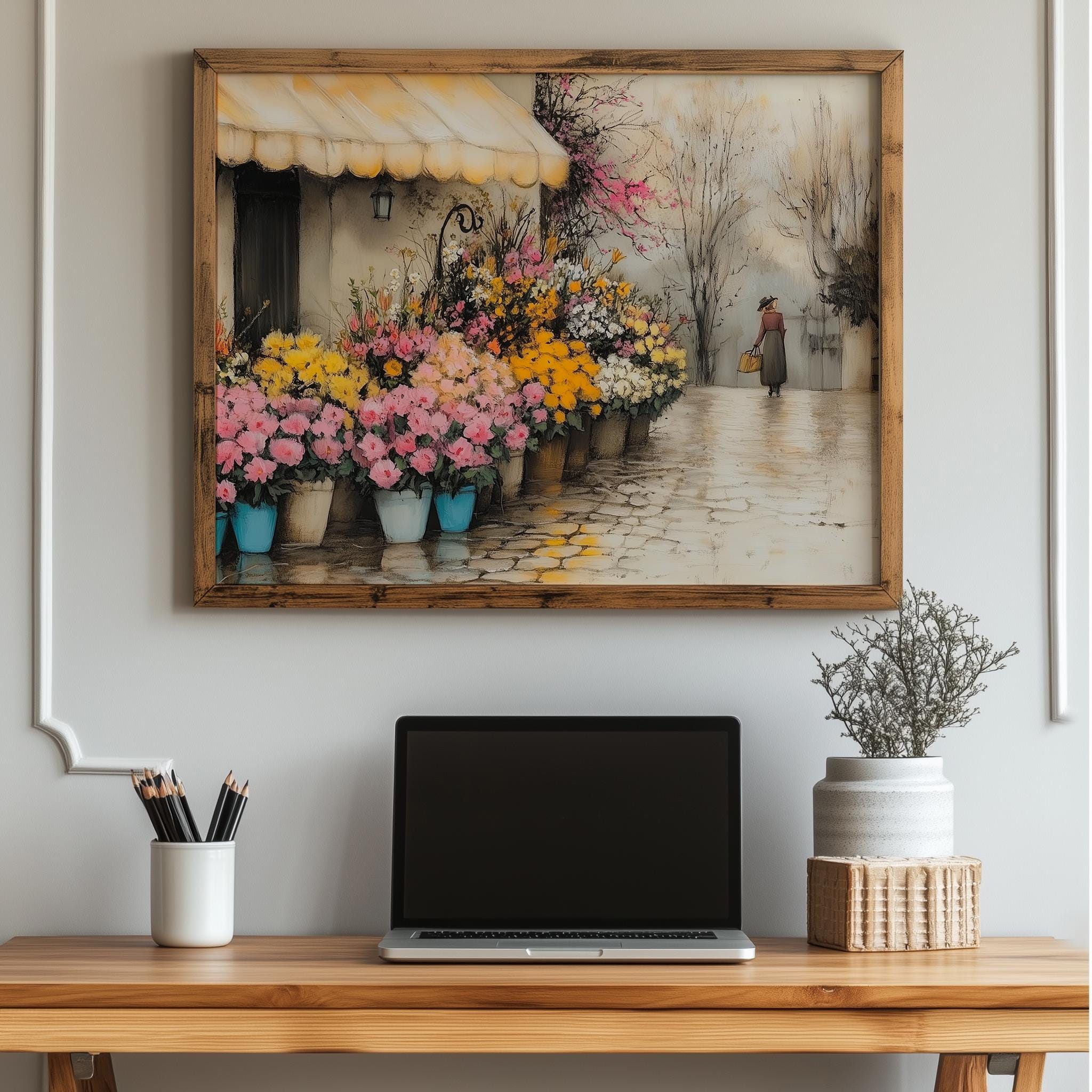 Immerse yourself in the charm with this rustic painting of a charming flower market stall nestled in a vintage cobblestone street. An instantly downloadable print, it's perfect for elevating your decor with budget-friendly charm. This gives you the flexibility to customize the size, frame, and material according to your personal taste and space, ensuring a perfect fit for your walls.