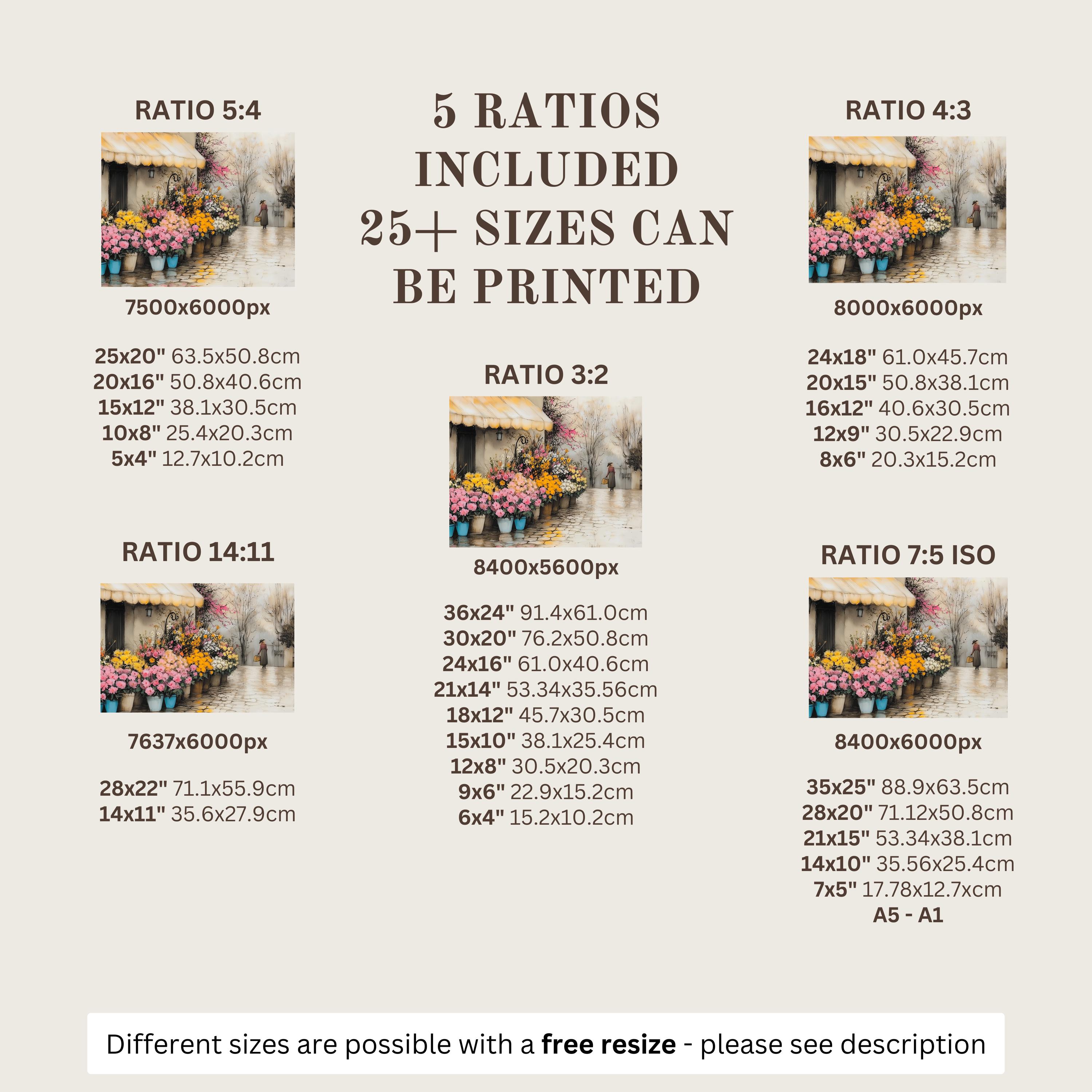 Each artwork includes 5 aspect ratios with 25+ print sizes. Most standard frames are covered. One custom resize per purchase available—message before ordering.