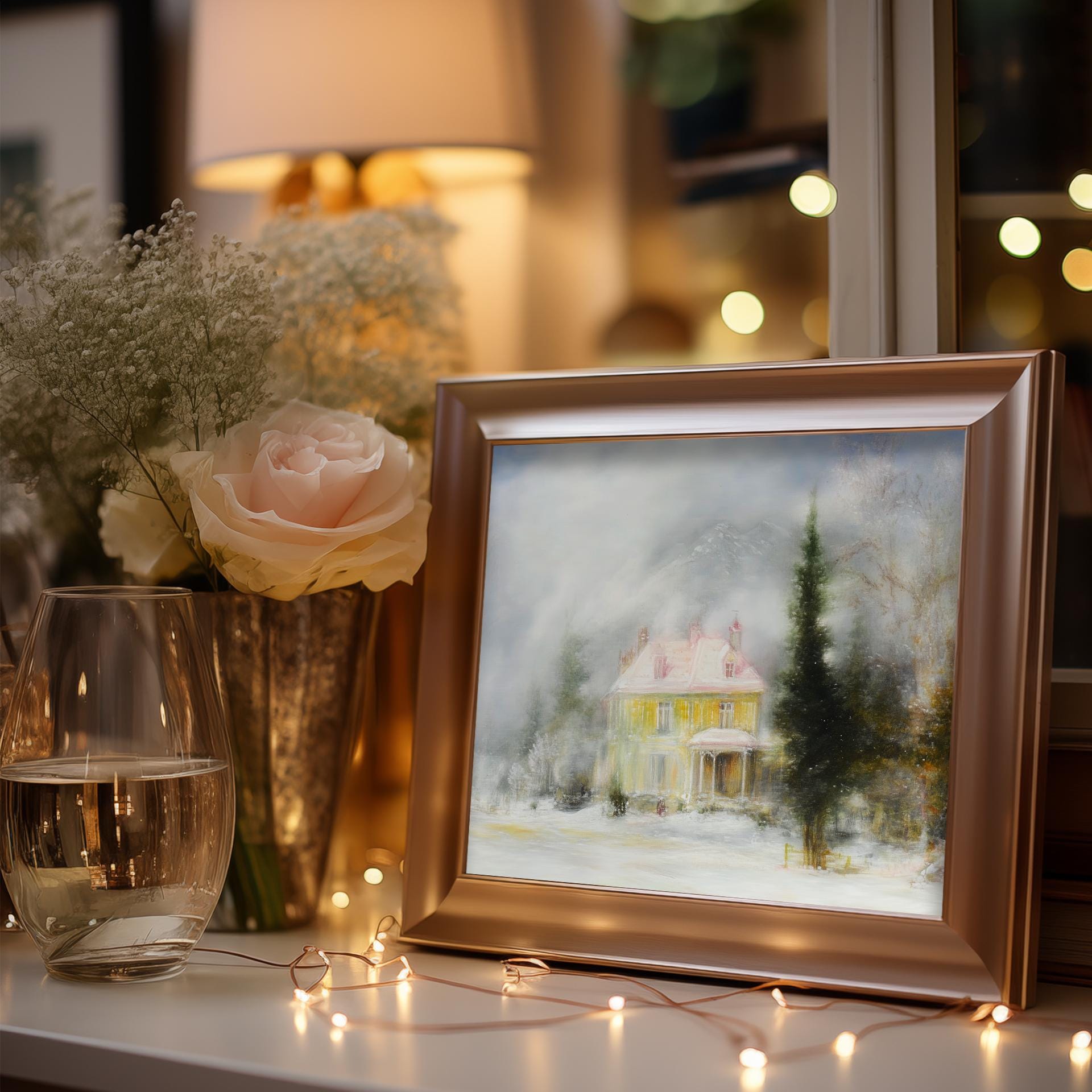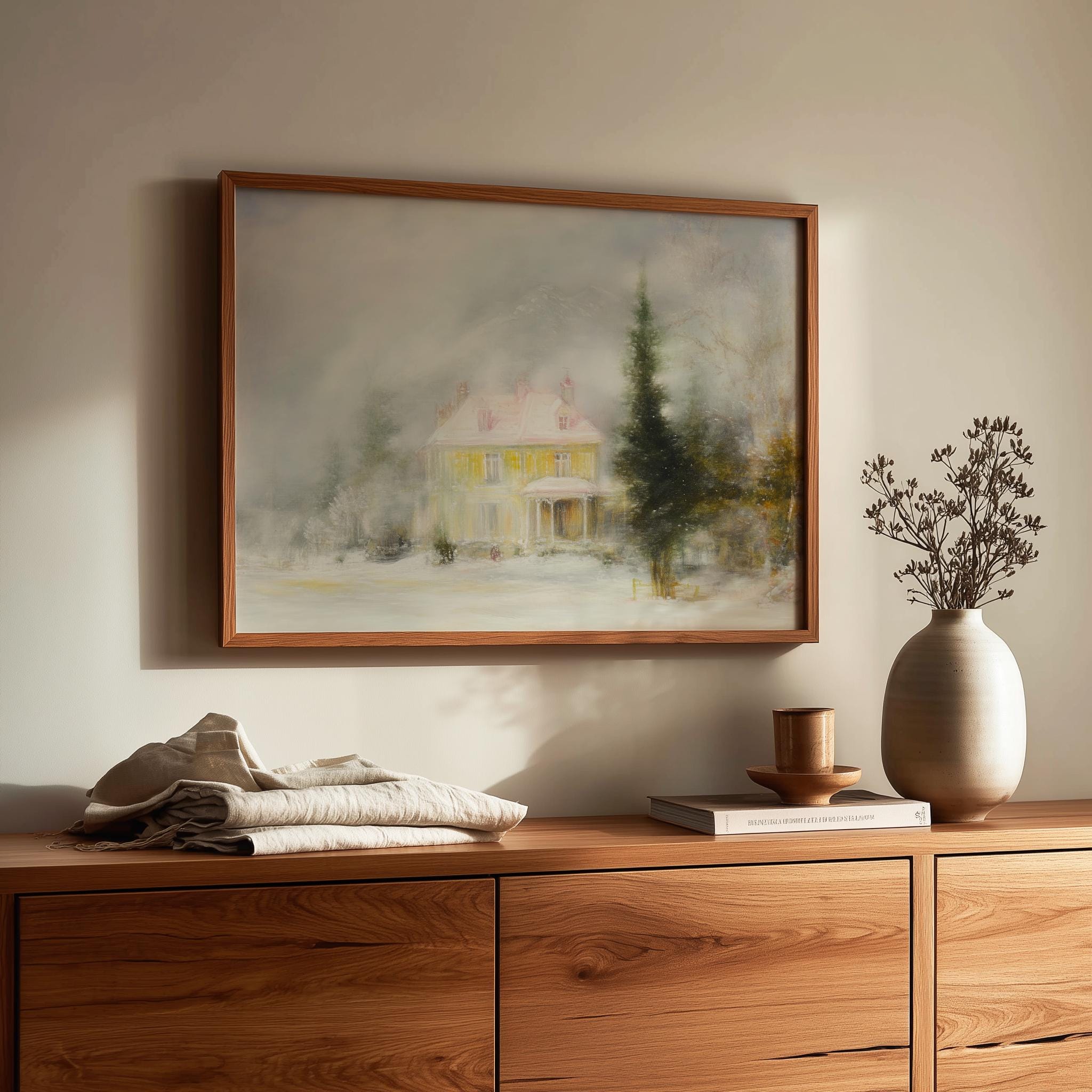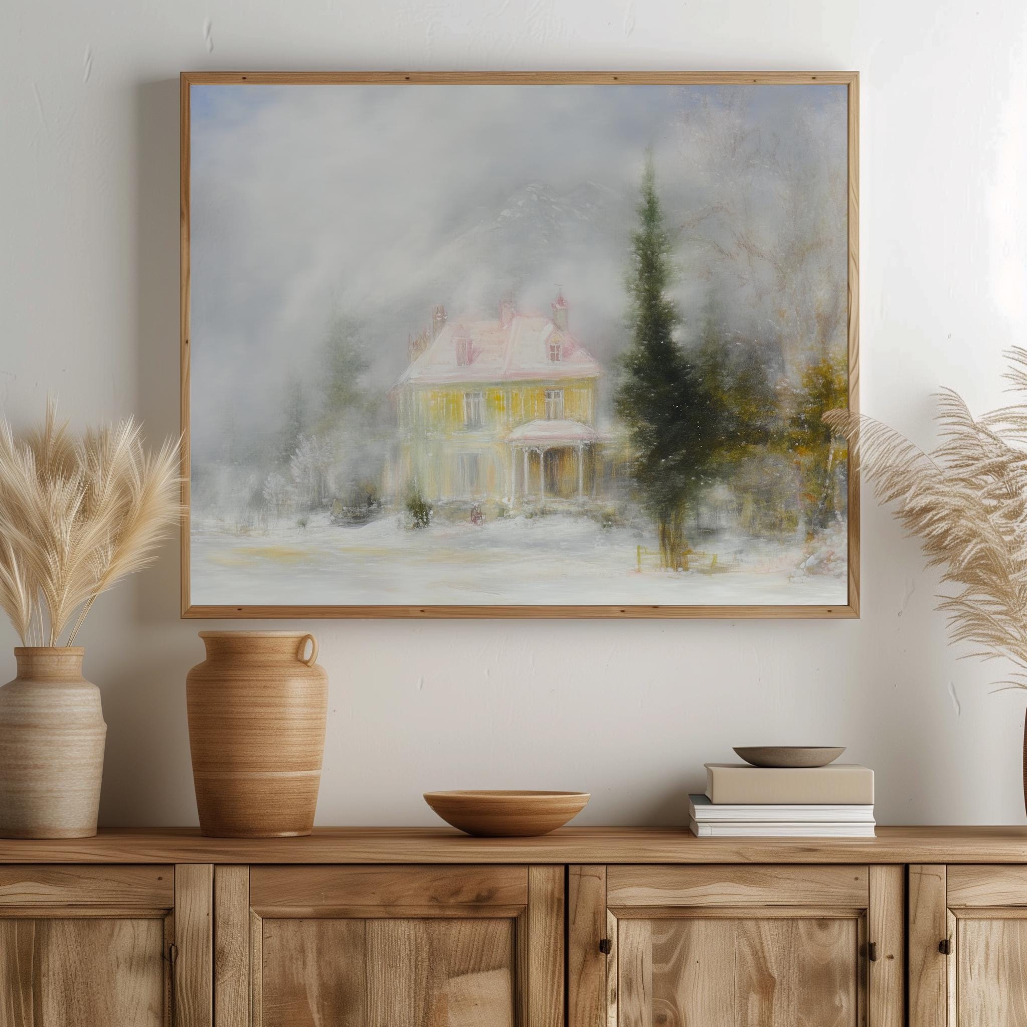 Immerse yourself in the charm with this rustic painting of a snowy mountain village, complete with a cozy cottage and a warm glow. An instantly downloadable print, it's perfect for elevating your decor with budget-friendly charm. This gives you the flexibility to customize the size, frame, and material according to your personal taste and space, ensuring a perfect fit for your walls.