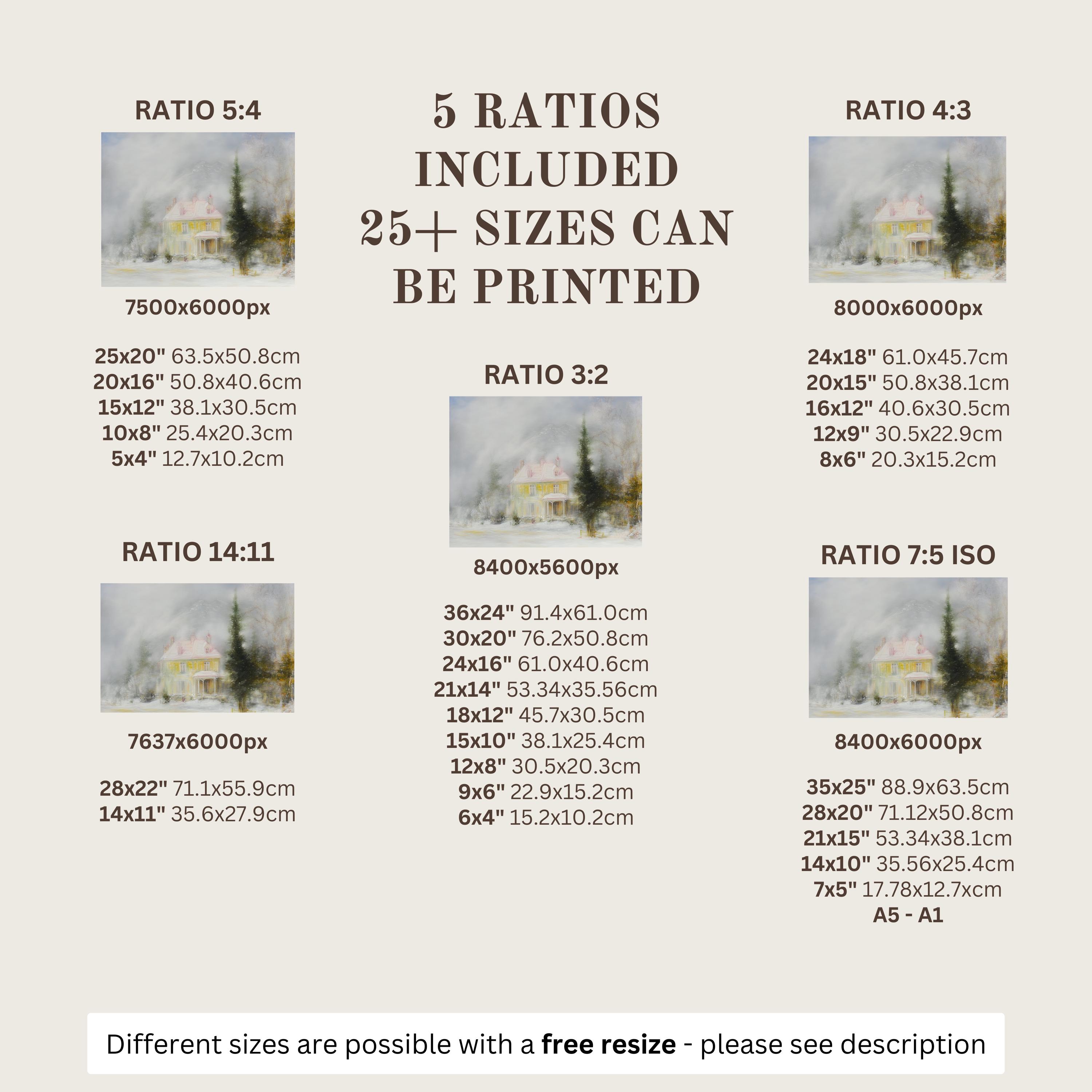 Each artwork includes 5 aspect ratios with 25+ print sizes. Most standard frames are covered. One custom resize per purchase available—message before ordering.