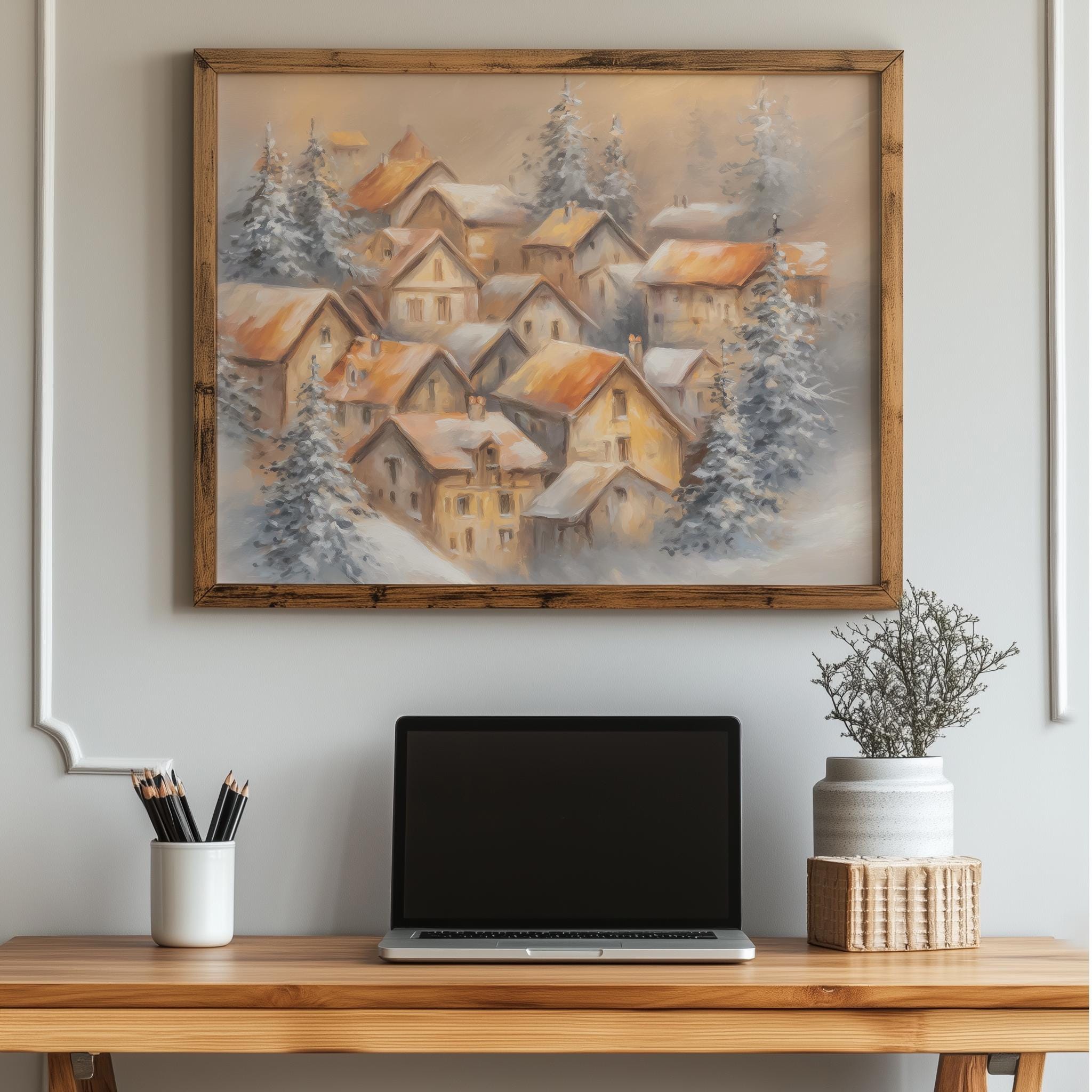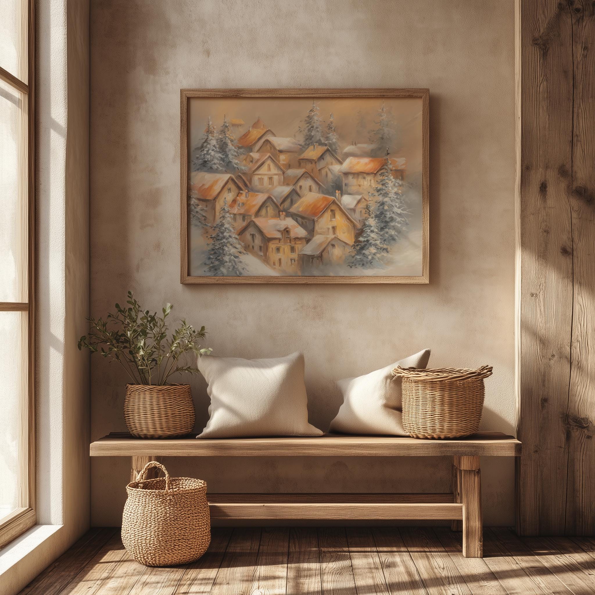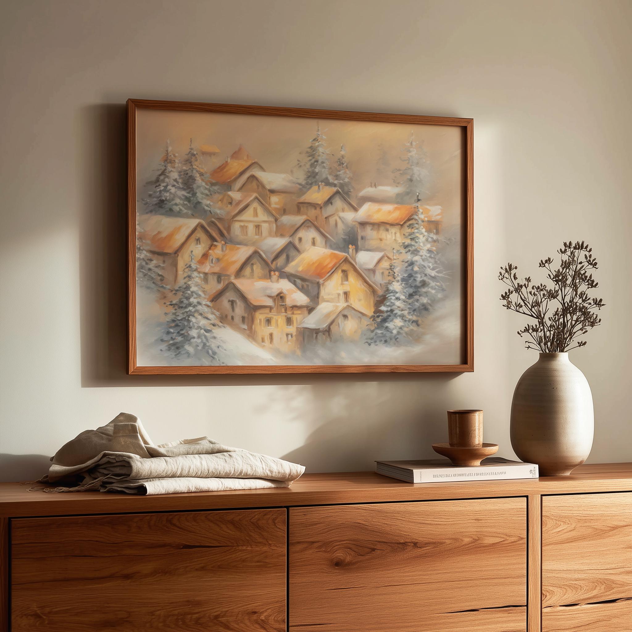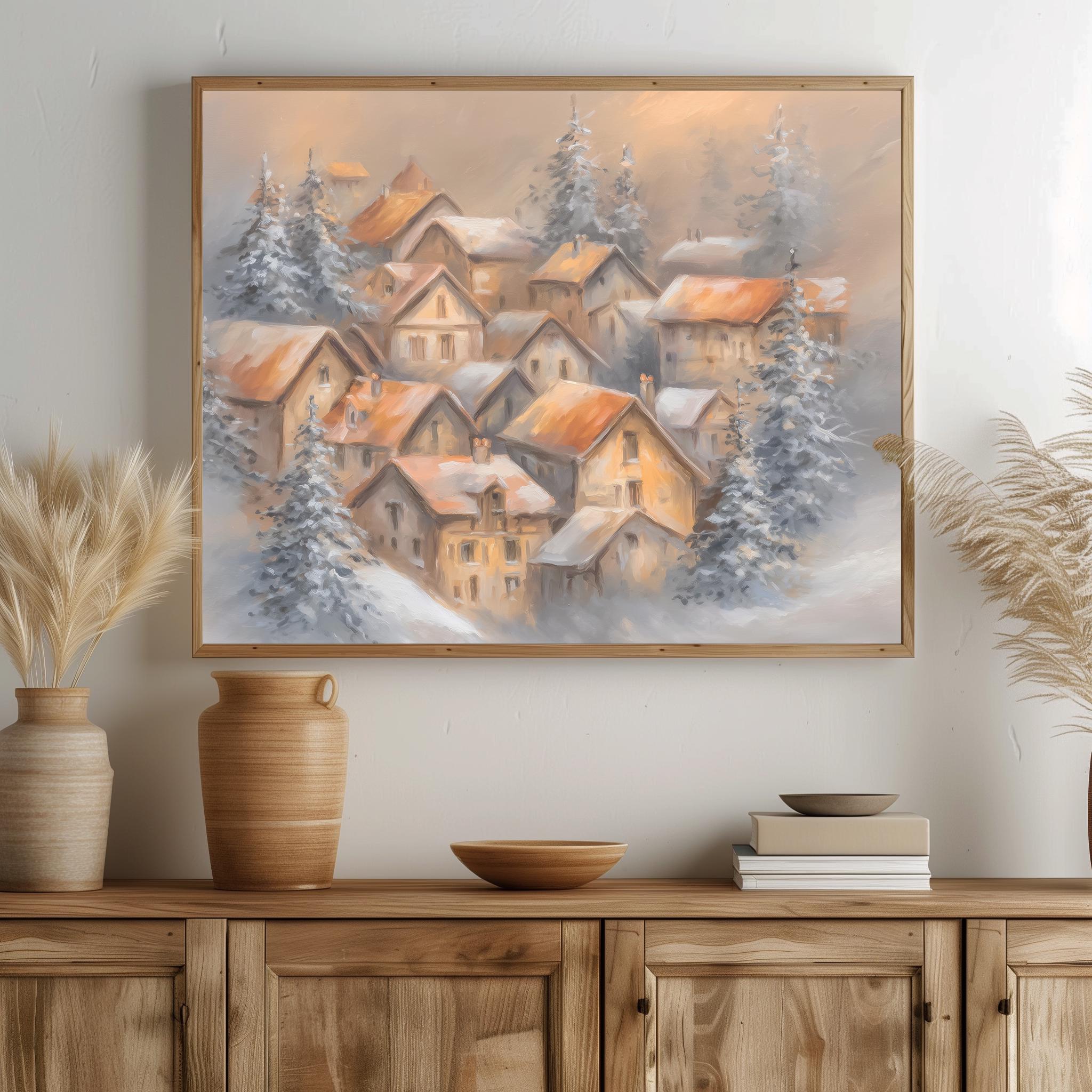 Immerse yourself in the charm with this rustic painting of a snowy mountain village. An instantly downloadable print, it's perfect for elevating your decor with budget-friendly charm. This gives you the flexibility to customize the size, frame, and material according to your personal taste and space, ensuring a perfect fit for your walls.