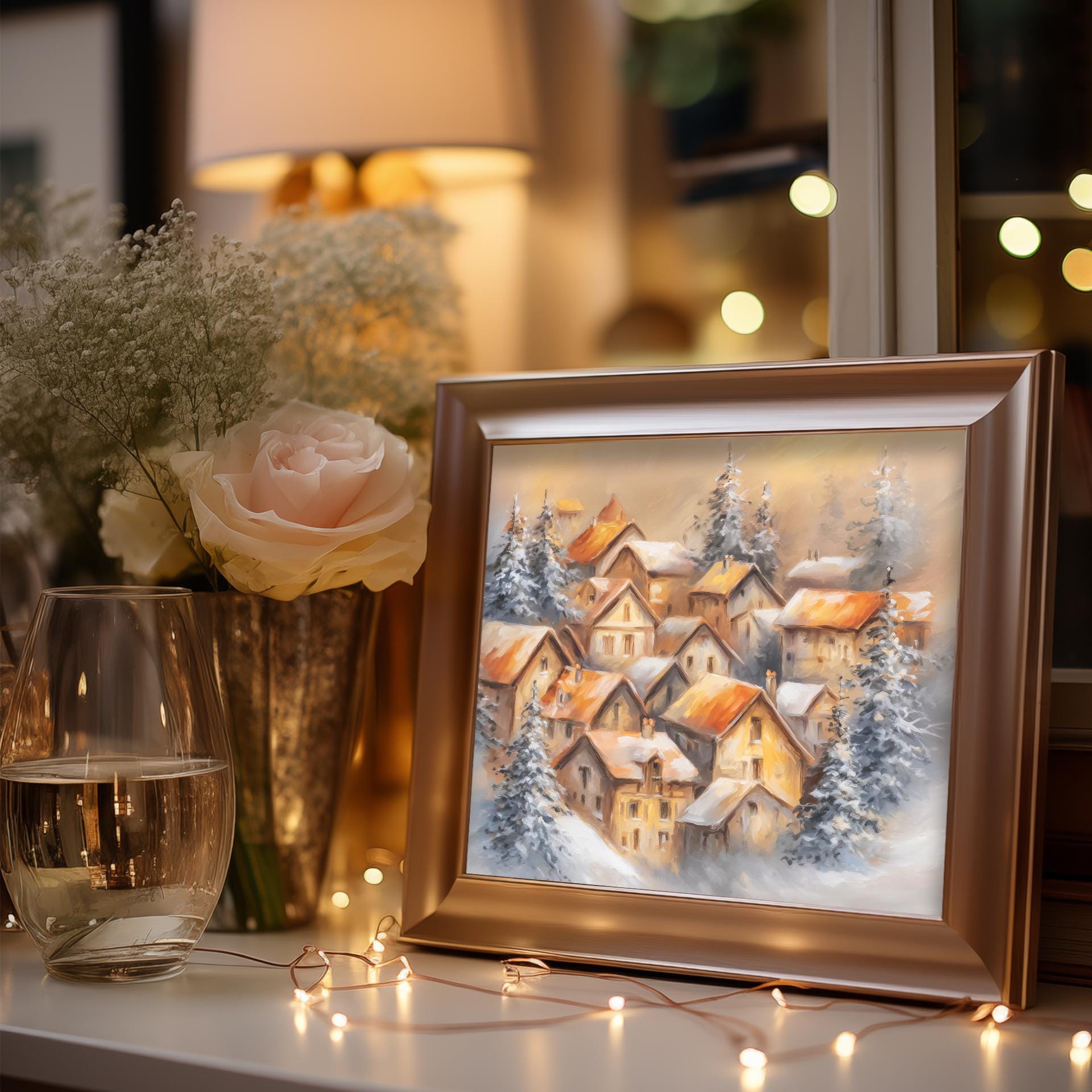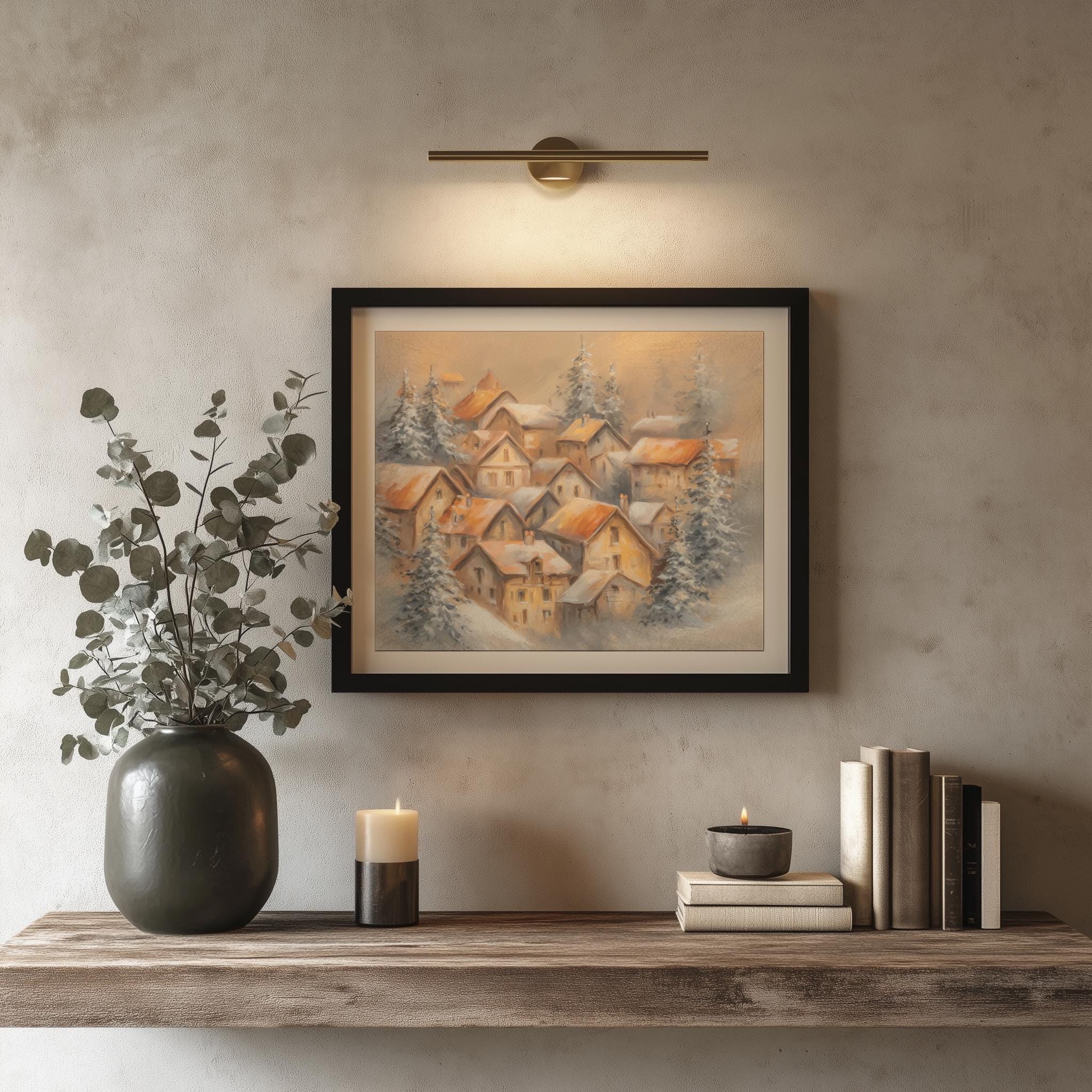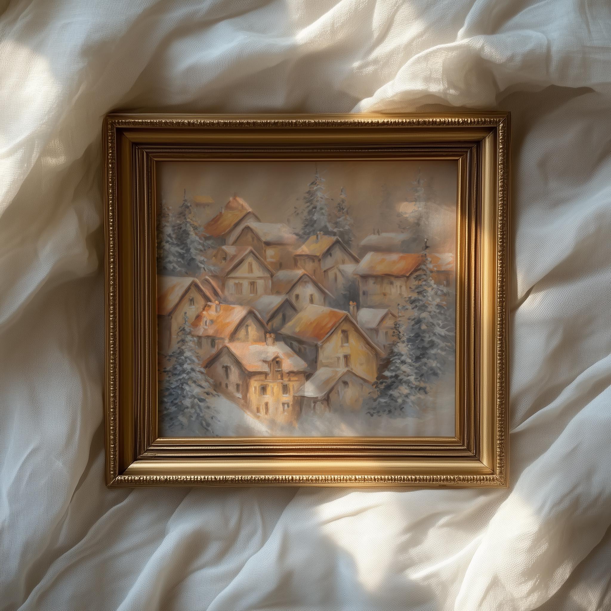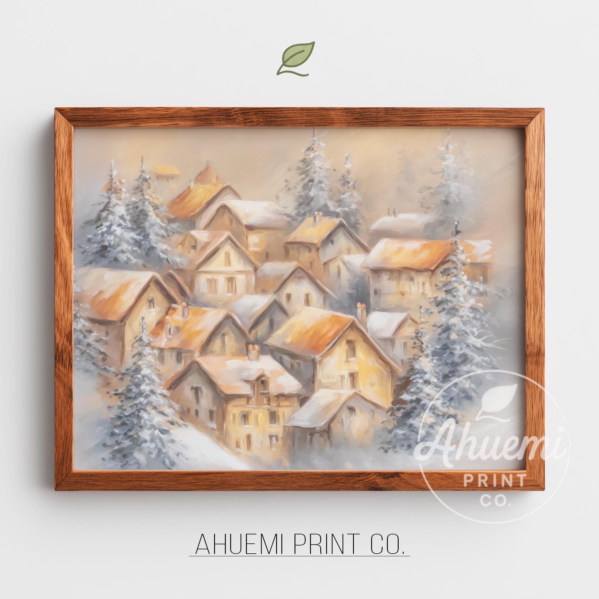 Immerse yourself in the charm with this rustic painting of a snowy mountain village. An instantly downloadable print, it's perfect for elevating your decor with budget-friendly charm. This gives you the flexibility to customize the size, frame, and material according to your personal taste and space, ensuring a perfect fit for your walls.
