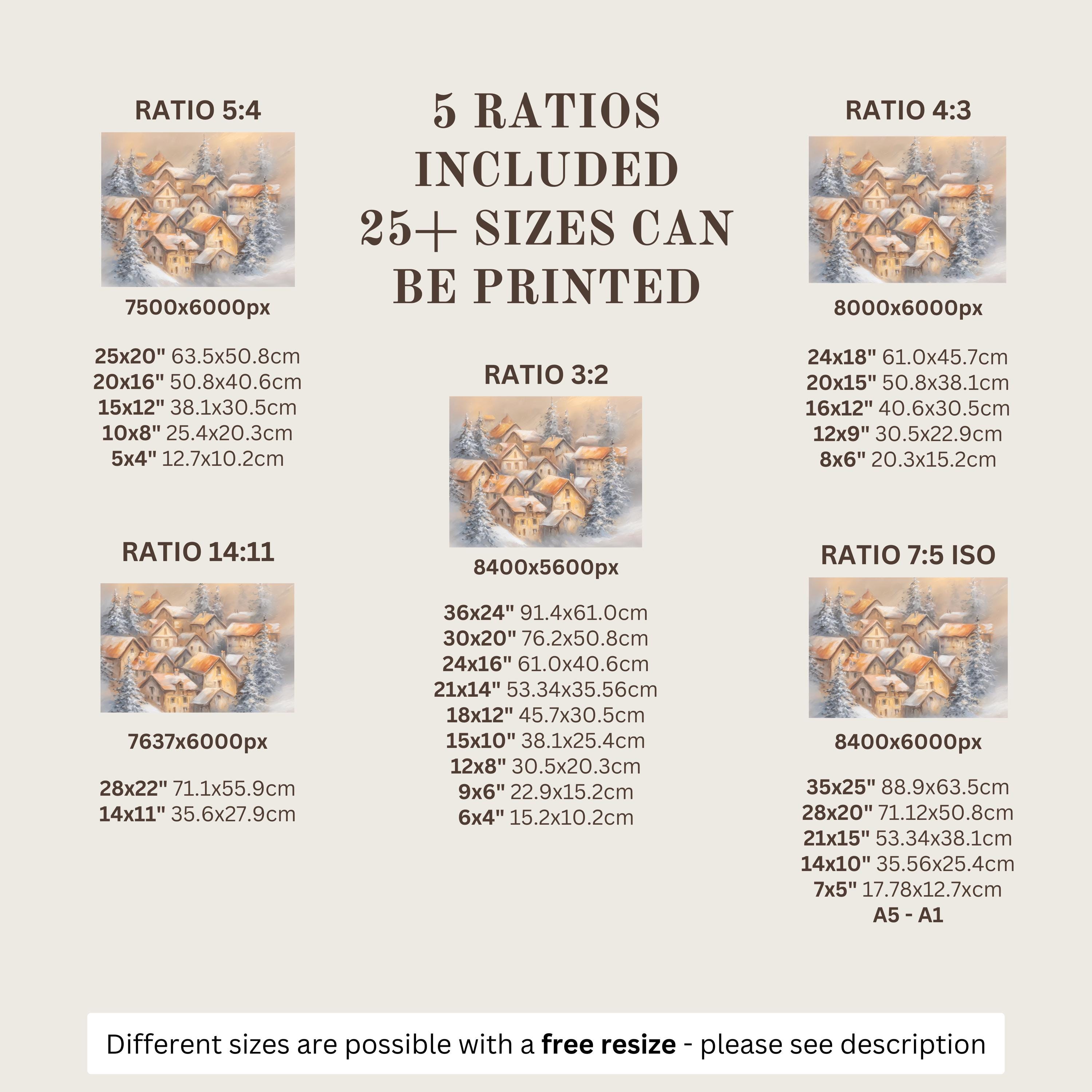 Each artwork includes 5 aspect ratios with 25+ print sizes. Most standard frames are covered. One custom resize per purchase available—message before ordering.