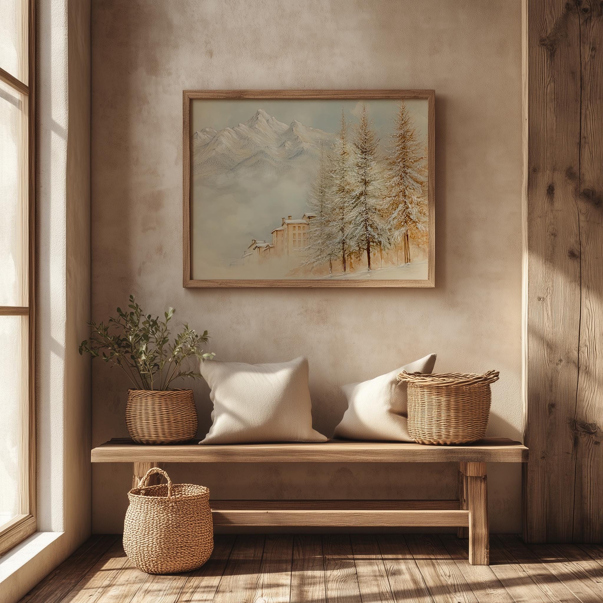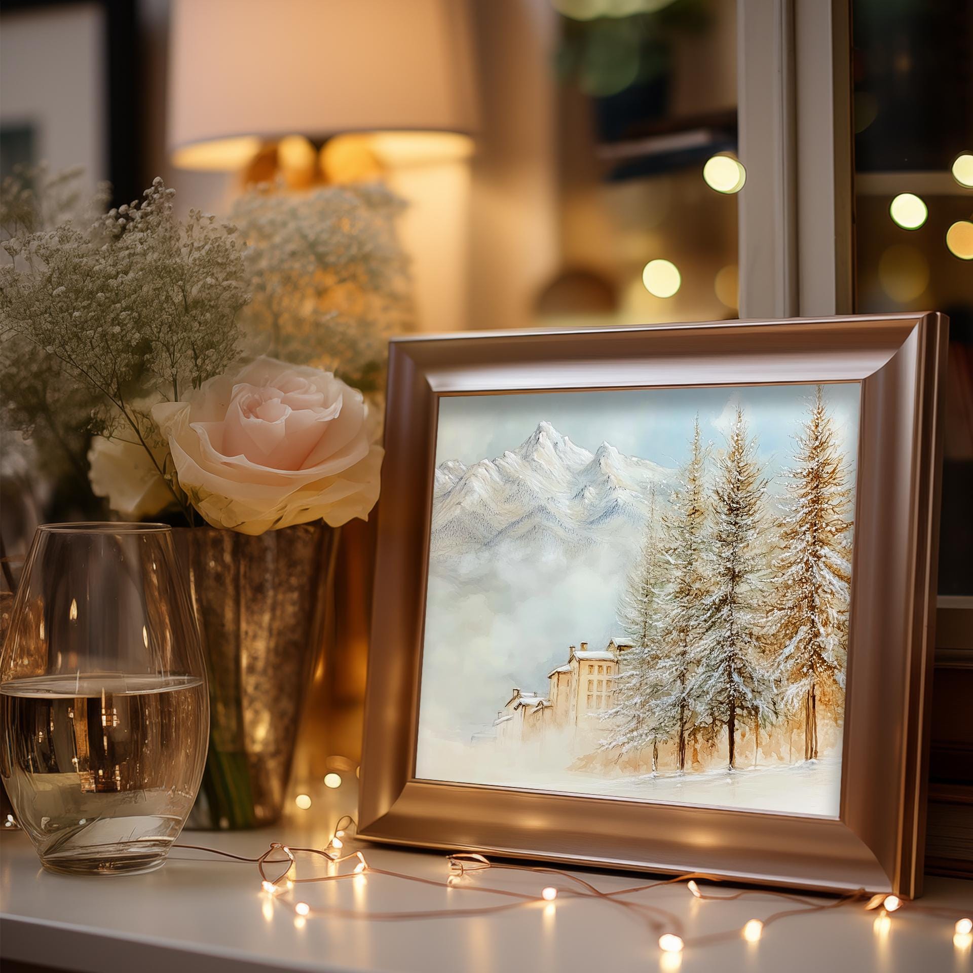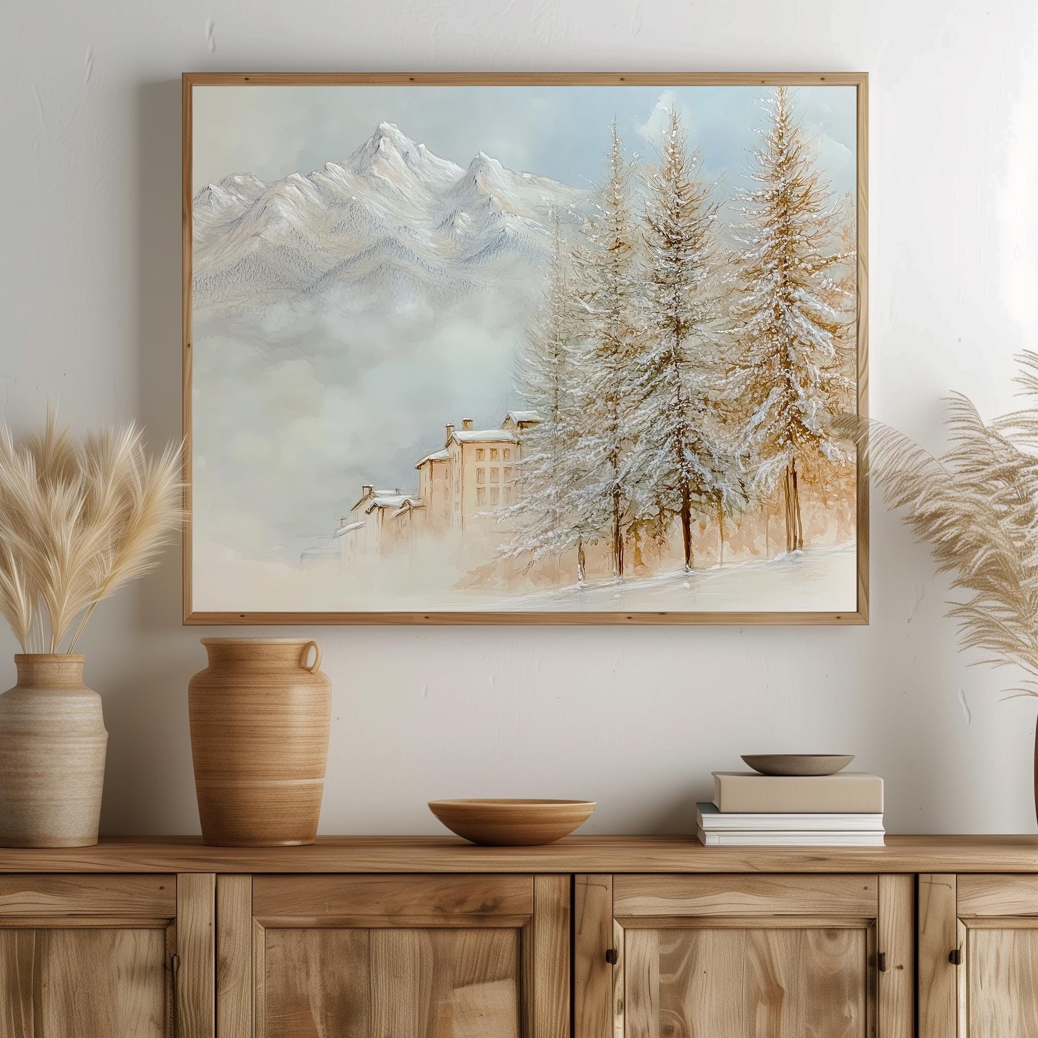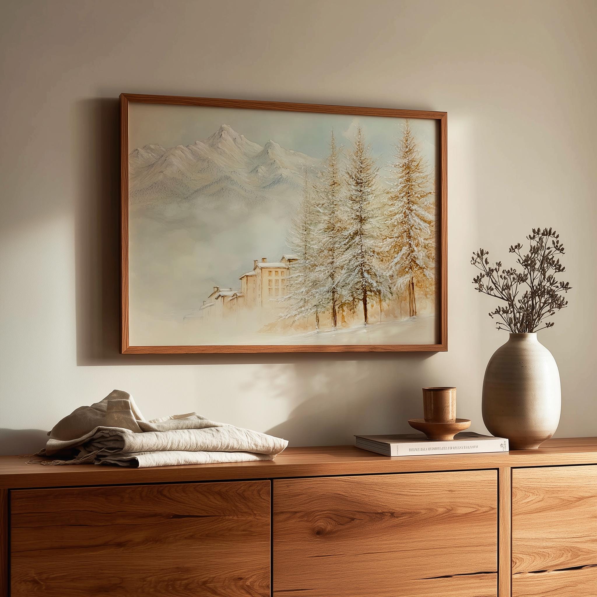 Immerse yourself in the charm with this rustic painting of a cozy winter village nestled among misty pines. An instantly downloadable print, it's perfect for elevating your decor with budget-friendly charm. This gives you the flexibility to customize the size, frame, and material according to your personal taste and space, ensuring a perfect fit for your walls.