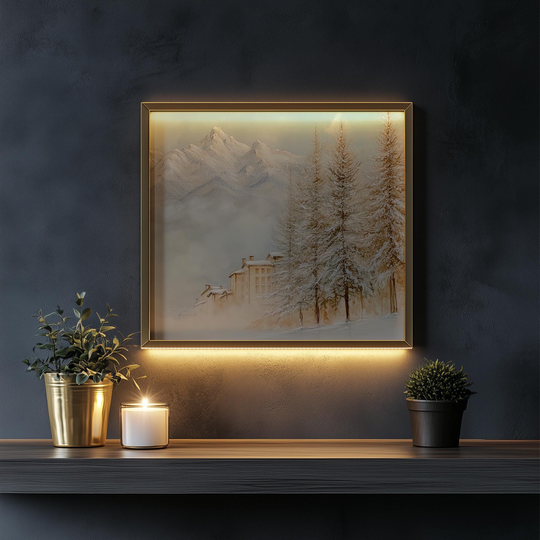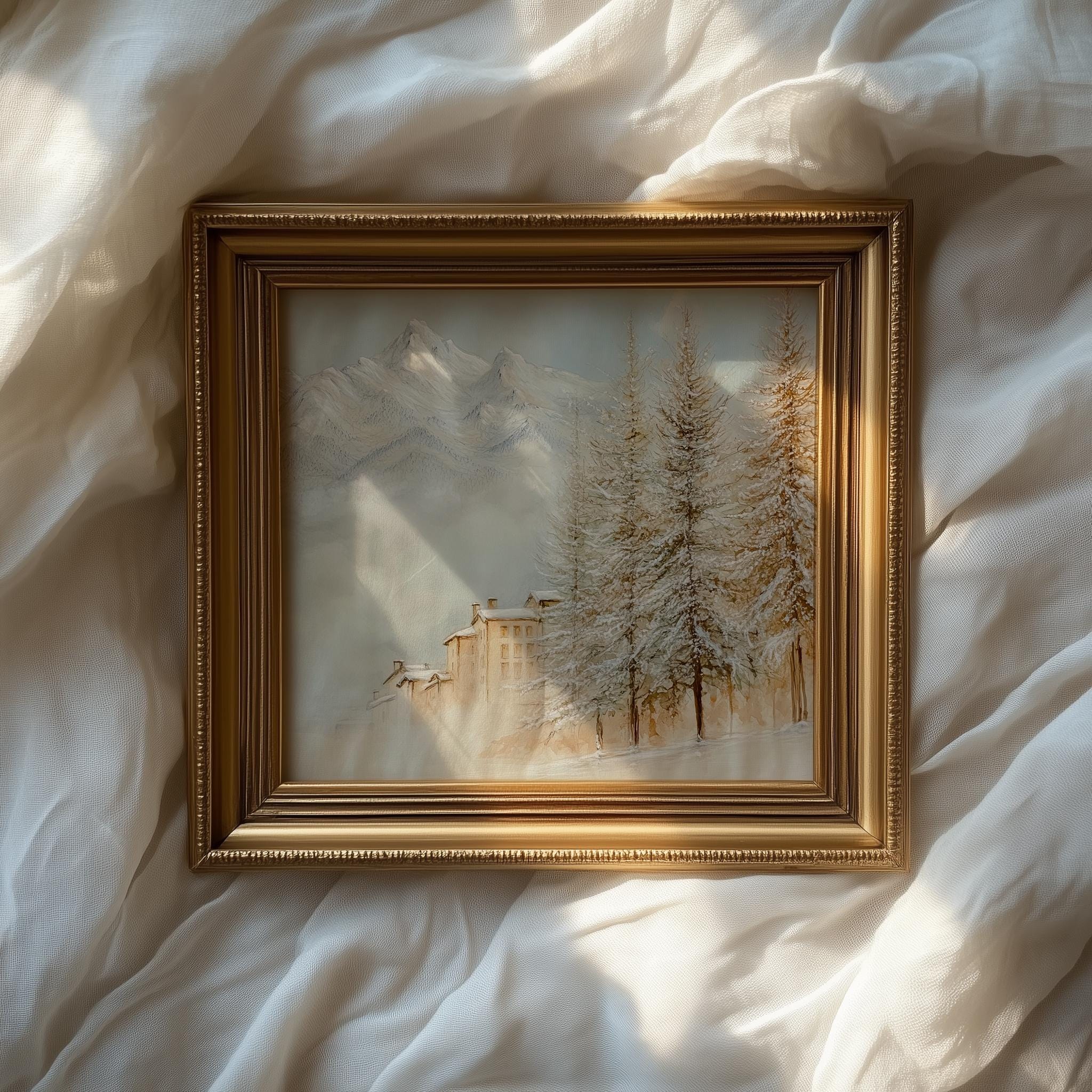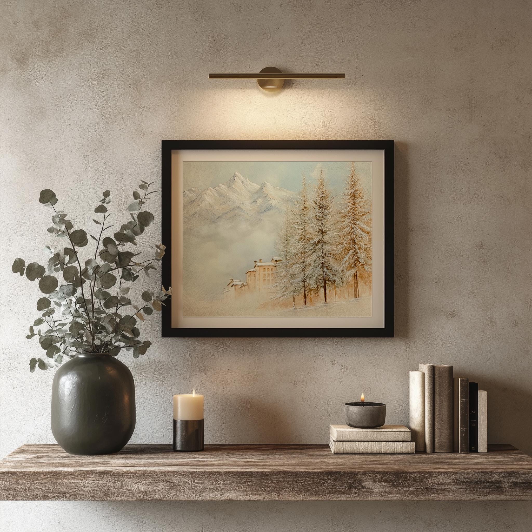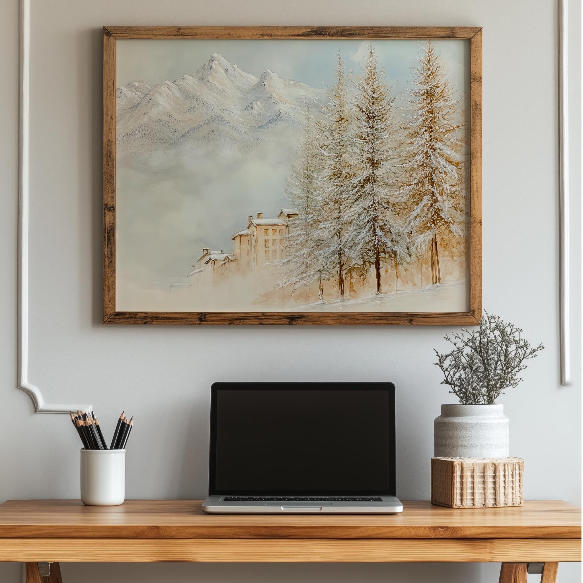 Immerse yourself in the charm with this rustic painting of a cozy winter village nestled among misty pines. An instantly downloadable print, it's perfect for elevating your decor with budget-friendly charm. This gives you the flexibility to customize the size, frame, and material according to your personal taste and space, ensuring a perfect fit for your walls.