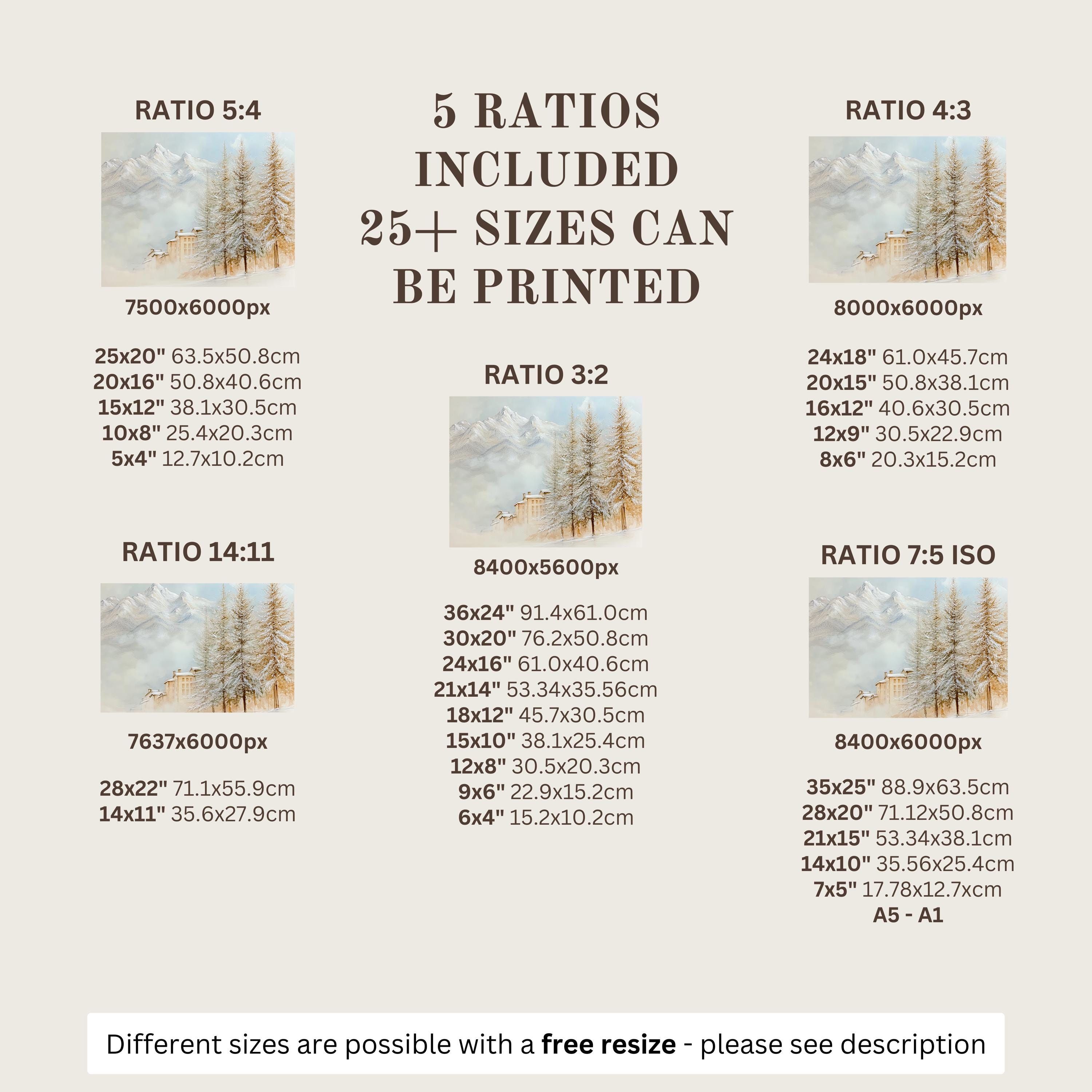 Each artwork includes 5 aspect ratios with 25+ print sizes. Most standard frames are covered. One custom resize per purchase available—message before ordering.