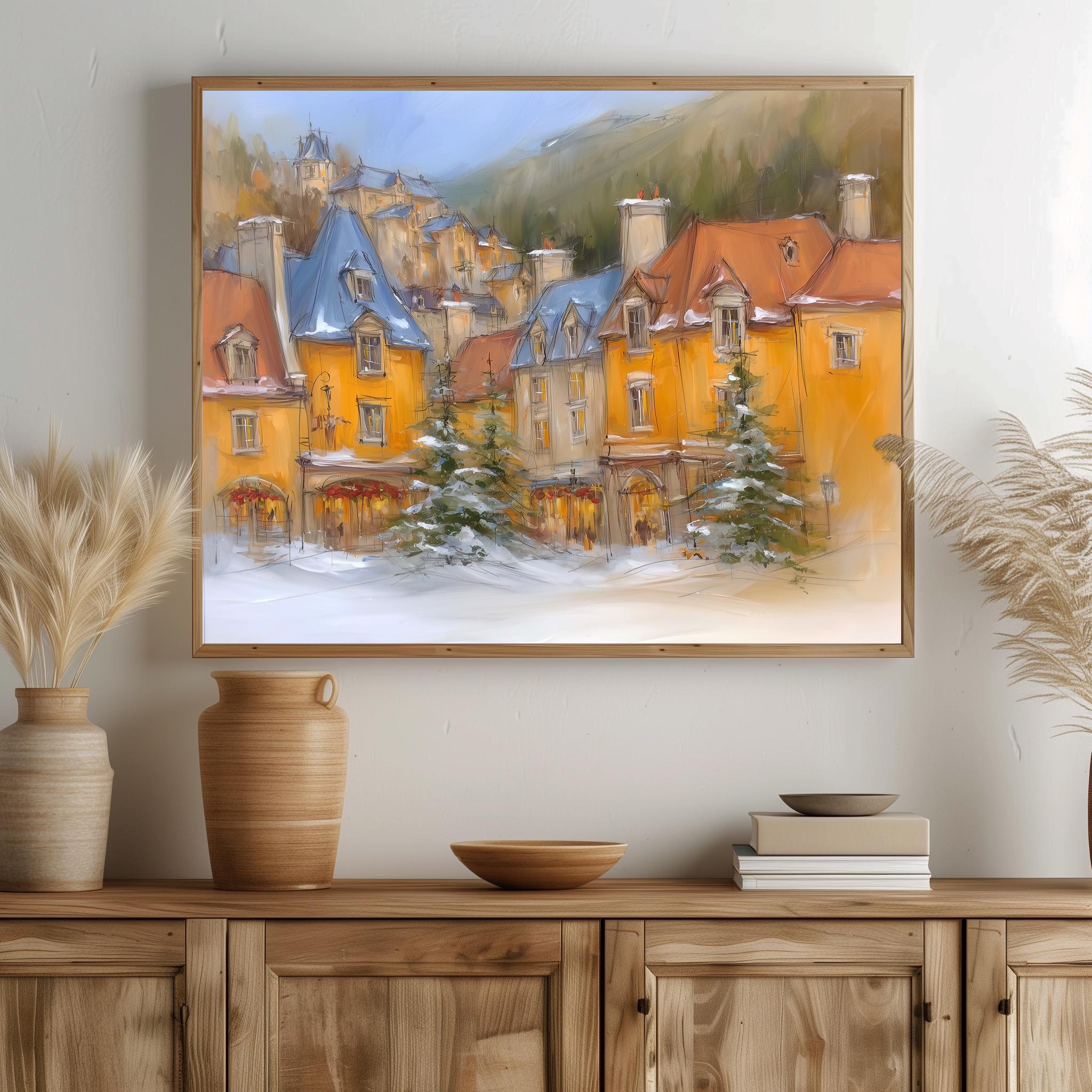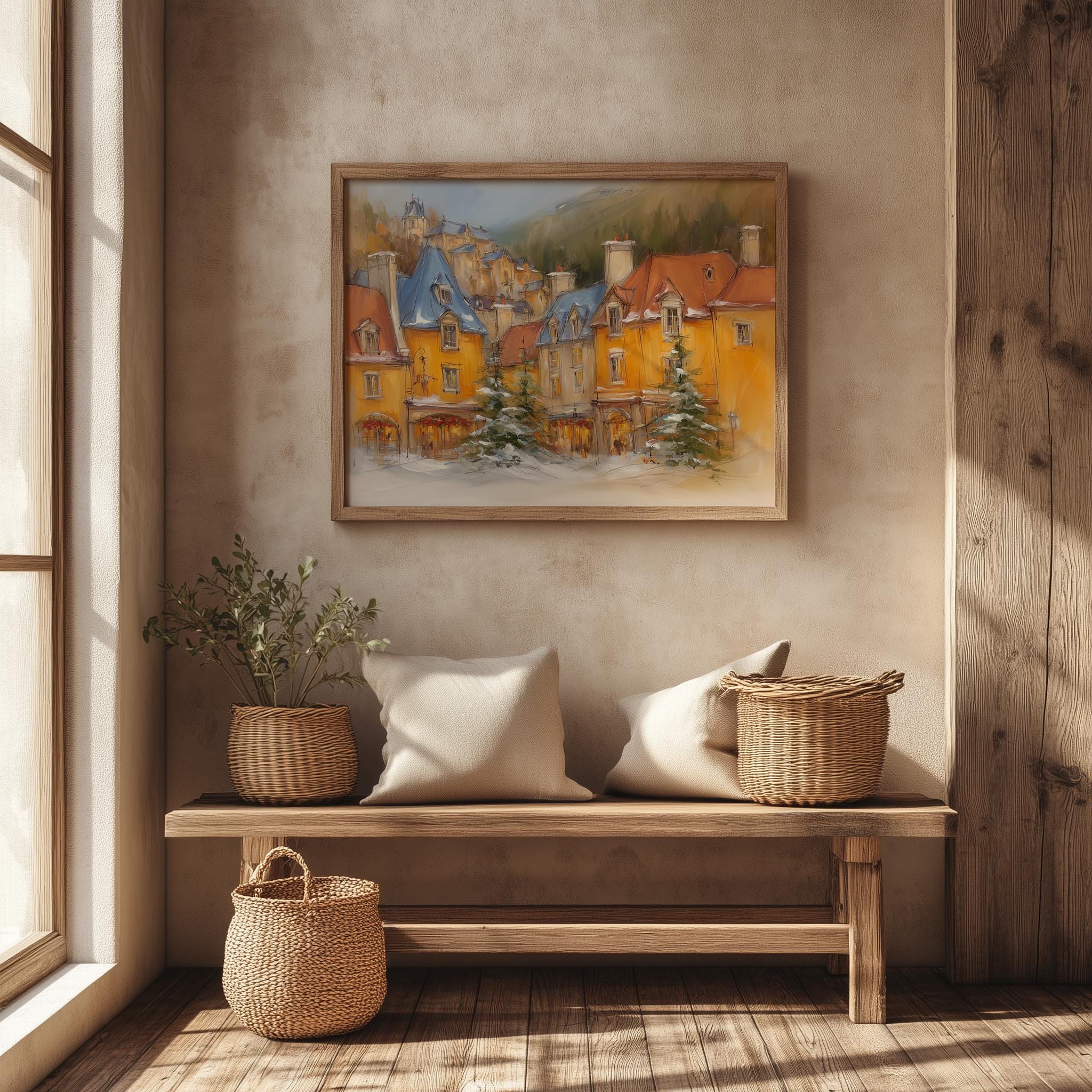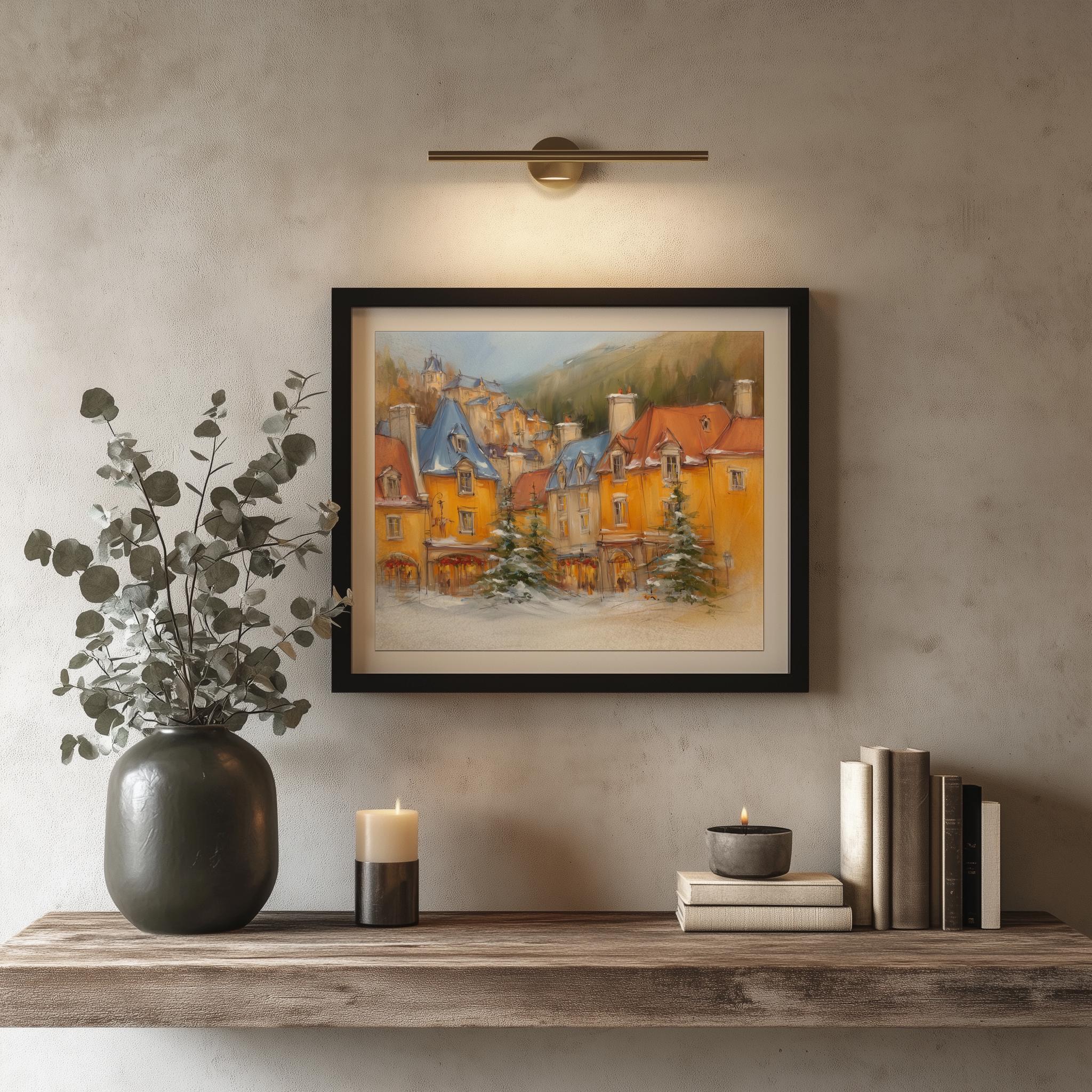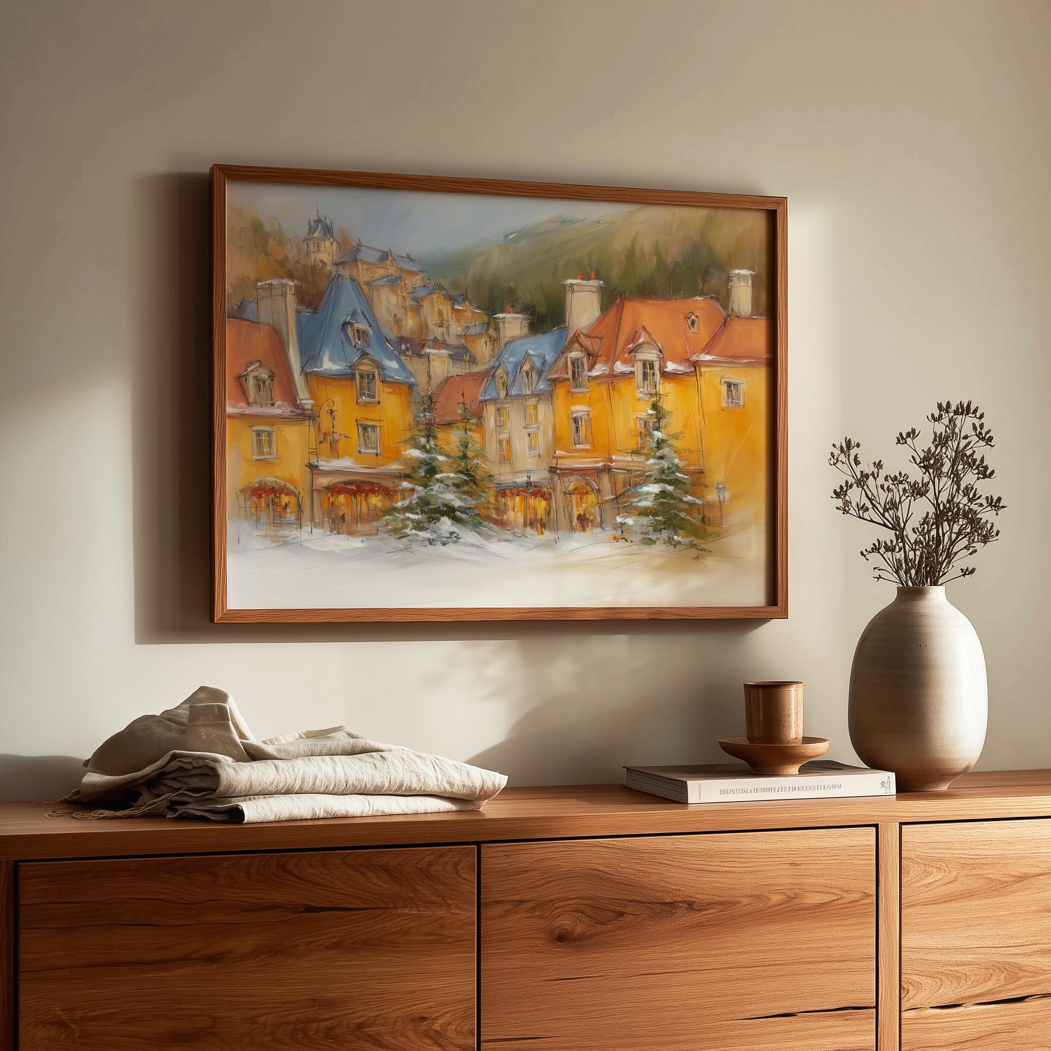 Immerse yourself in the charm with this rustic painting of a cozy winter village nestled among foggy mountains. An instantly downloadable print, it's perfect for elevating your decor with budget-friendly charm. This gives you the flexibility to customize the size, frame, and material according to your personal taste and space, ensuring a perfect fit for your walls.
