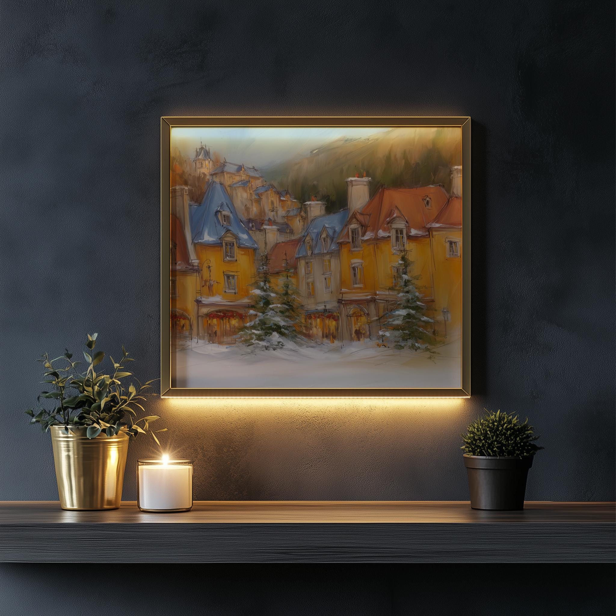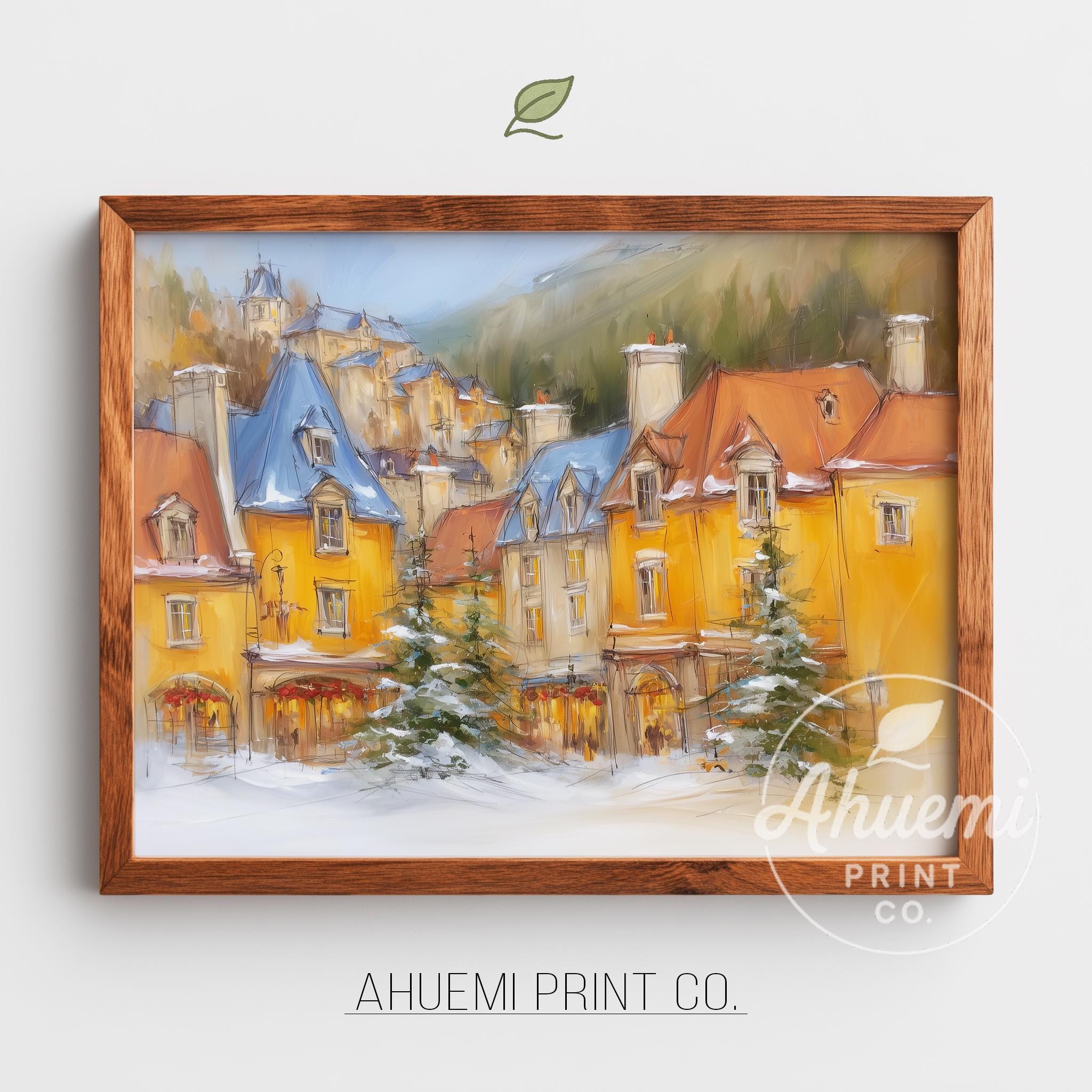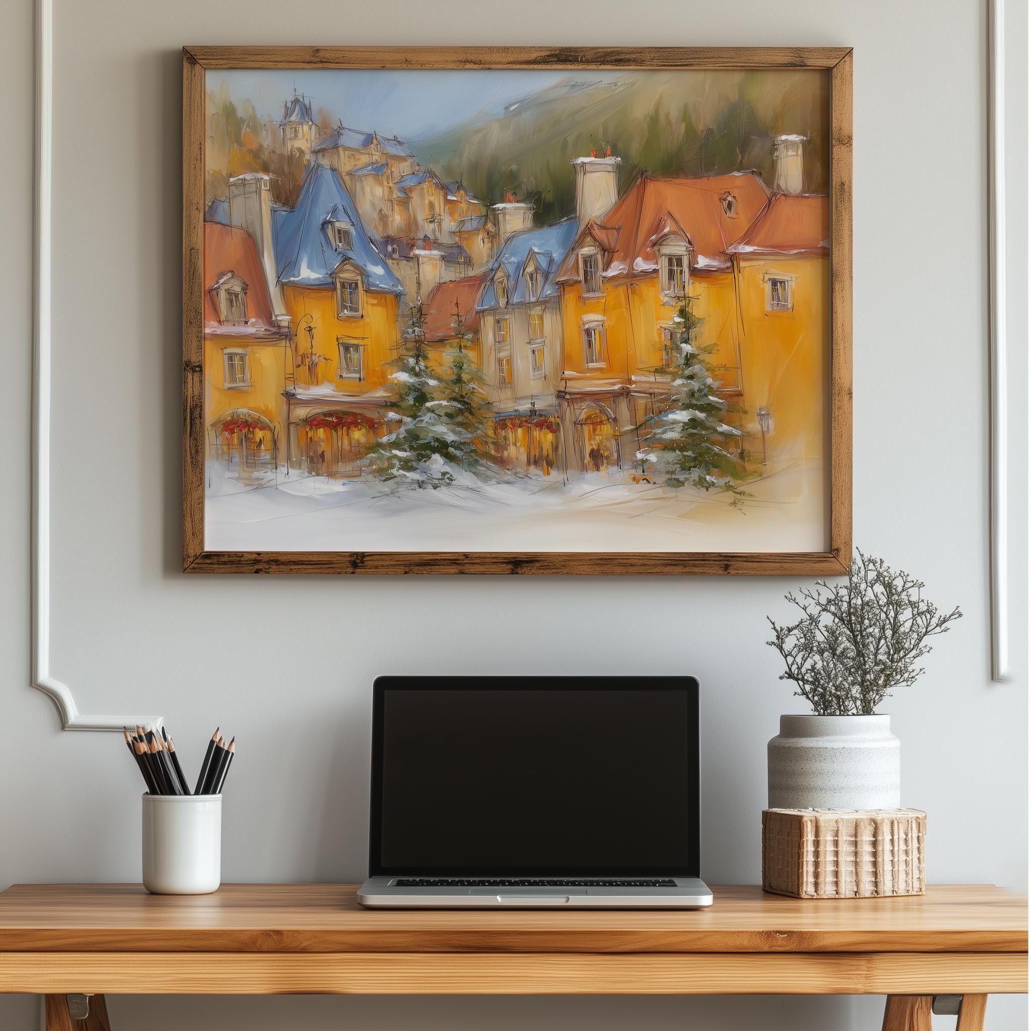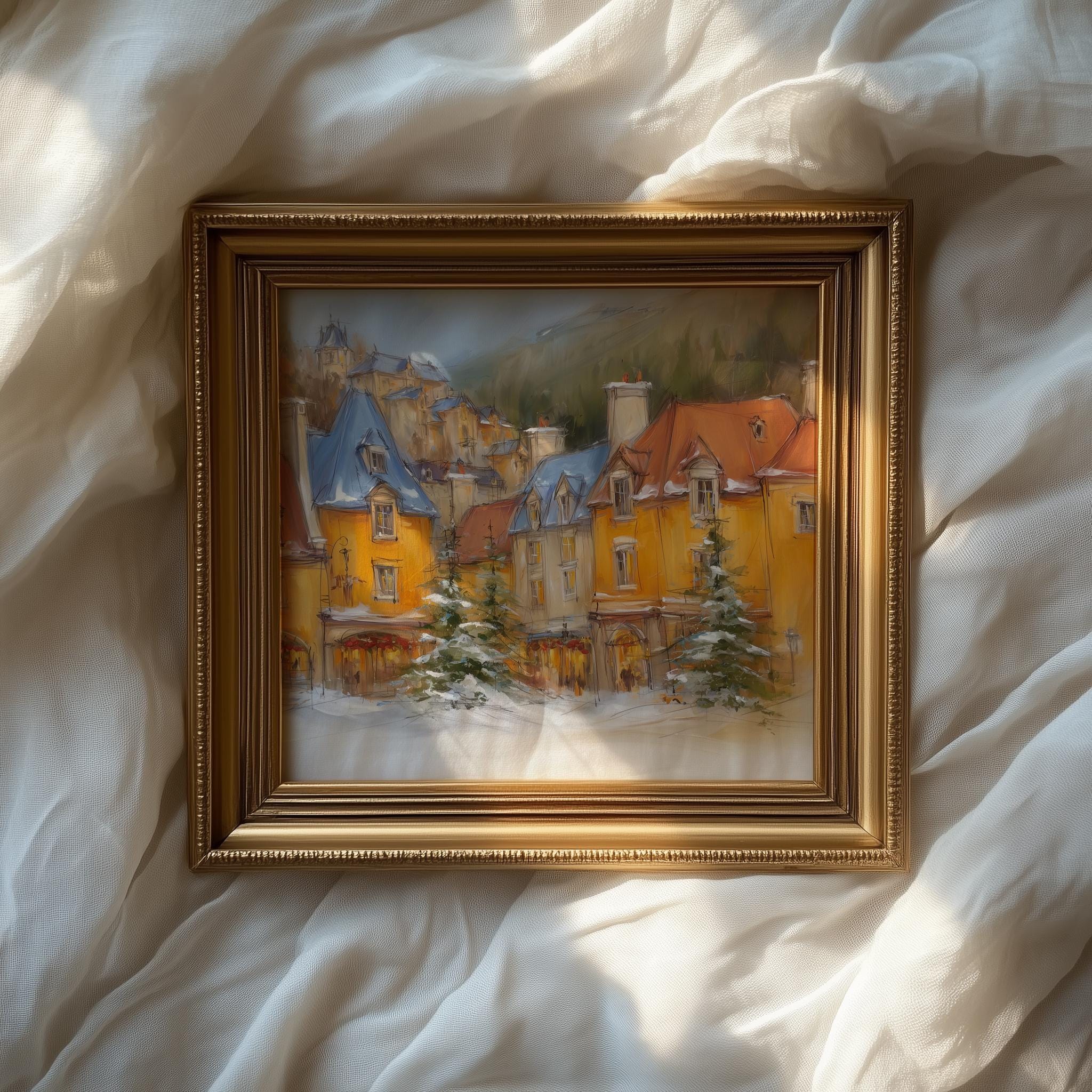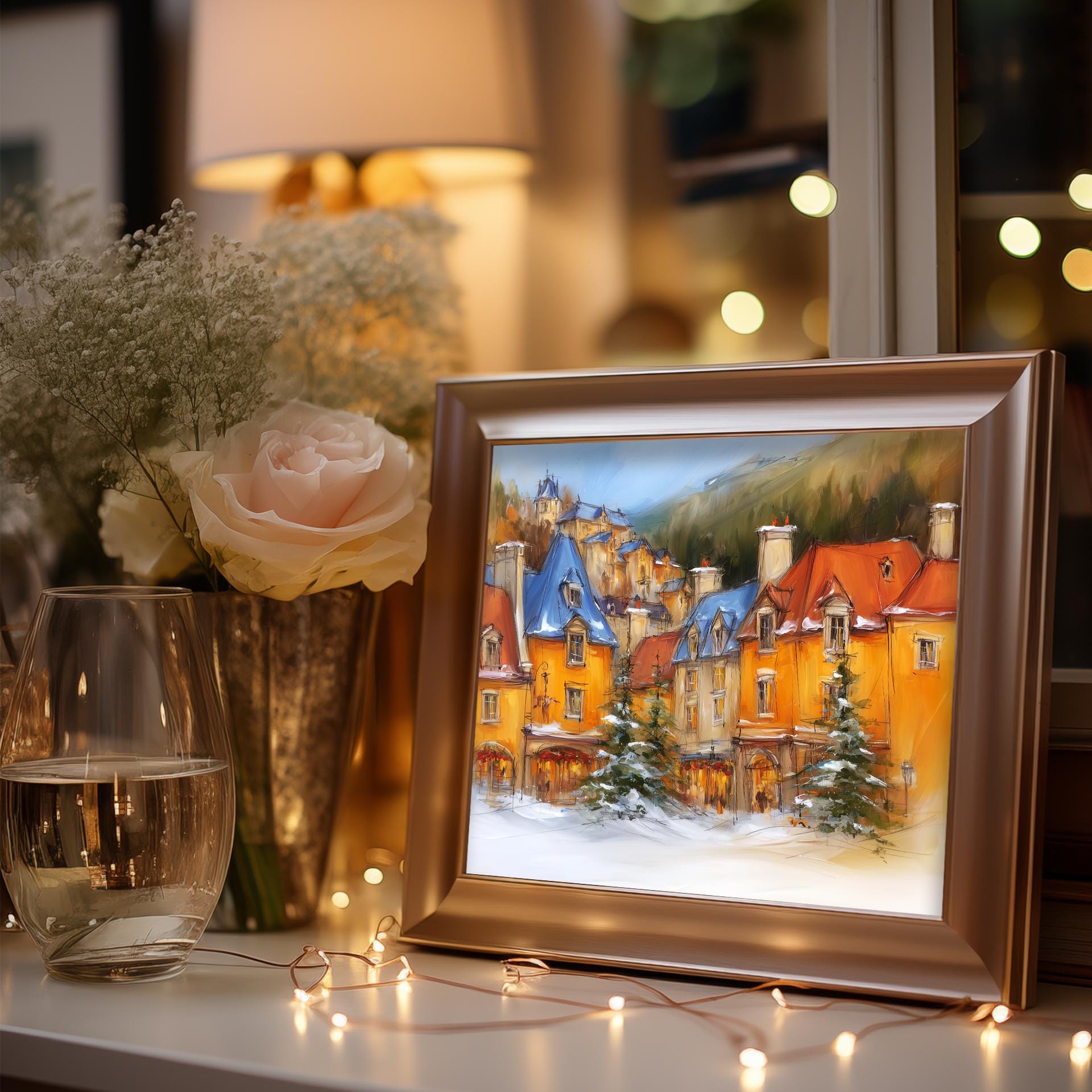 Immerse yourself in the charm with this rustic painting of a cozy winter village nestled among foggy mountains. An instantly downloadable print, it's perfect for elevating your decor with budget-friendly charm. This gives you the flexibility to customize the size, frame, and material according to your personal taste and space, ensuring a perfect fit for your walls.