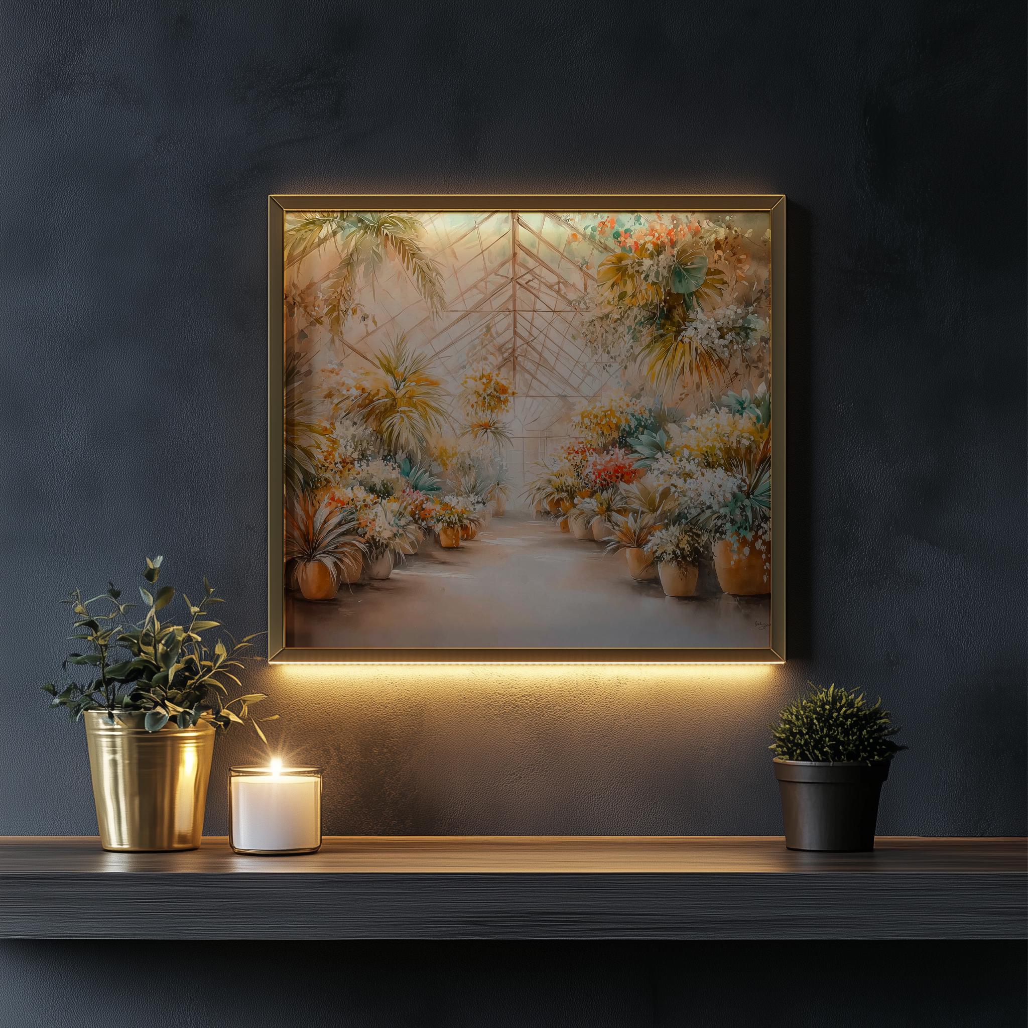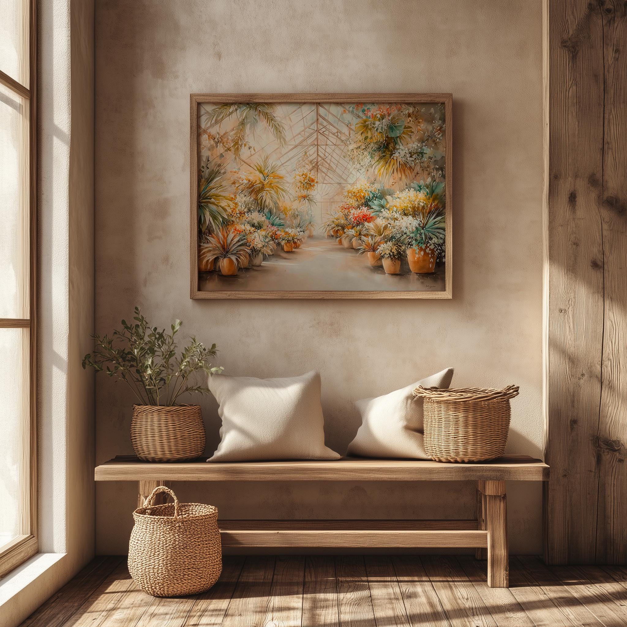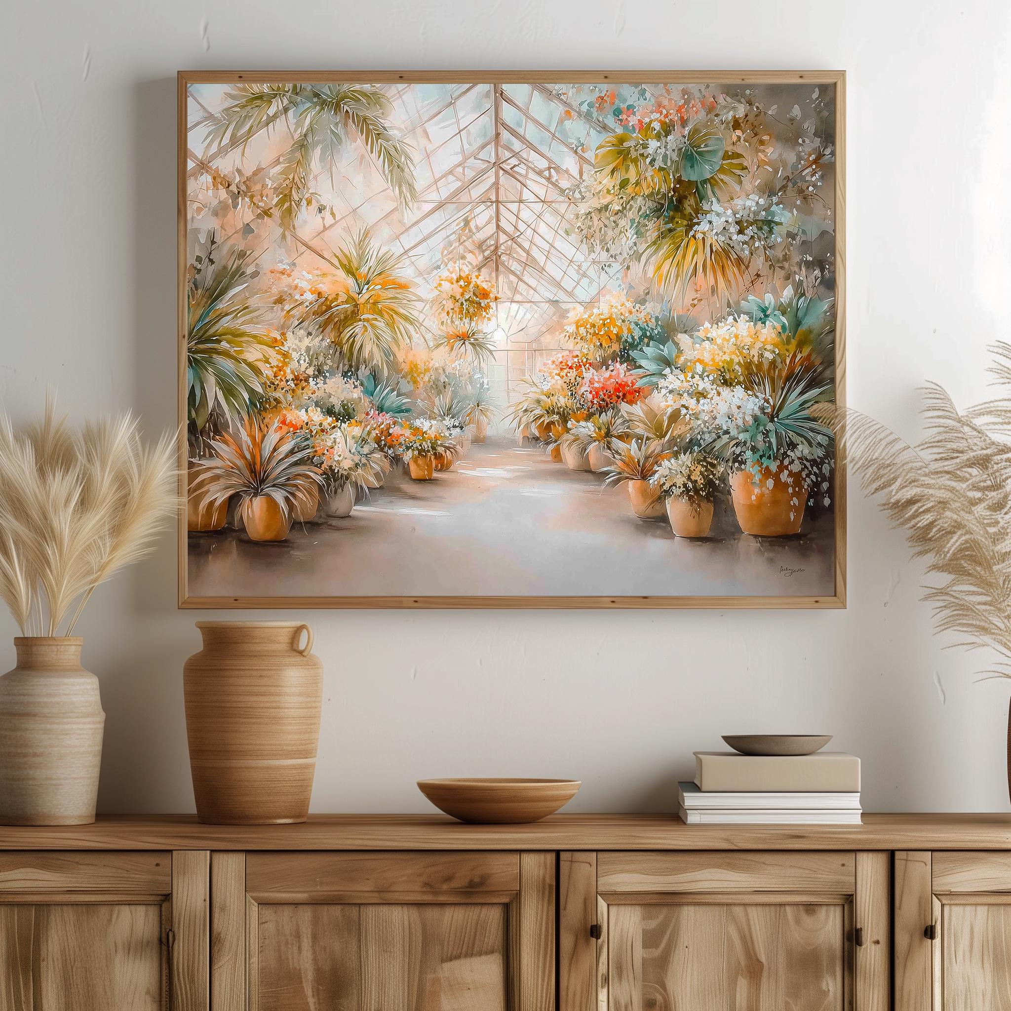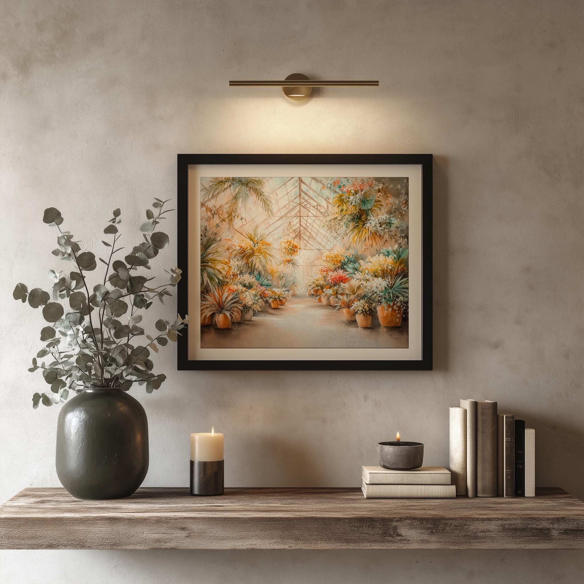 Immerse yourself in the charm with this rustic painting of a lush tropical greenhouse filled with vibrant watercolor plants. An instantly downloadable print, it's perfect for elevating your decor with budget-friendly charm. This gives you the flexibility to customize the size, frame, and material according to your personal taste and space, ensuring a perfect fit for your walls.