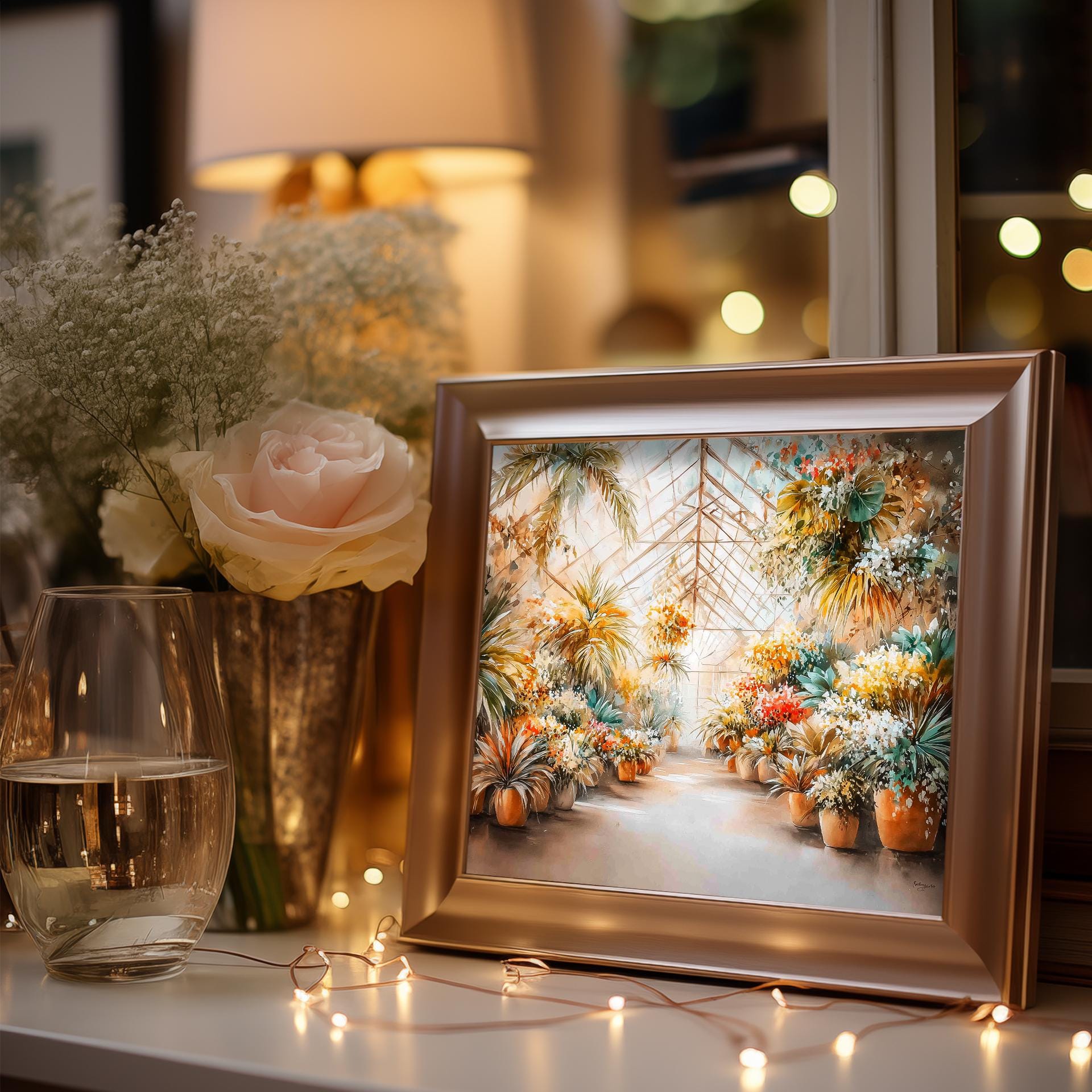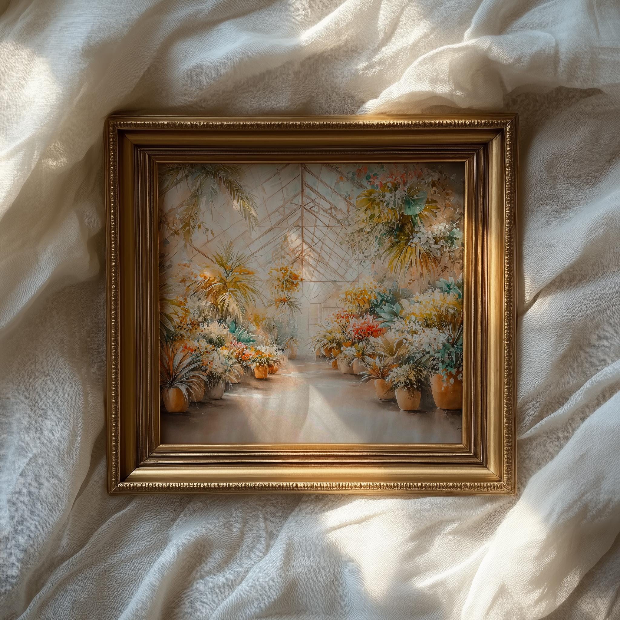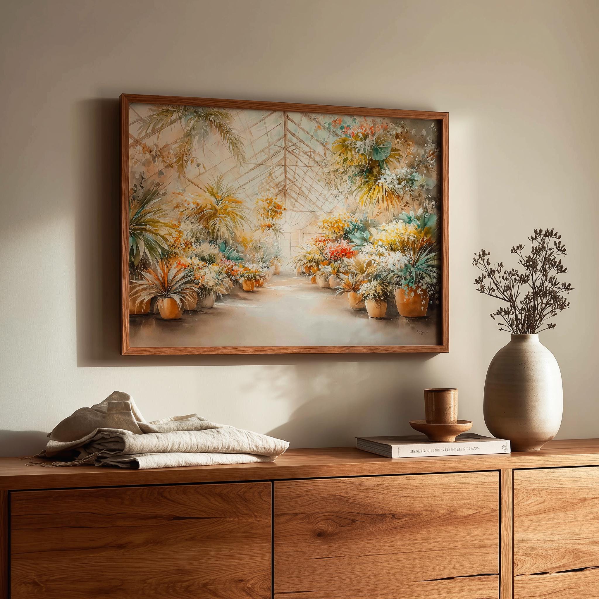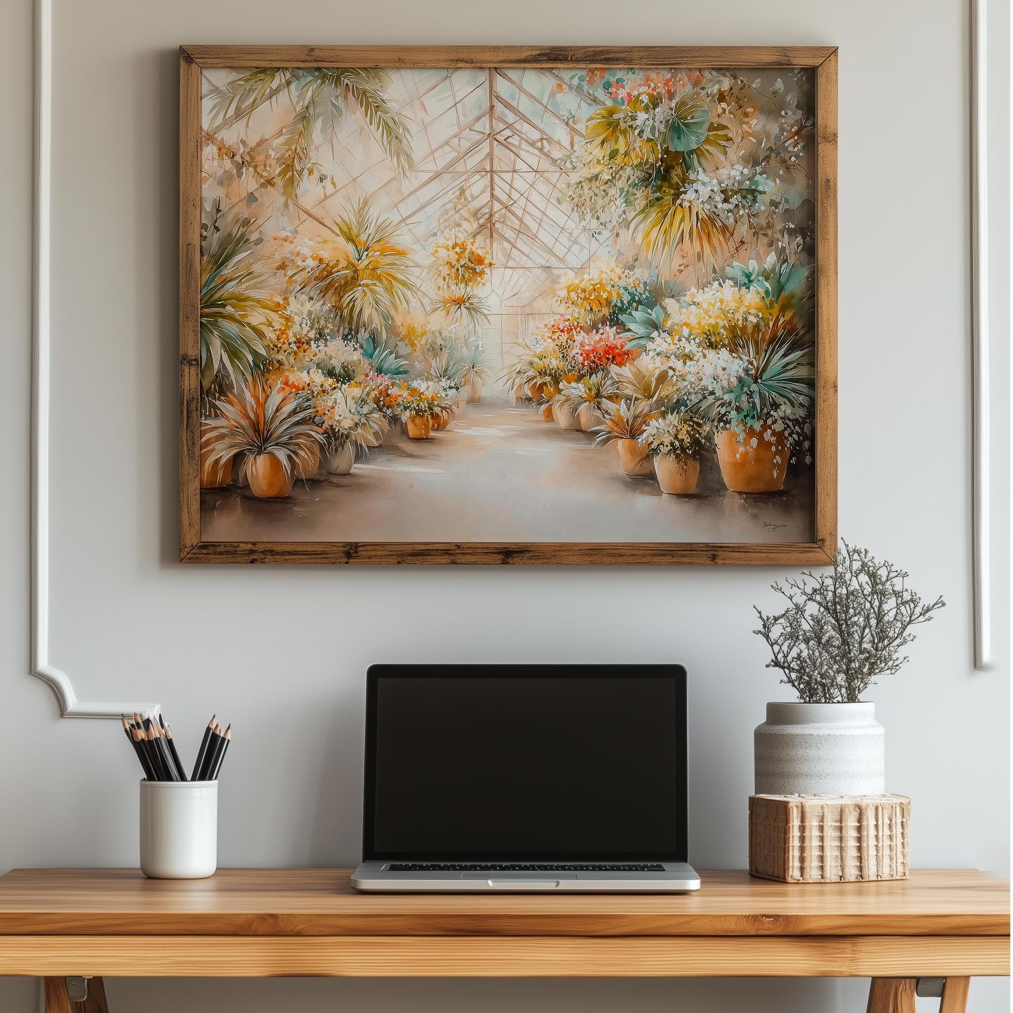 Immerse yourself in the charm with this rustic painting of a lush tropical greenhouse filled with vibrant watercolor plants. An instantly downloadable print, it's perfect for elevating your decor with budget-friendly charm. This gives you the flexibility to customize the size, frame, and material according to your personal taste and space, ensuring a perfect fit for your walls.