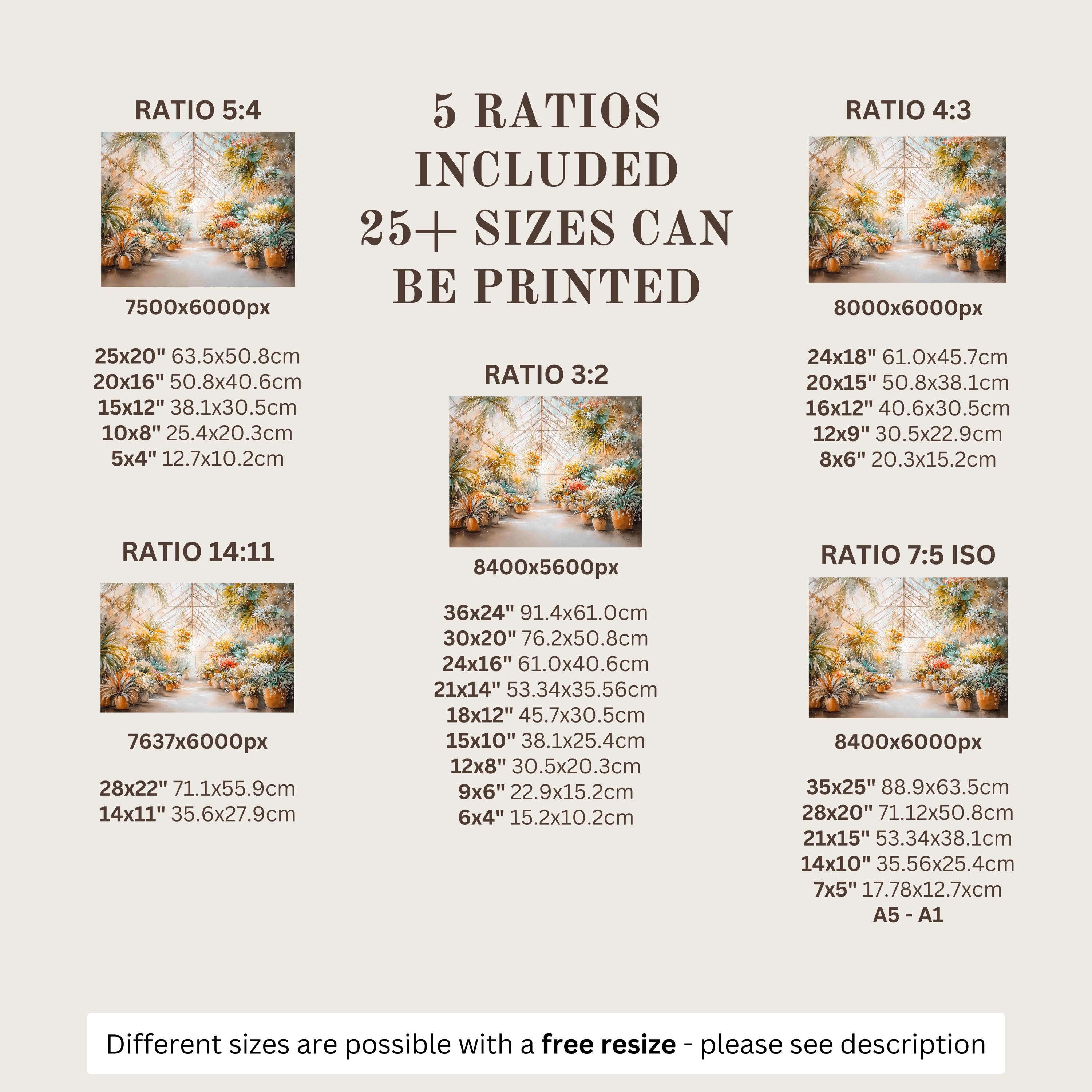Each artwork includes 5 aspect ratios with 25+ print sizes. Most standard frames are covered. One custom resize per purchase available—message before ordering.