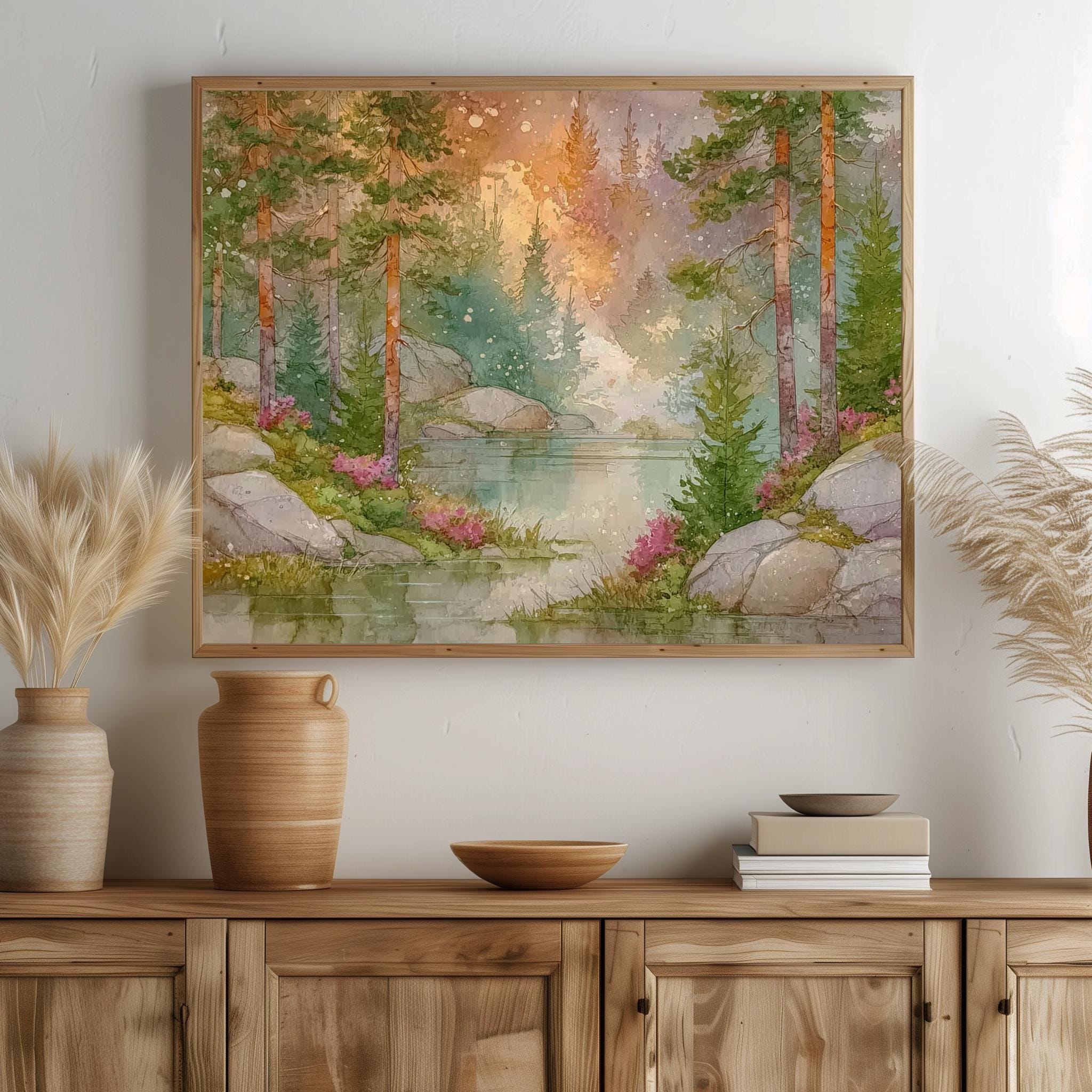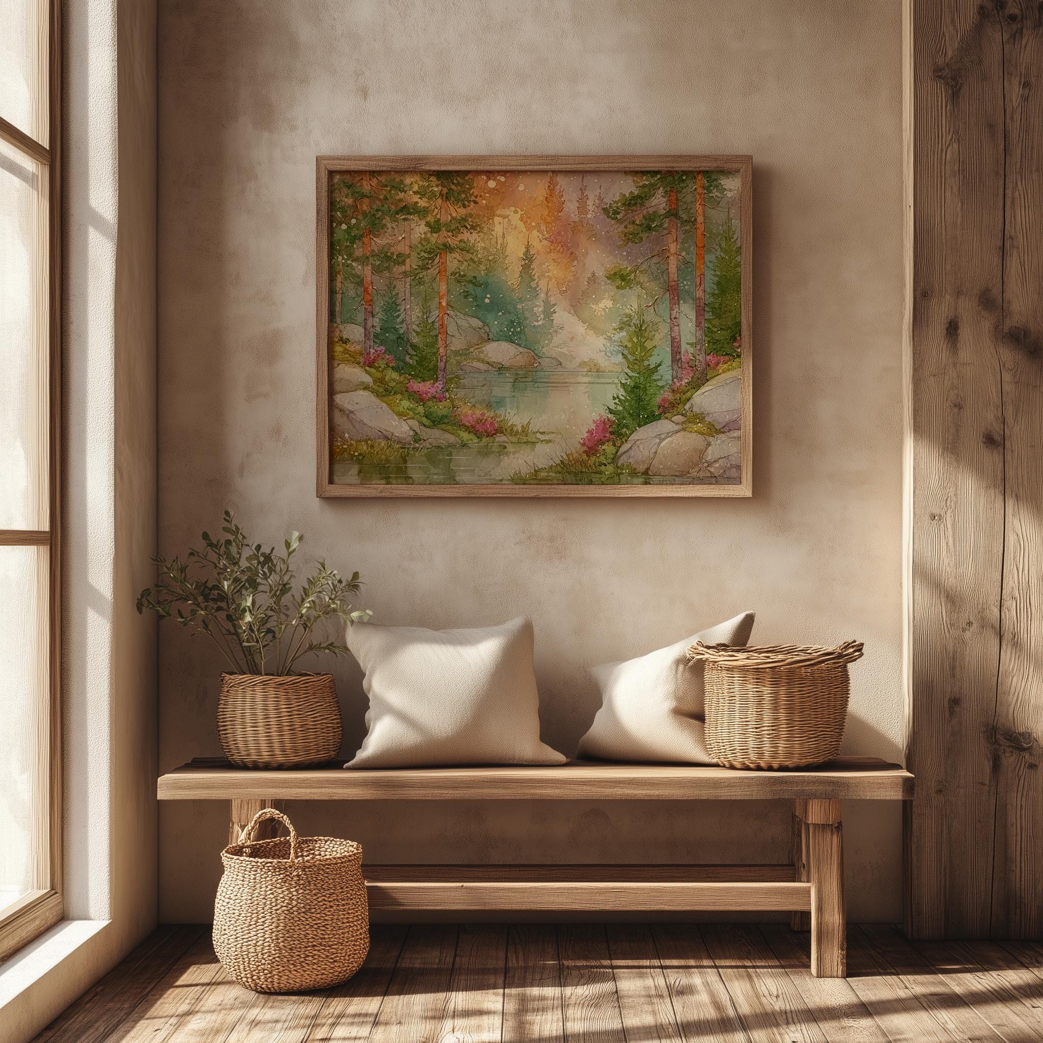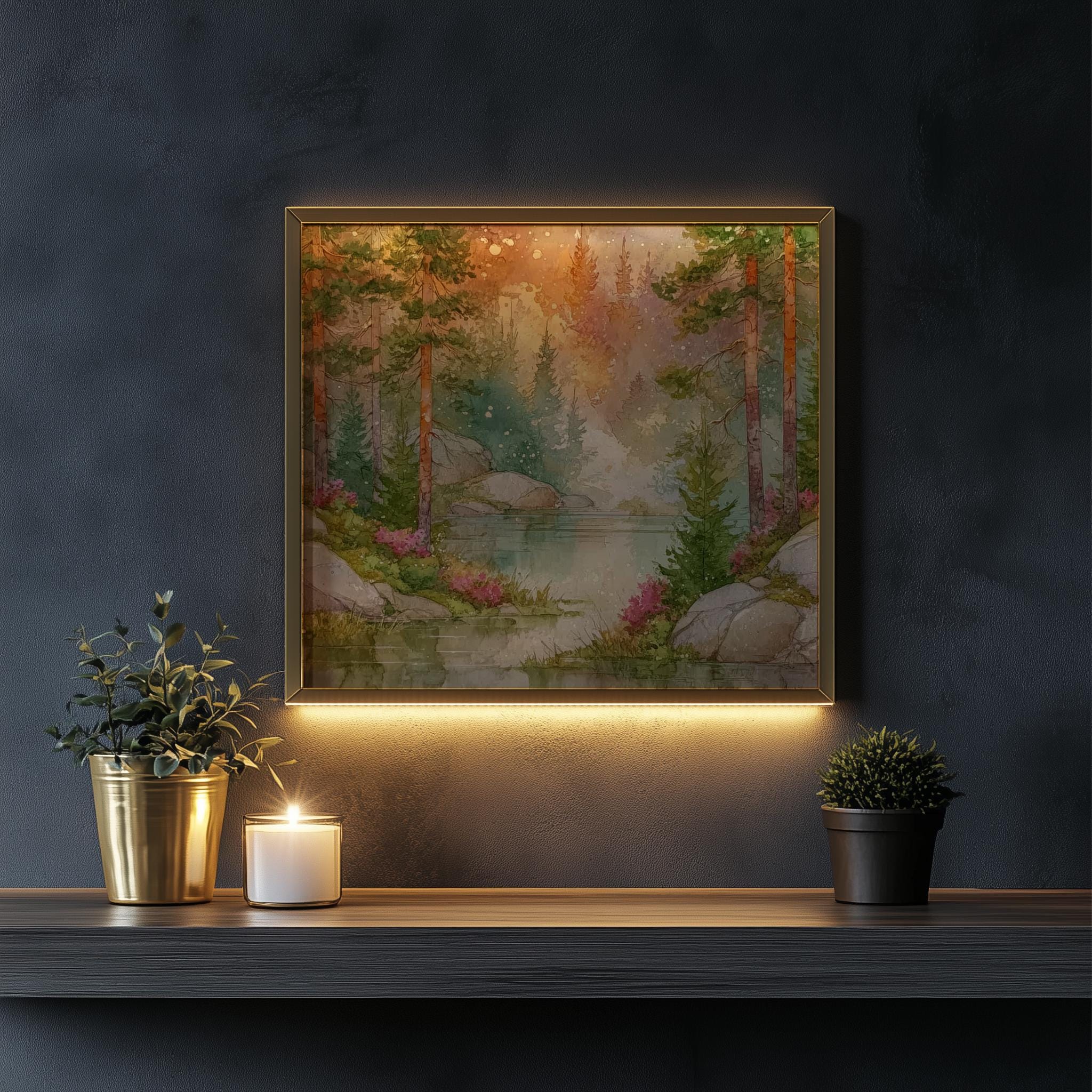 Immerse yourself in the charm with this rustic painting of a misty forest at dawn. An instantly downloadable print, it's perfect for elevating your decor with budget-friendly charm. This gives you the flexibility to customize the size, frame, and material according to your personal taste and space, ensuring a perfect fit for your walls.