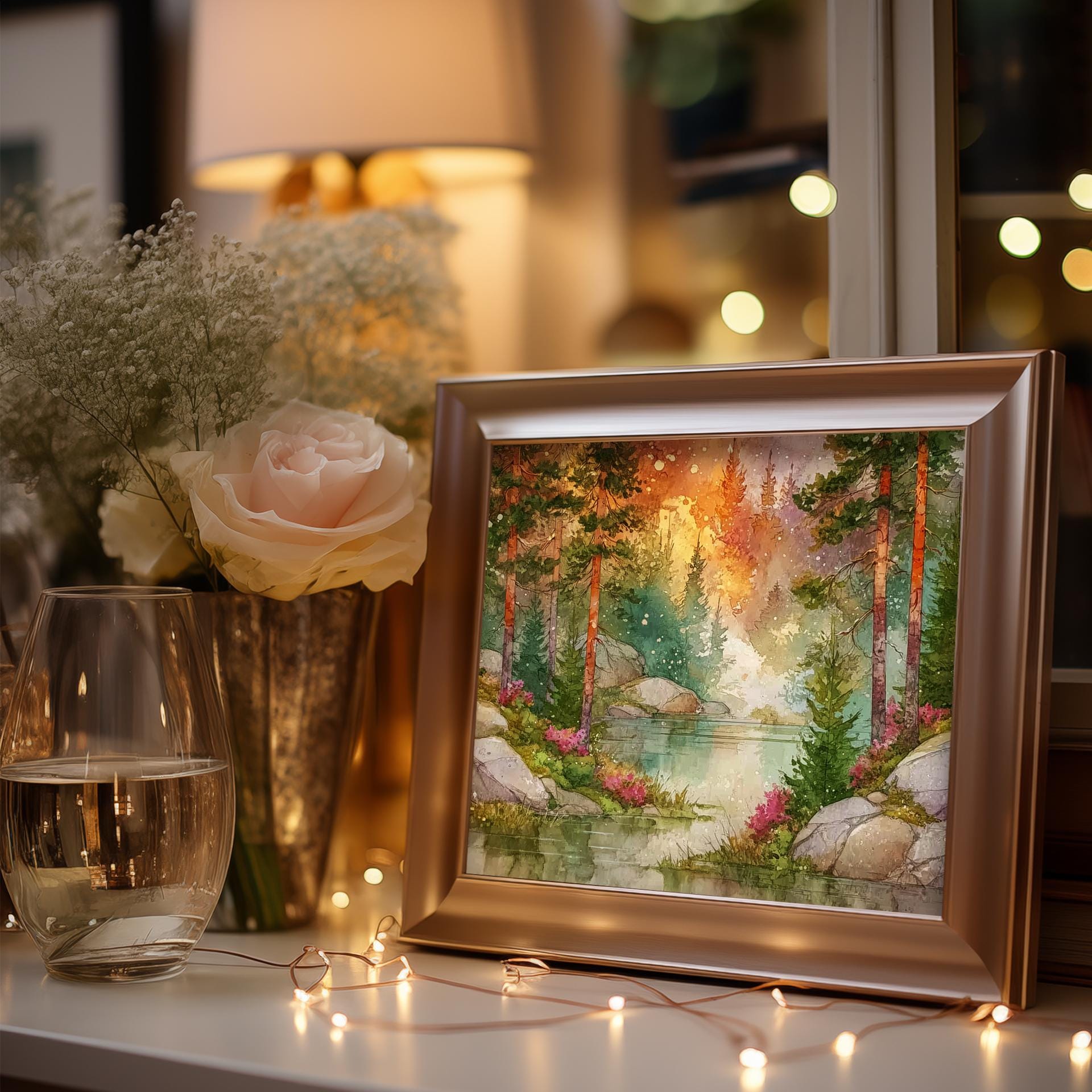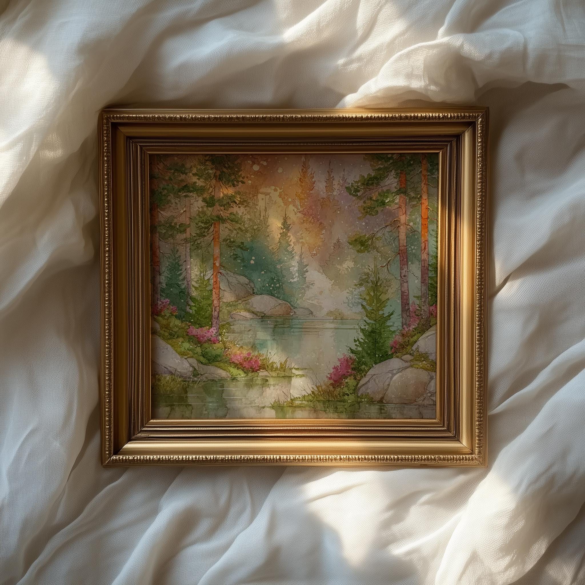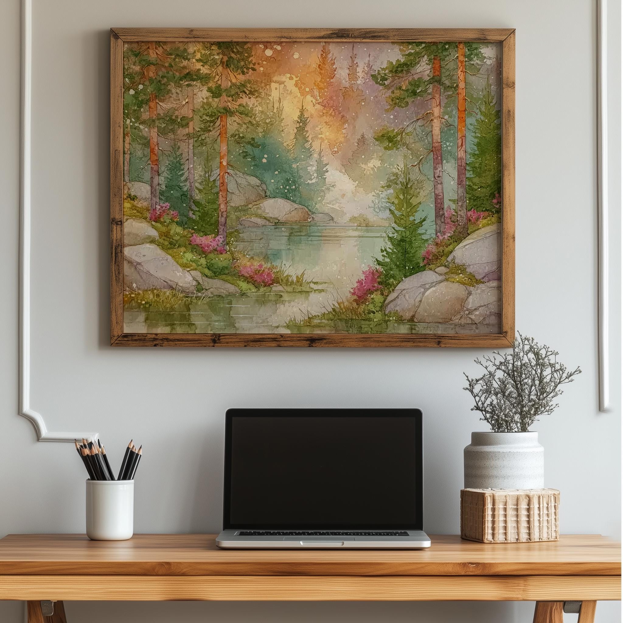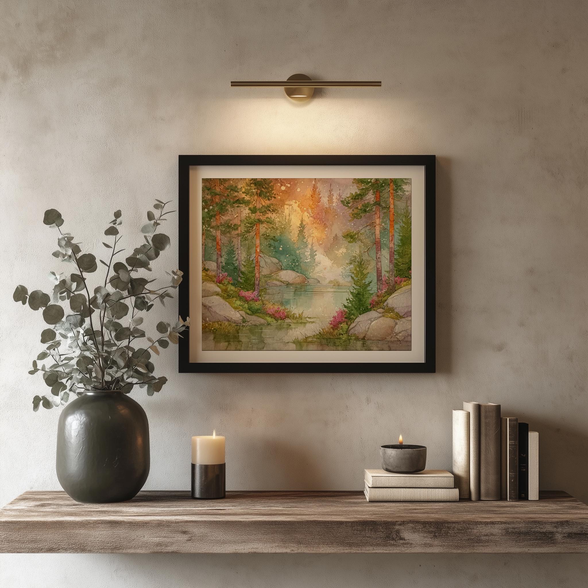 Immerse yourself in the charm with this rustic painting of a misty forest at dawn. An instantly downloadable print, it's perfect for elevating your decor with budget-friendly charm. This gives you the flexibility to customize the size, frame, and material according to your personal taste and space, ensuring a perfect fit for your walls.