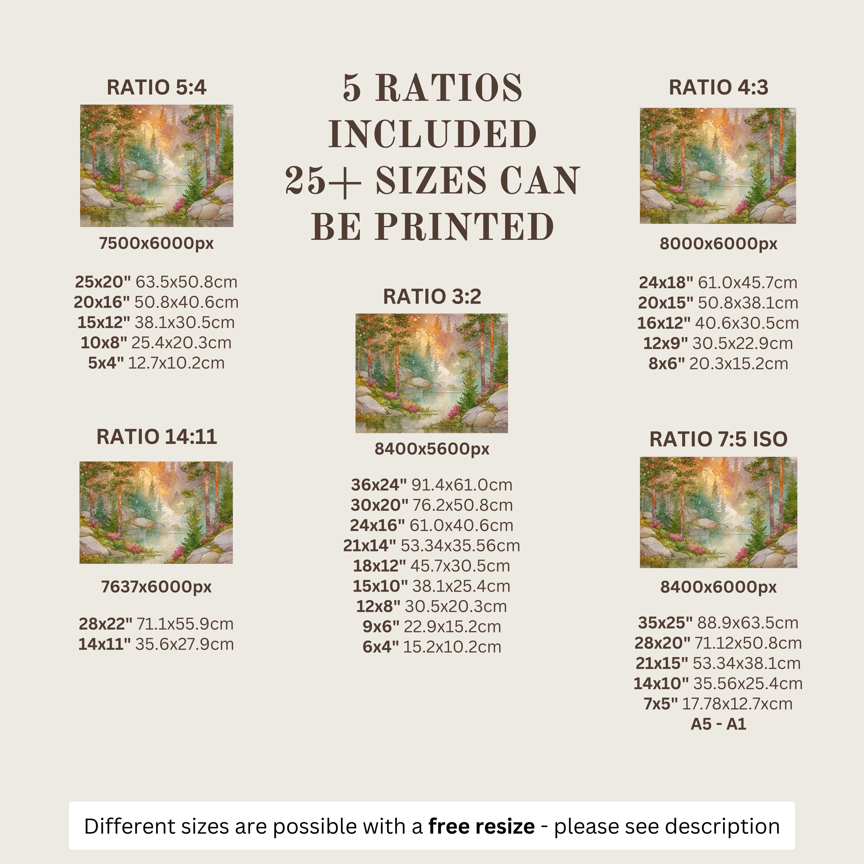 Each artwork includes 5 aspect ratios with 25+ print sizes. Most standard frames are covered. One custom resize per purchase available—message before ordering.