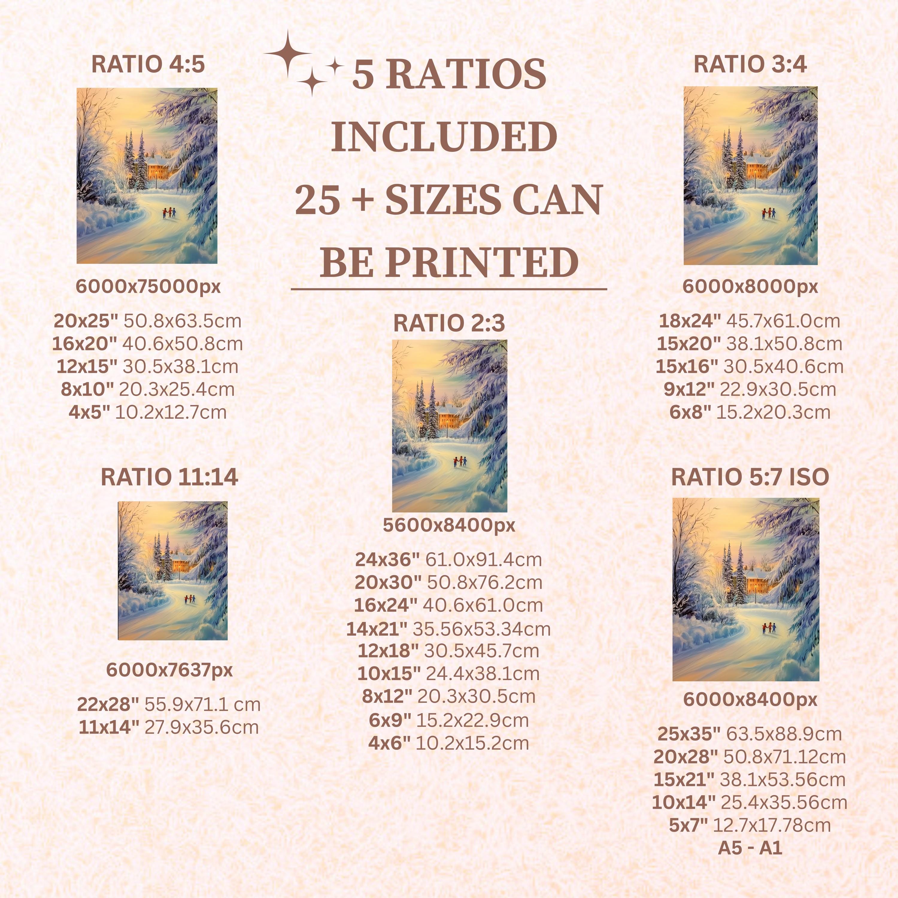 Each artwork includes 5 aspect ratios with 25+ print sizes. Most standard frames are covered. One custom resize per purchase available—message before ordering.