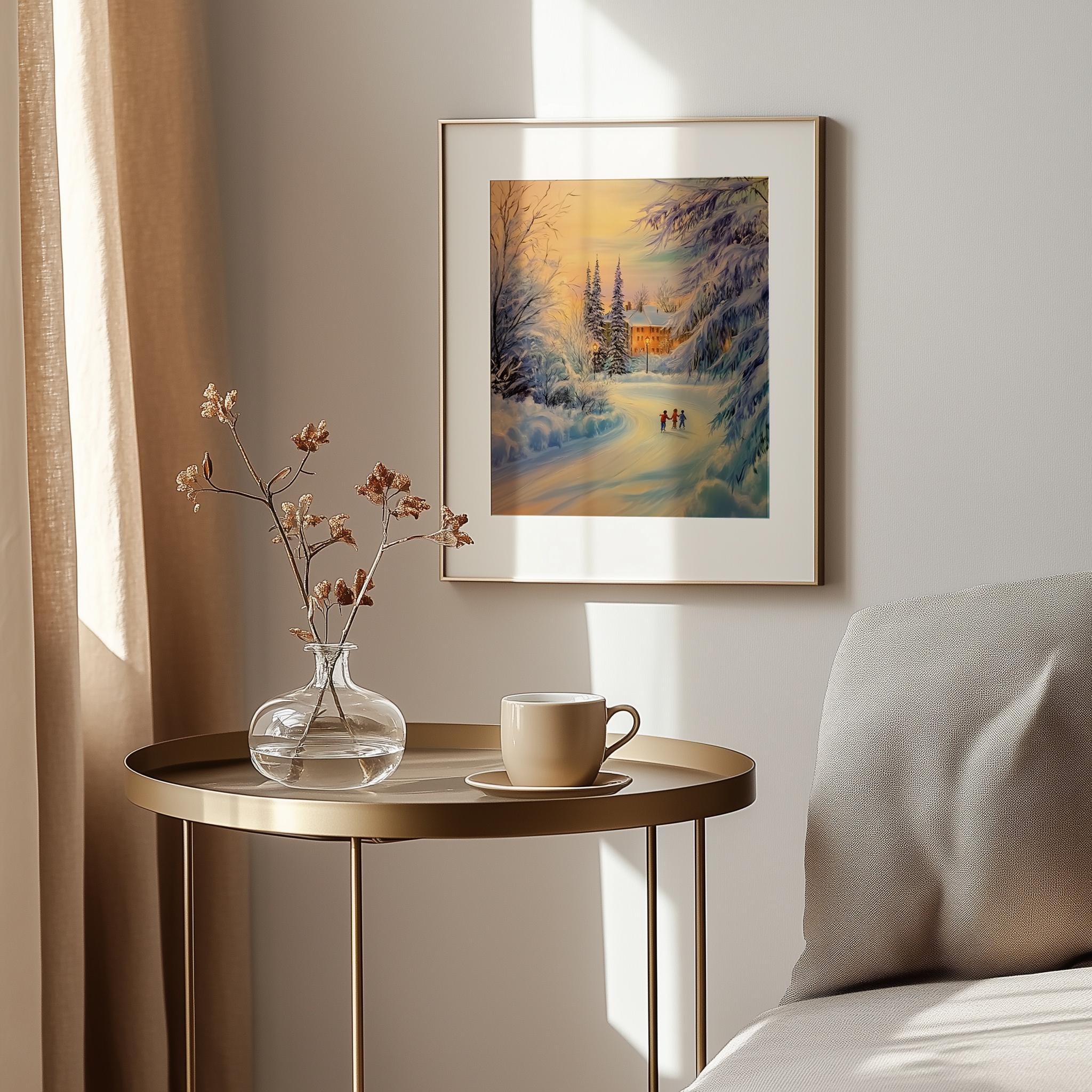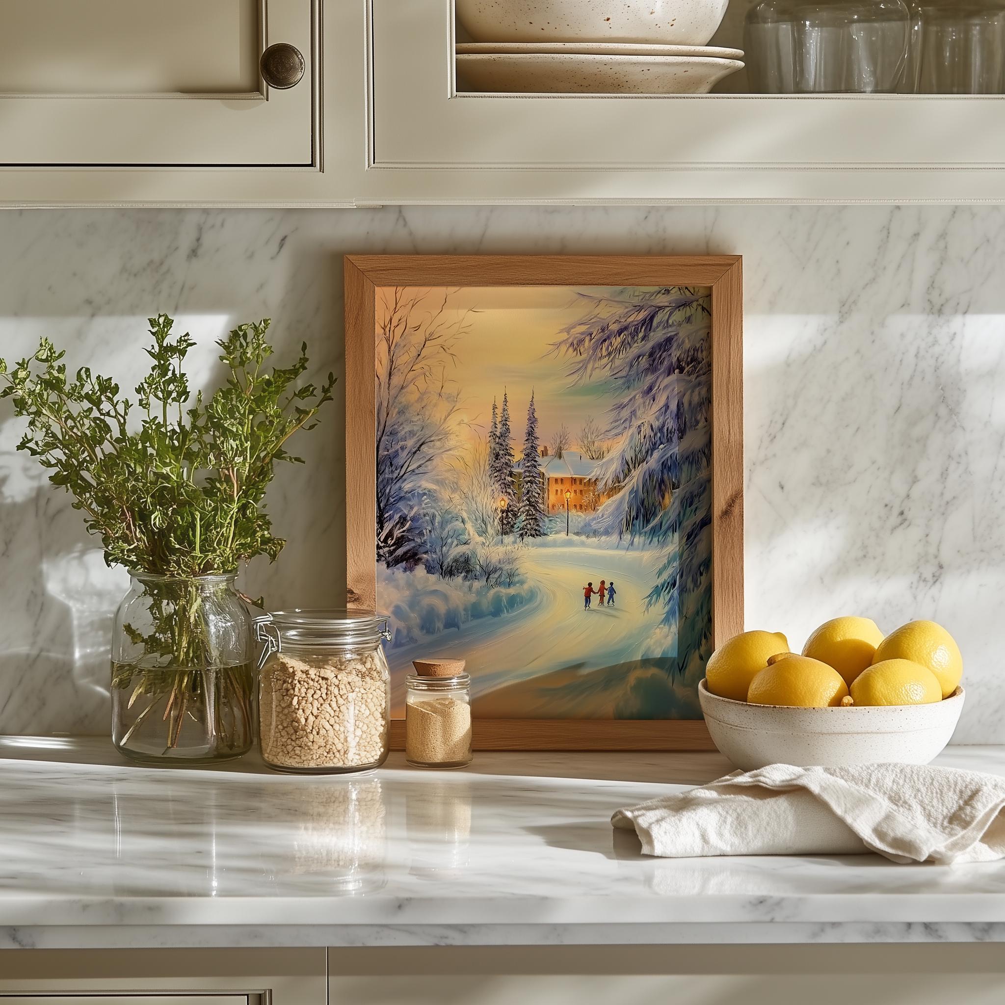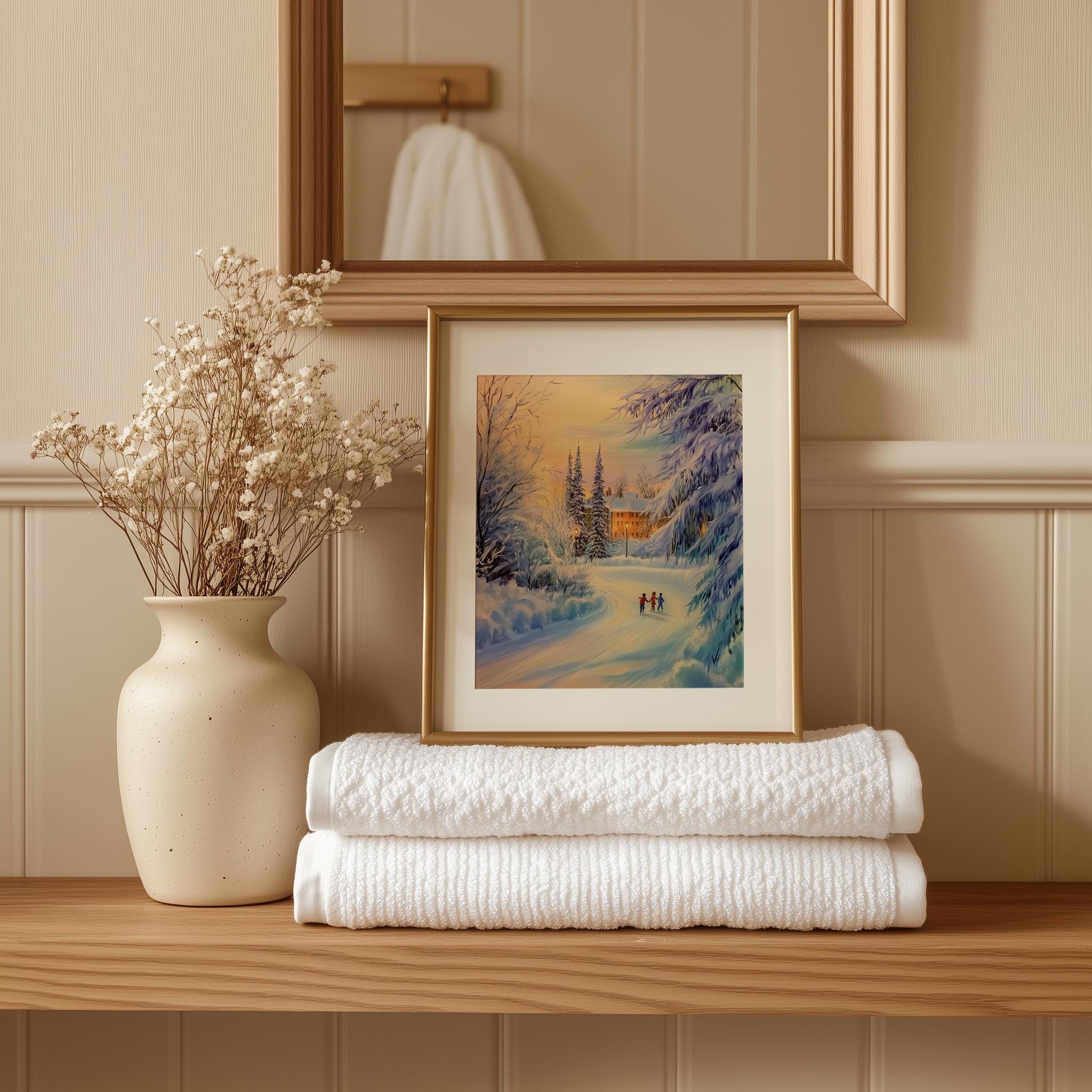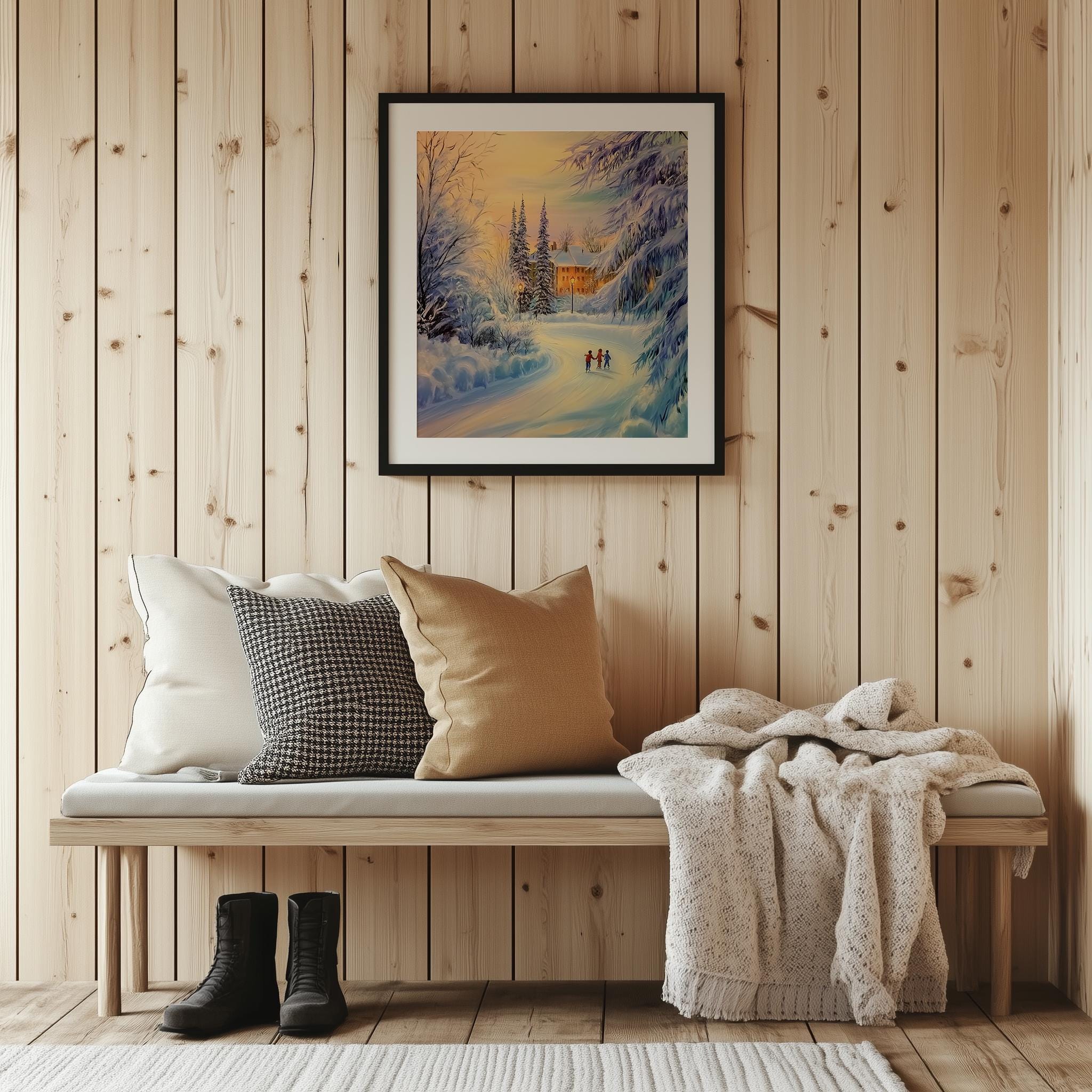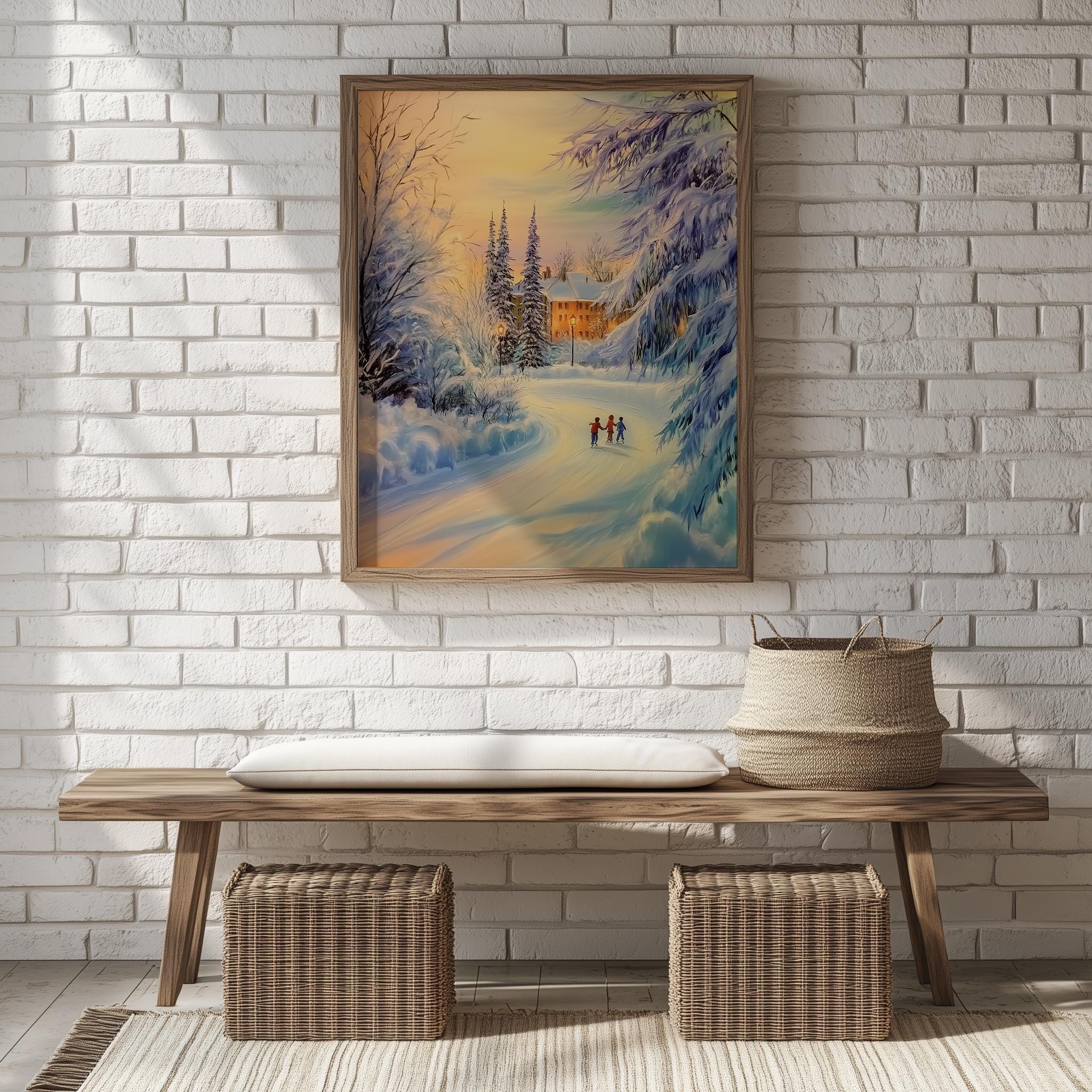 Immerse yourself in the charm of this rustic painting of a cozy holiday village plaza scene featuring children skating amidst snowy trees and festive decorations. An instantly downloadable print, it's perfect for elevating your decor with budget-friendly charm. This gives you the flexibility to customize the size, frame, and material according to your personal taste and space, ensuring a perfect fit for your walls.