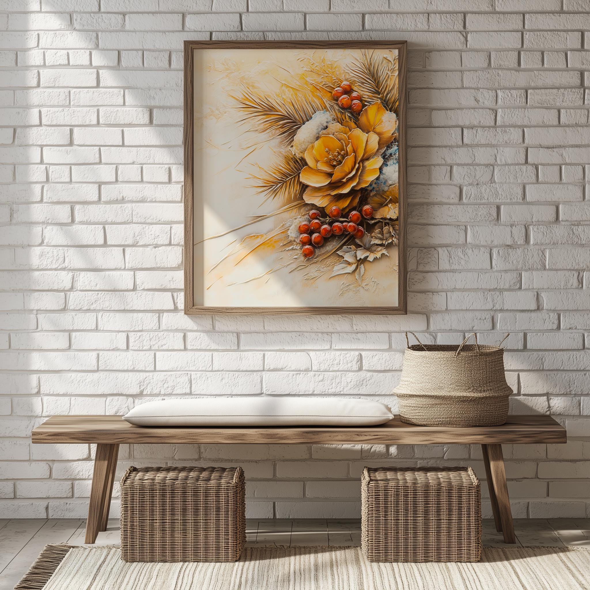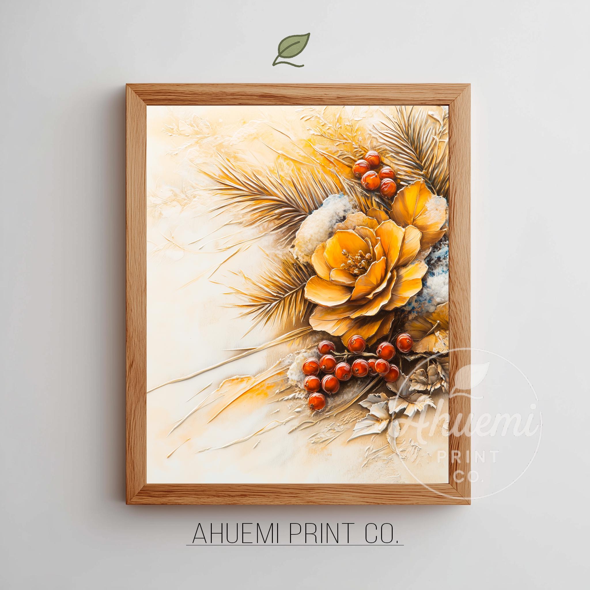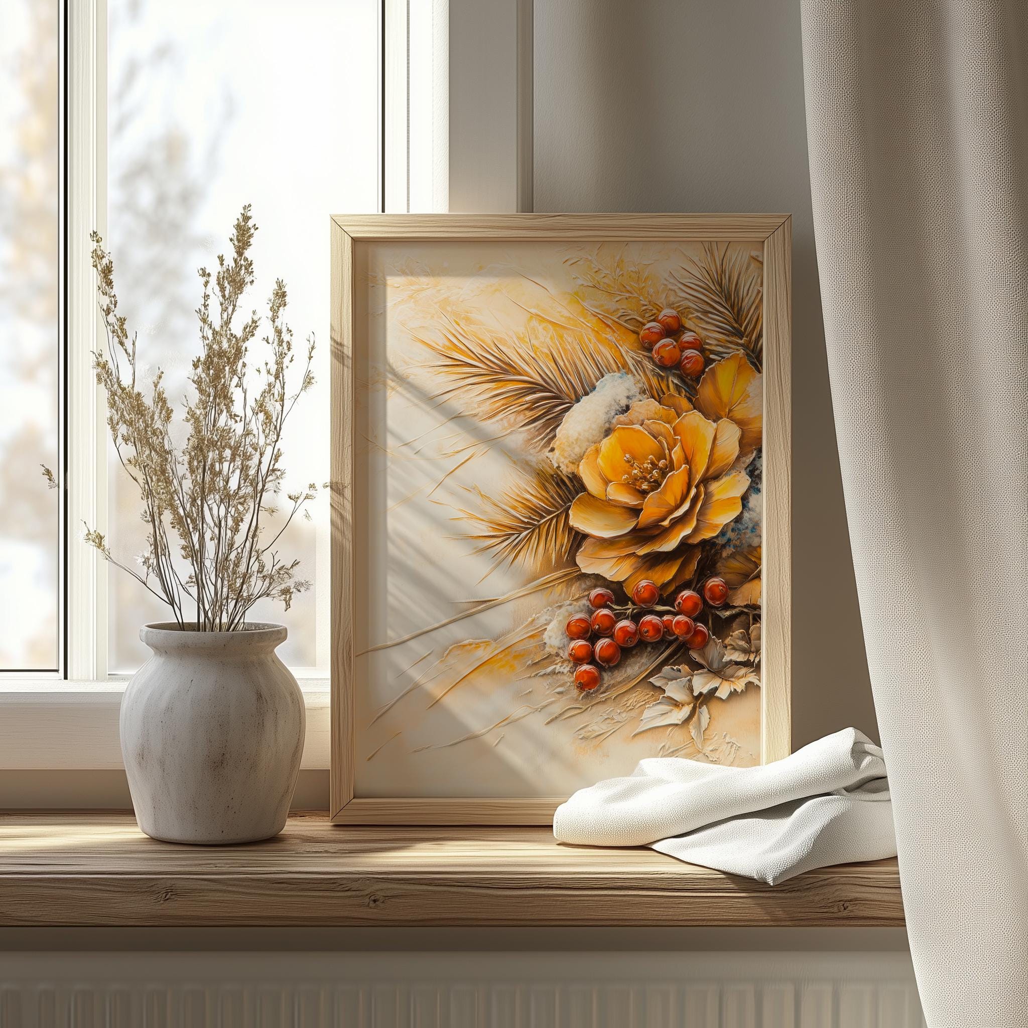 Immerse yourself in the charm of this rustic painting of a delicate pine branch adorned with a vibrant rose. An instantly downloadable print, it's perfect for elevating your decor with budget-friendly charm. This gives you the flexibility to customize the size, frame, and material according to your personal taste and space, ensuring a perfect fit for your walls.