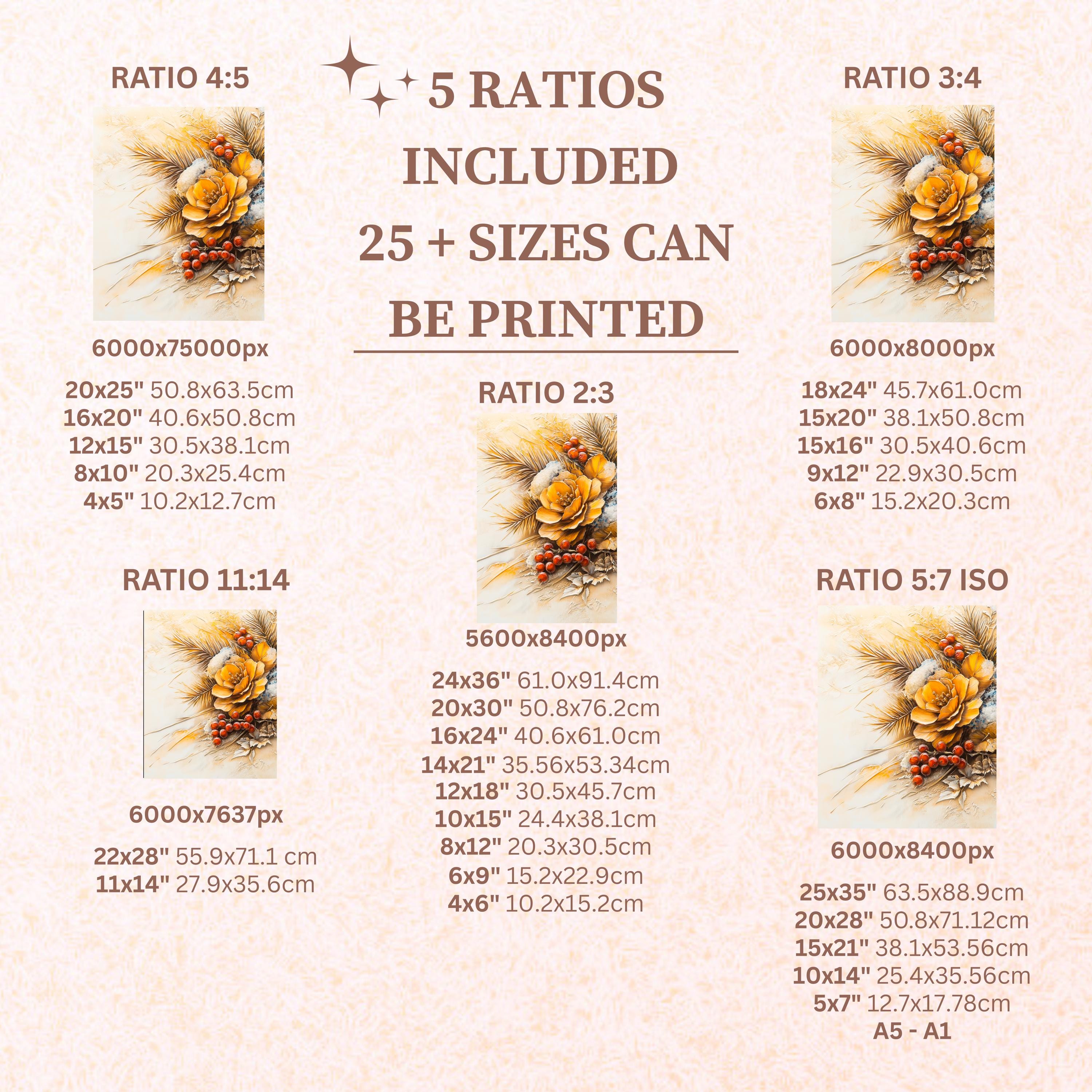Each artwork includes 5 aspect ratios with 25+ print sizes. Most standard frames are covered. One custom resize per purchase available—message before ordering.