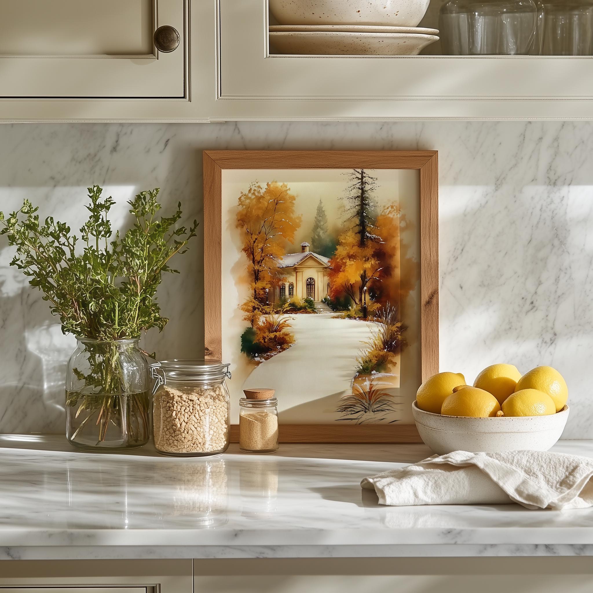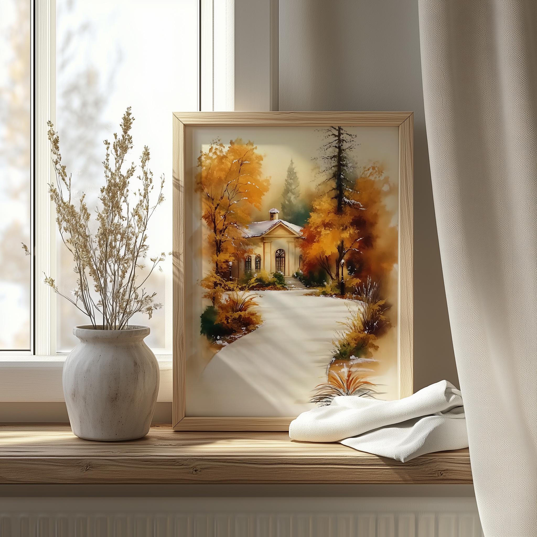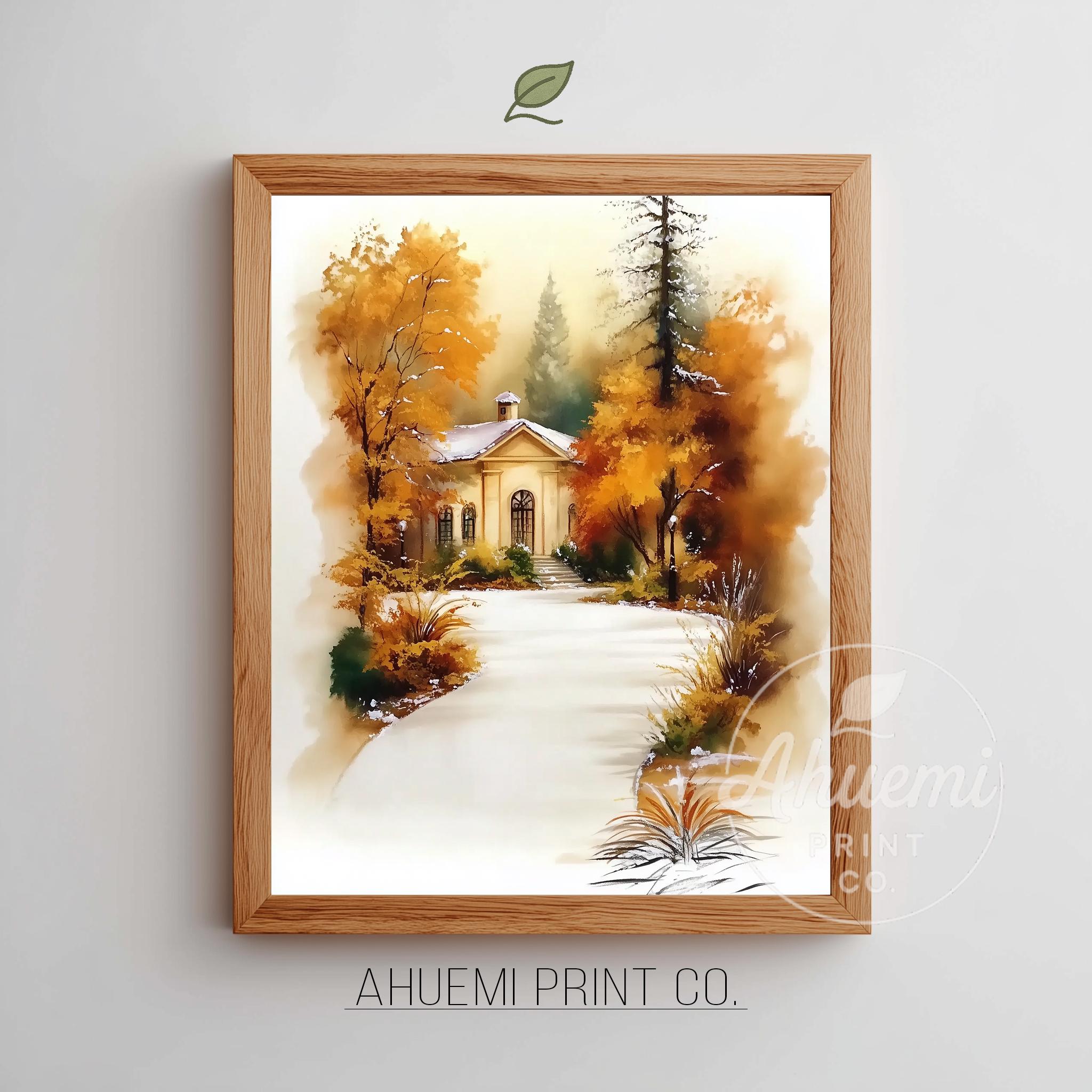 Immerse yourself in the charm of this rustic painting of a quaint cottage nestled along a winding path, surrounded by vibrant autumn foliage. An instantly downloadable print, it's perfect for elevating your decor with budget-friendly charm. This gives you the flexibility to customize the size, frame, and material according to your personal taste and space, ensuring a perfect fit for your walls.