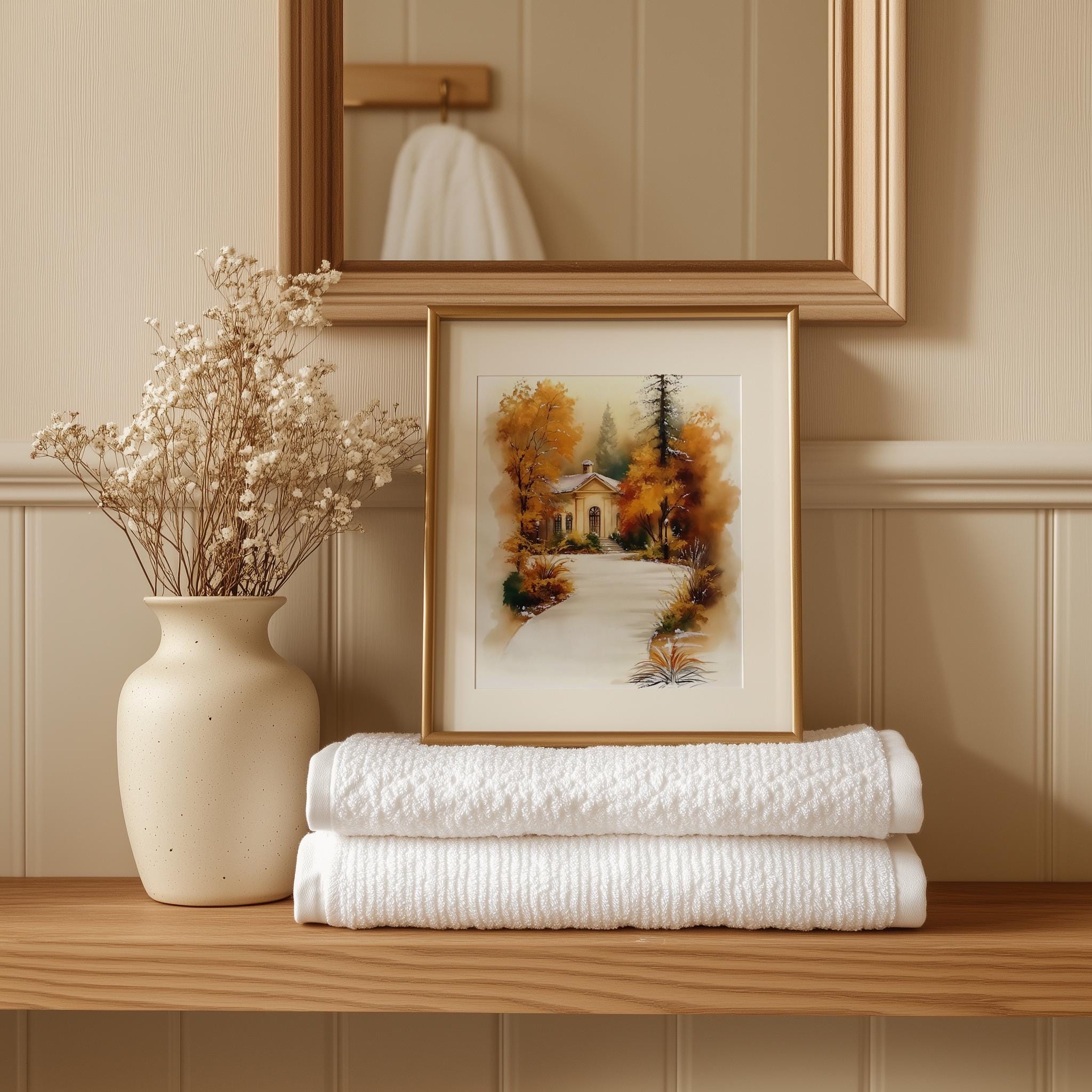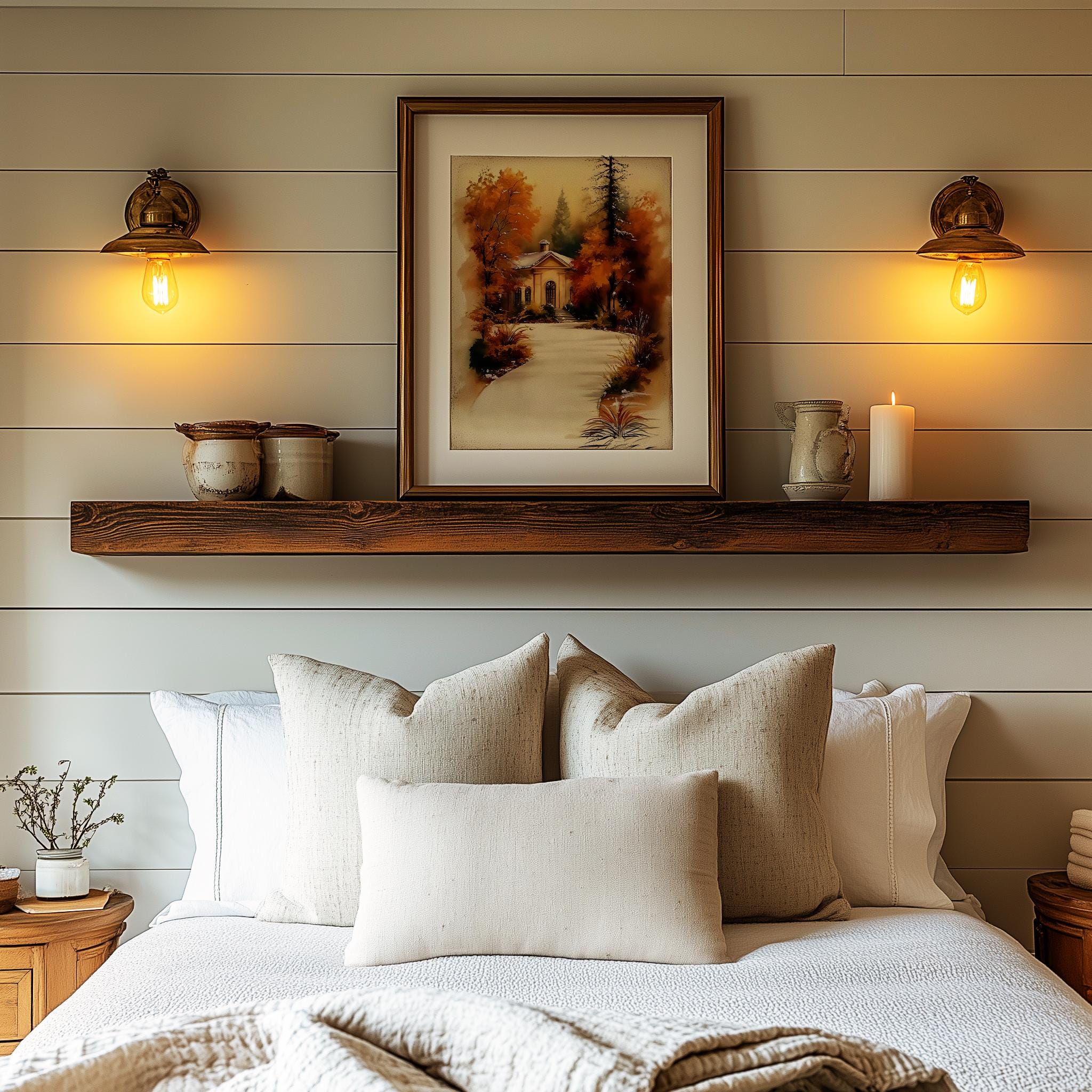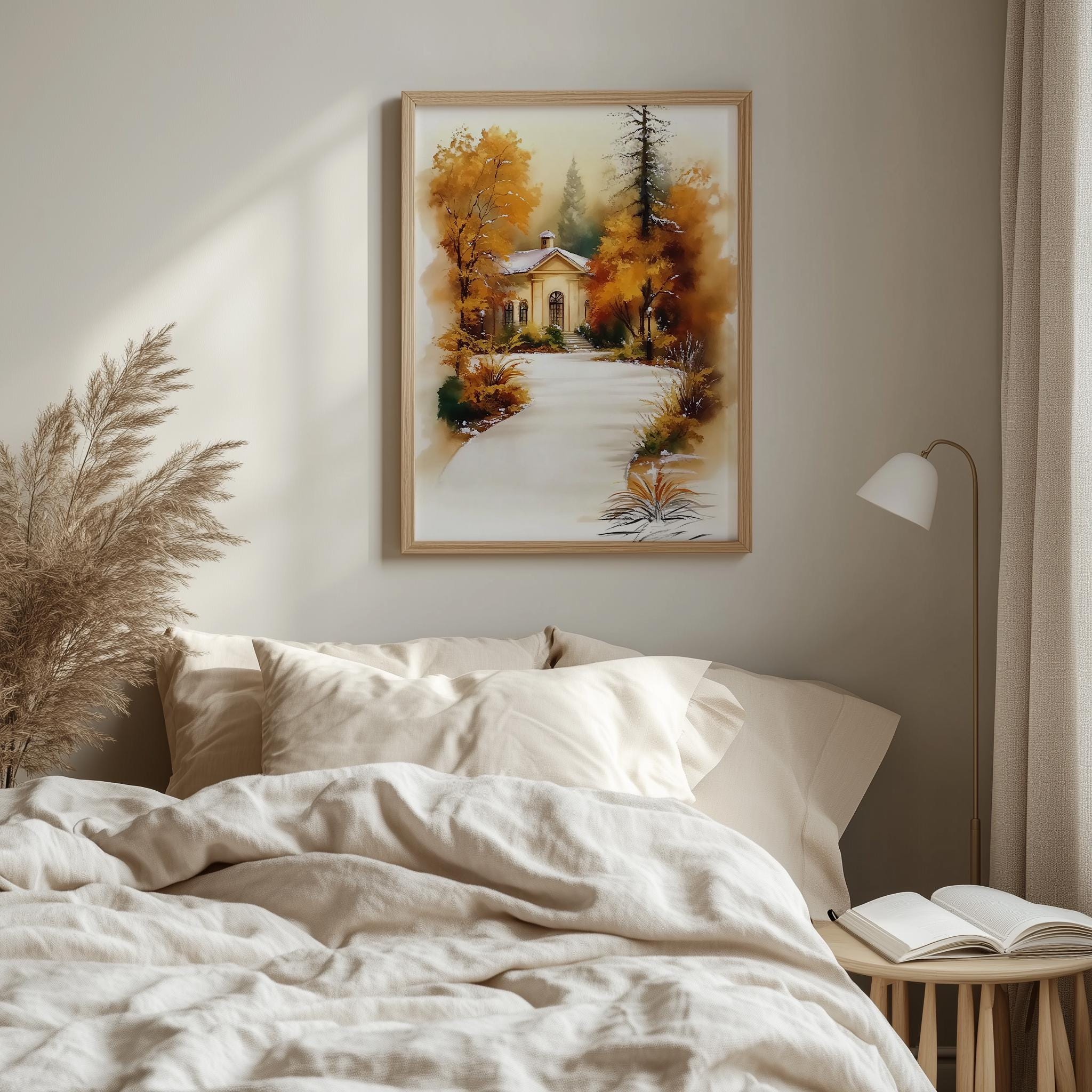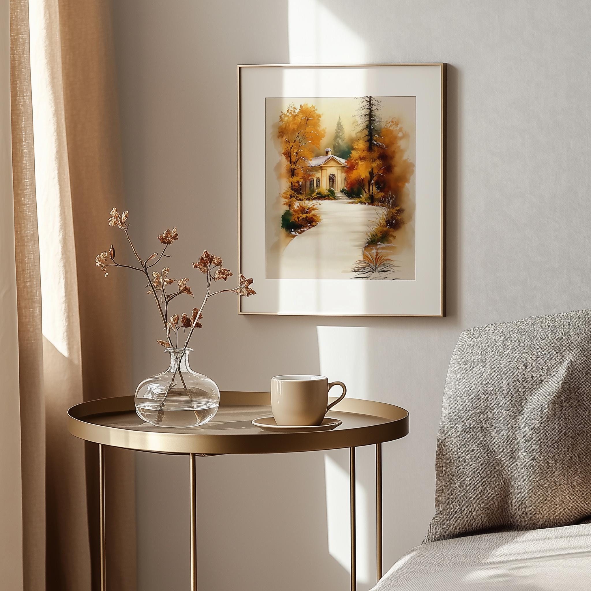 Immerse yourself in the charm of this rustic painting of a quaint cottage nestled along a winding path, surrounded by vibrant autumn foliage. An instantly downloadable print, it's perfect for elevating your decor with budget-friendly charm. This gives you the flexibility to customize the size, frame, and material according to your personal taste and space, ensuring a perfect fit for your walls.