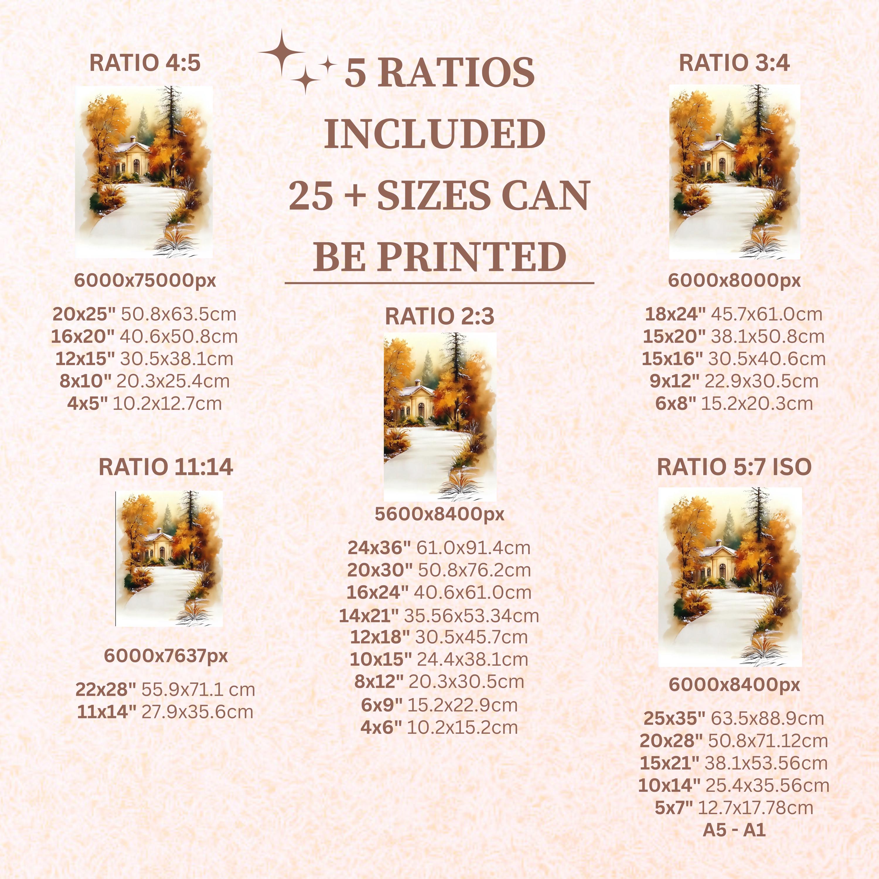 Each artwork includes 5 aspect ratios with 25+ print sizes. Most standard frames are covered. One custom resize per purchase available—message before ordering.