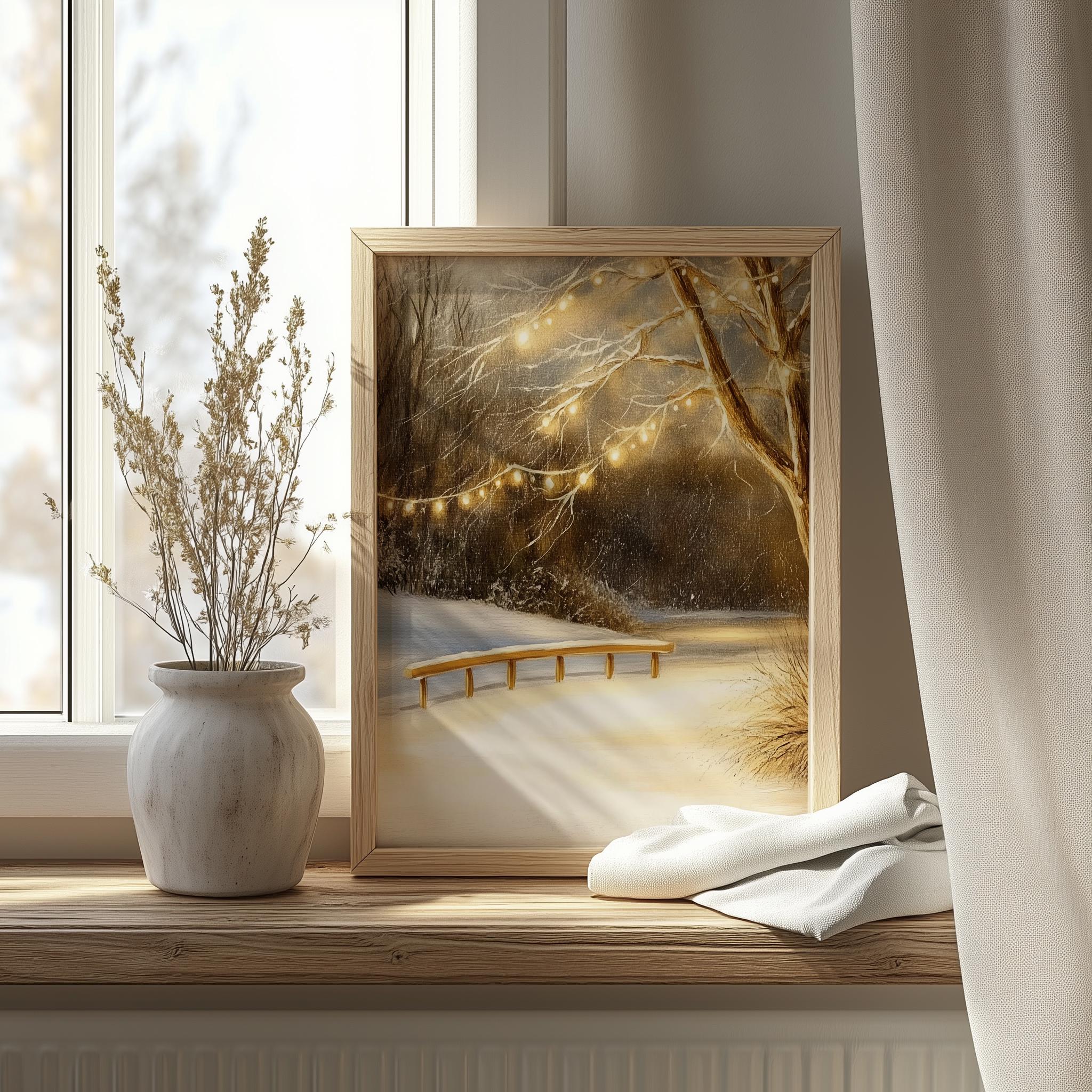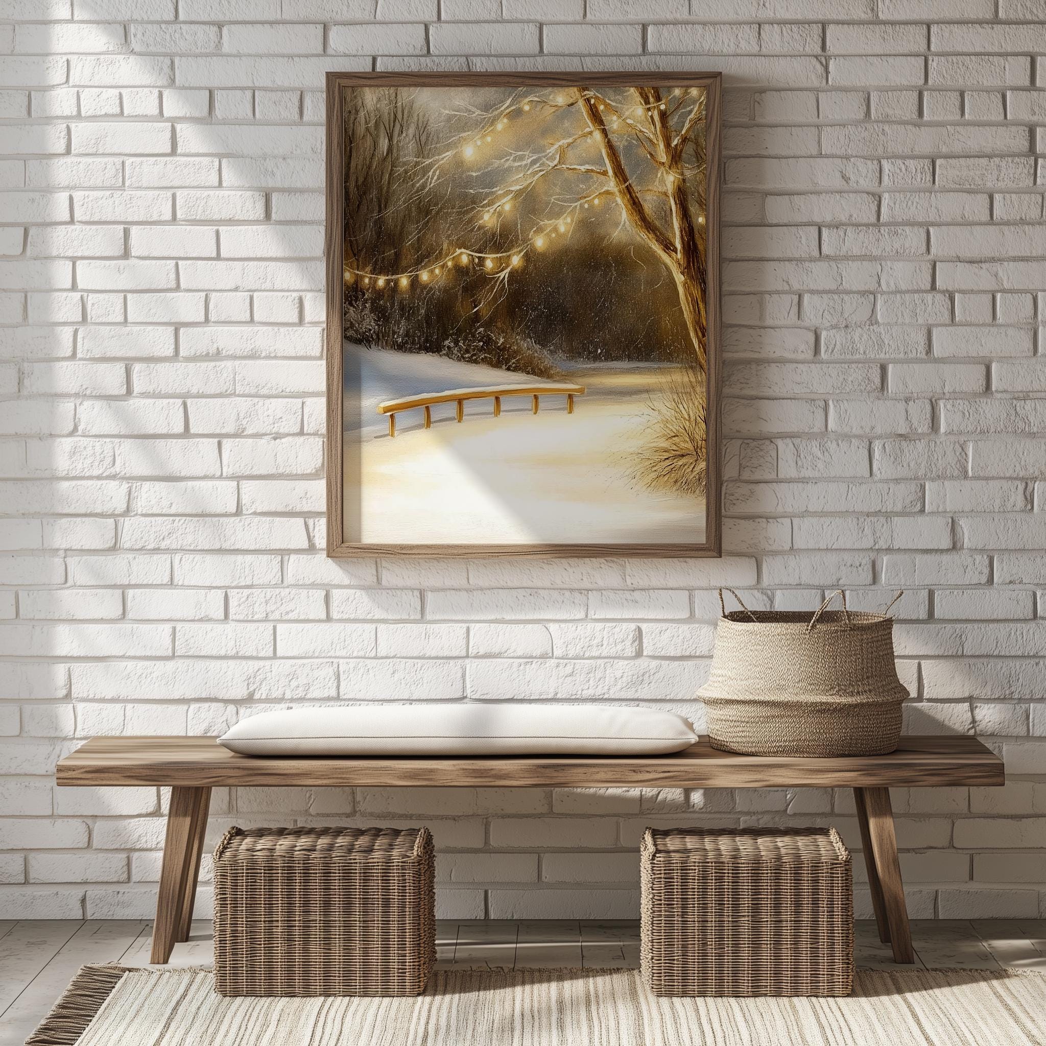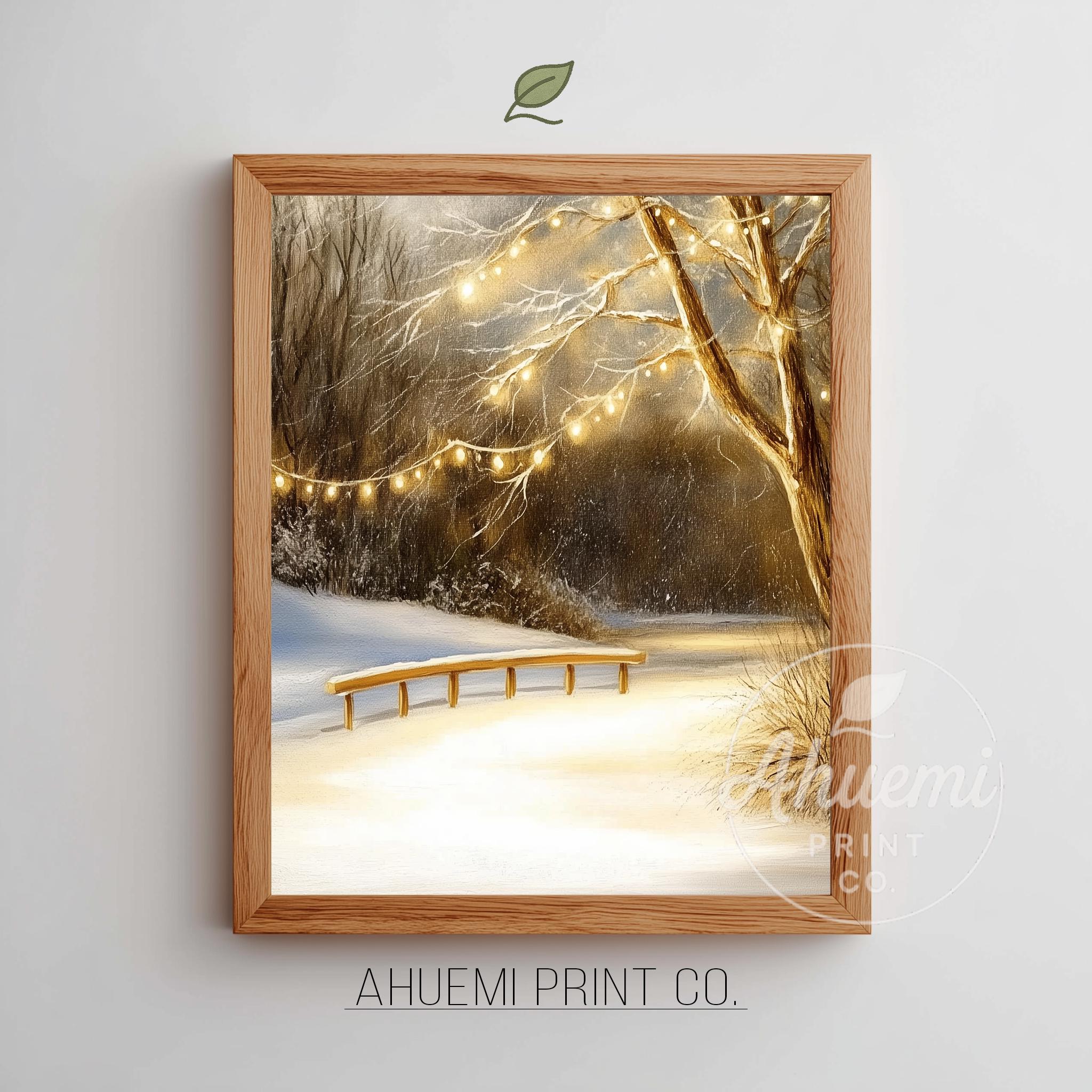 Immerse yourself in the charm of this rustic painting of a vintage ice-skating rink surrounded by a cozy village, illuminated by warm glowing tree lights. An instantly downloadable print, it's perfect for elevating your decor with budget-friendly charm. This gives you the flexibility to customize the size, frame, and material according to your personal taste and space, ensuring a perfect fit for your walls.
