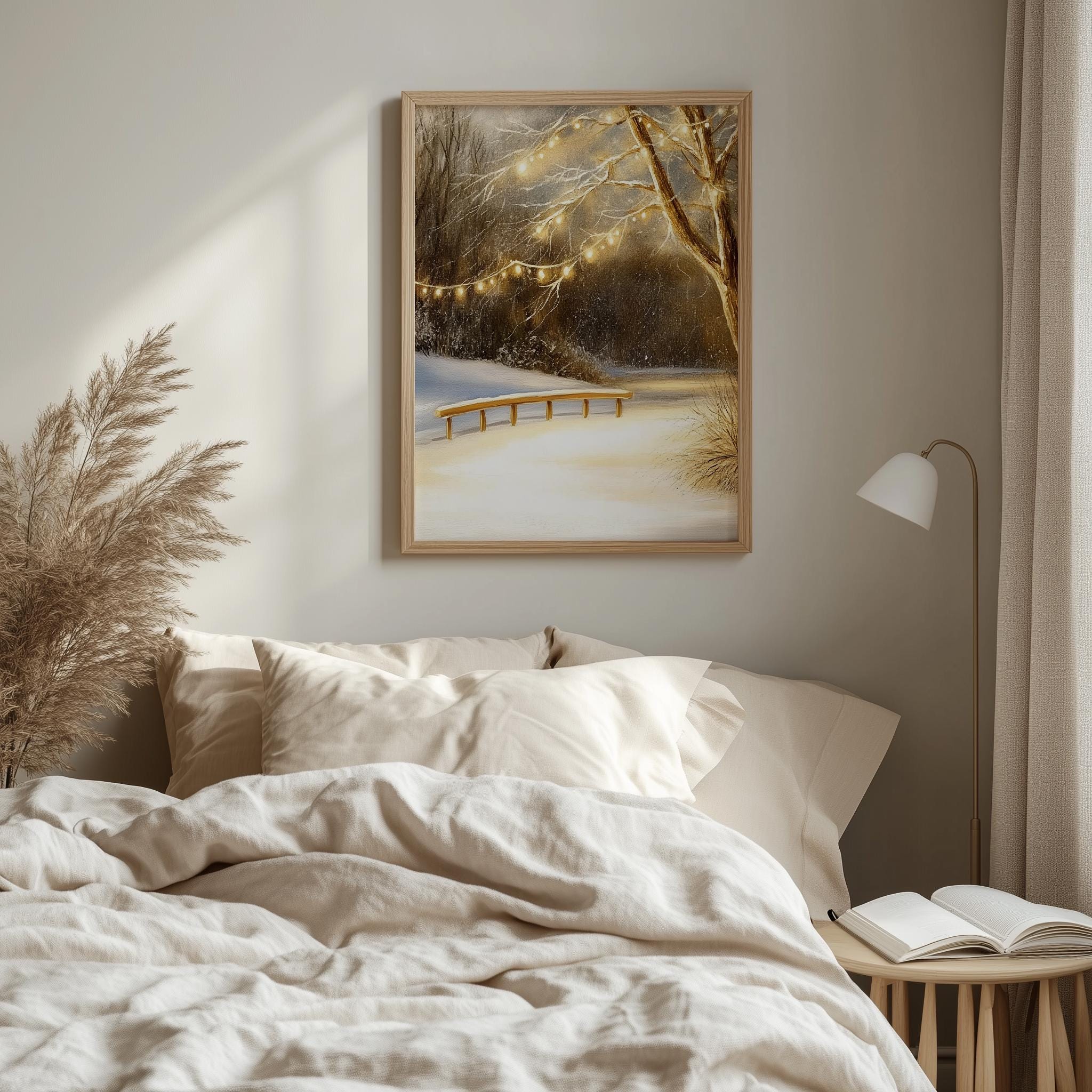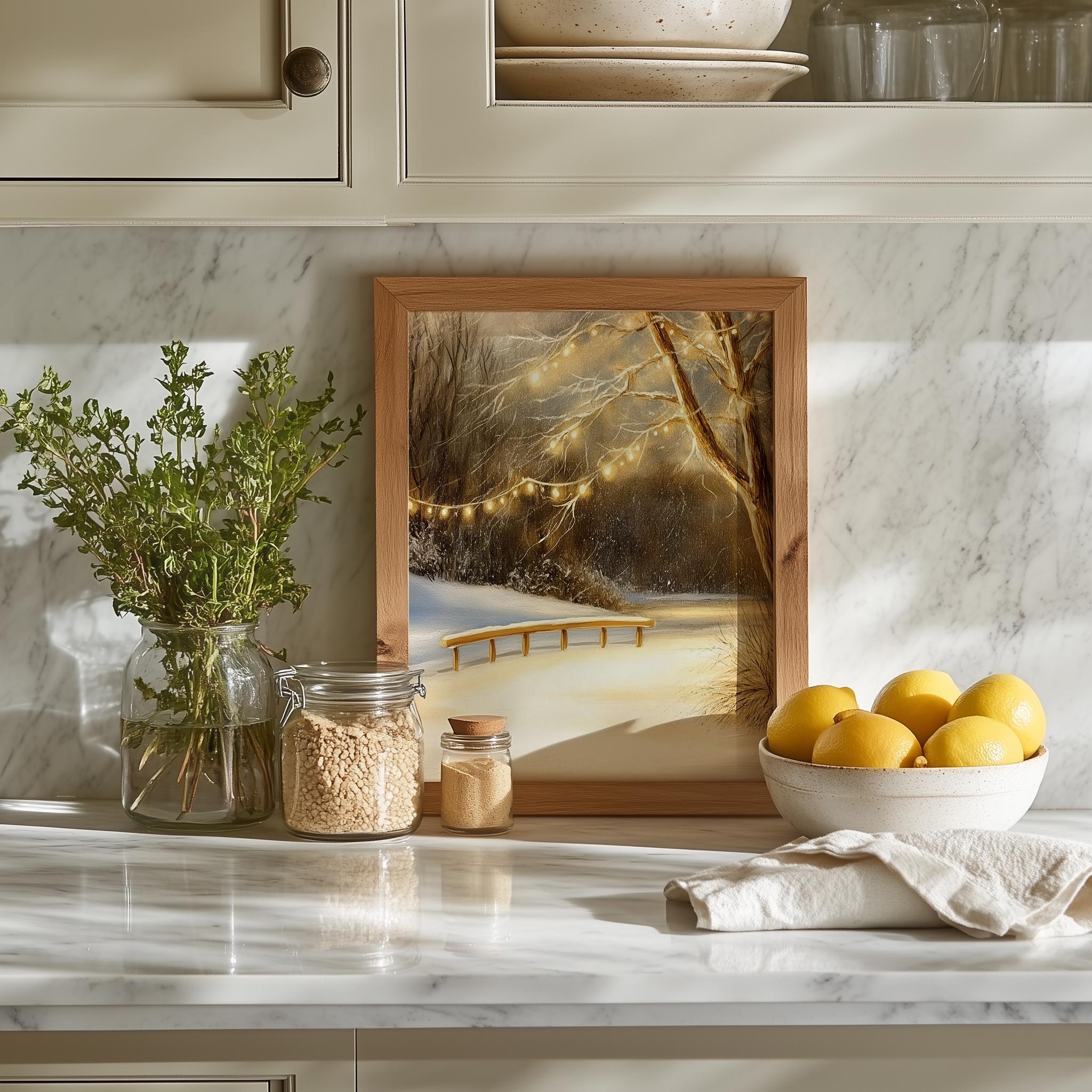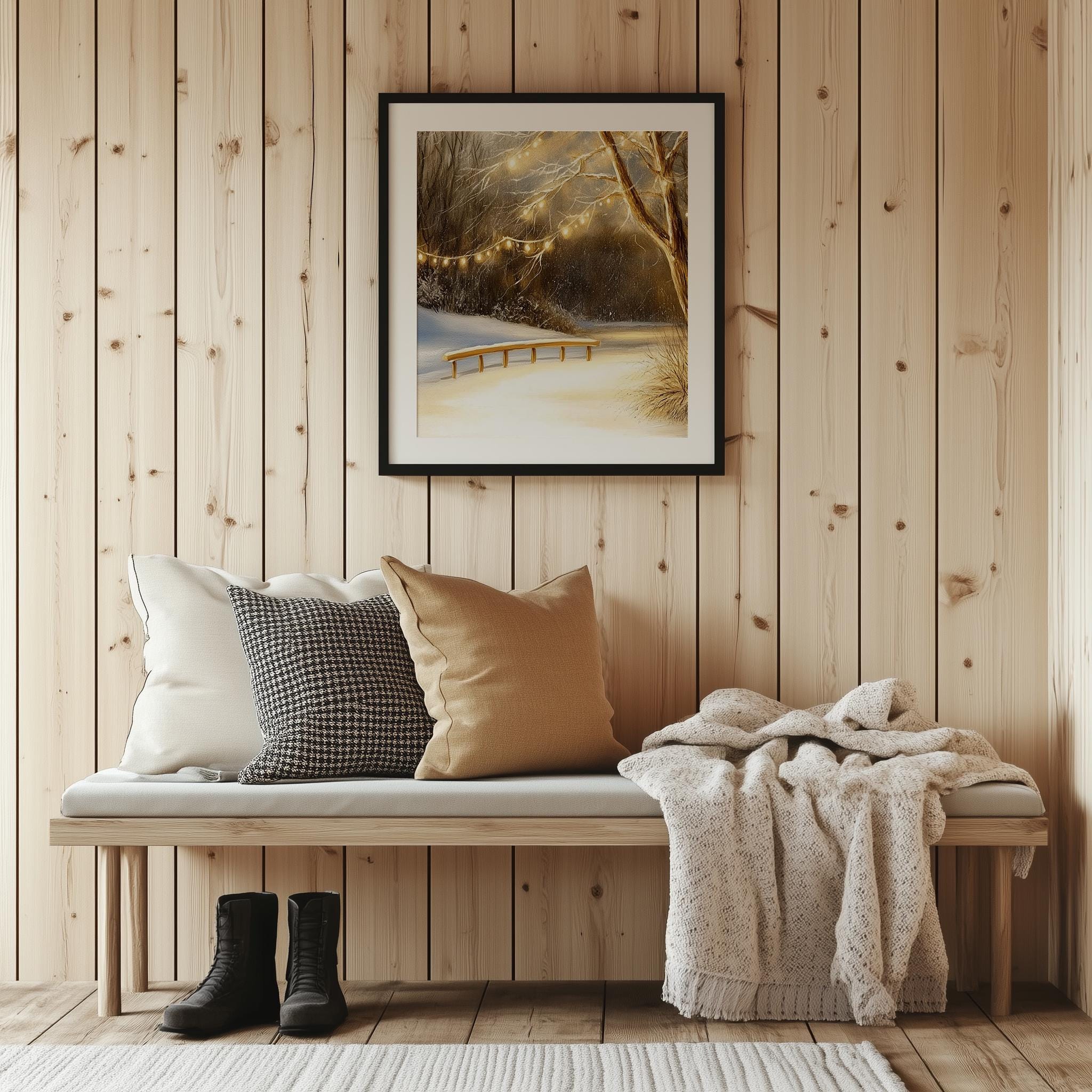 Immerse yourself in the charm of this rustic painting of a vintage ice-skating rink surrounded by a cozy village, illuminated by warm glowing tree lights. An instantly downloadable print, it's perfect for elevating your decor with budget-friendly charm. This gives you the flexibility to customize the size, frame, and material according to your personal taste and space, ensuring a perfect fit for your walls.