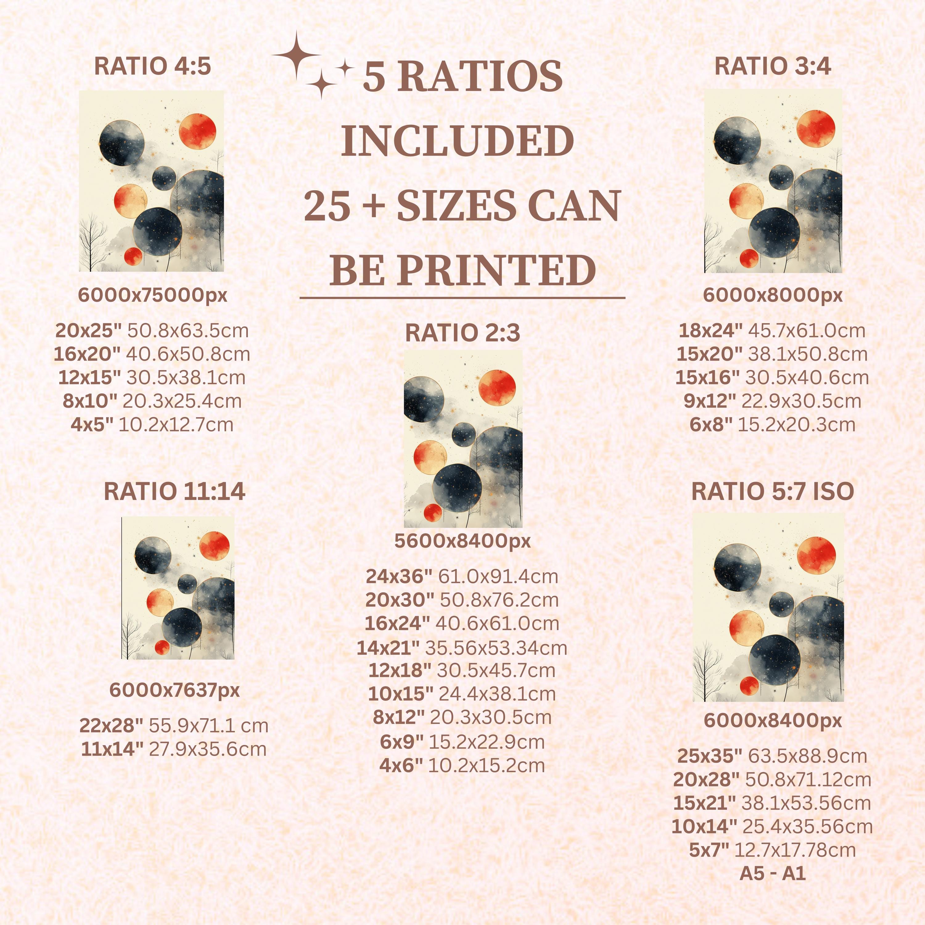 Each artwork includes 5 aspect ratios with 25+ print sizes. Most standard frames are covered. One custom resize per purchase available—message before ordering.