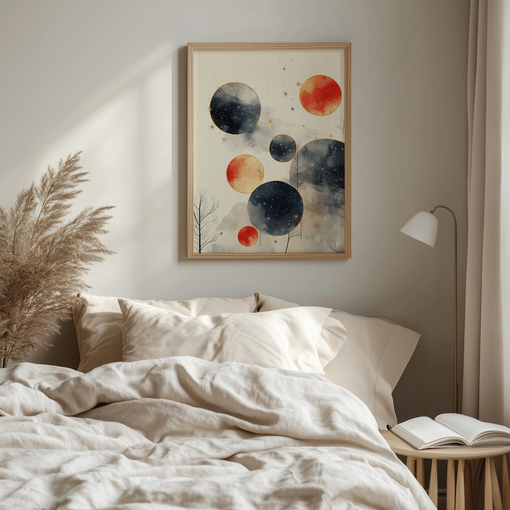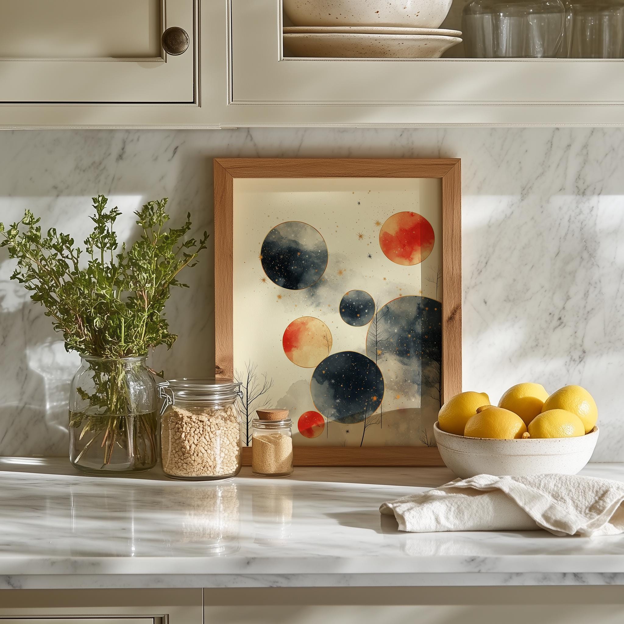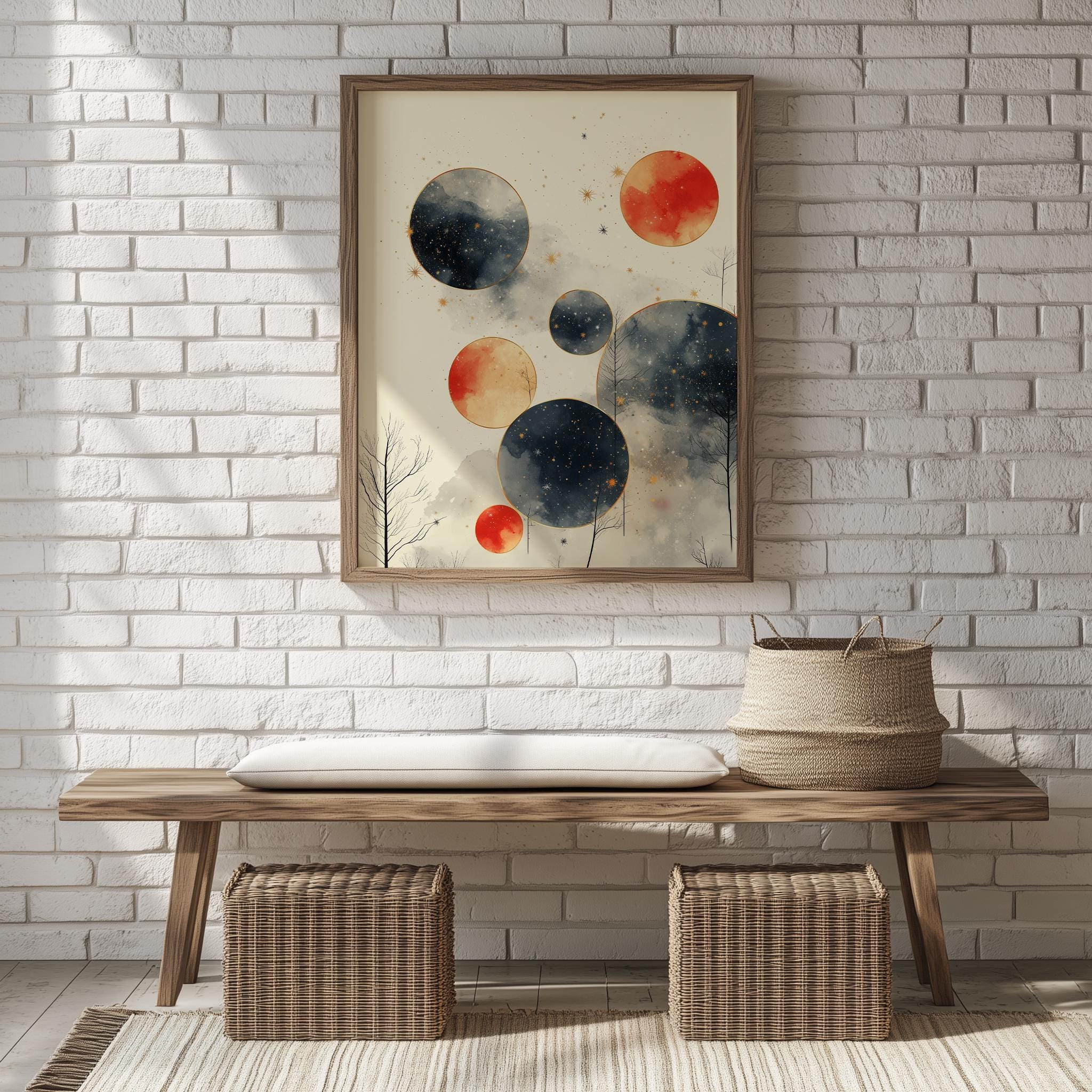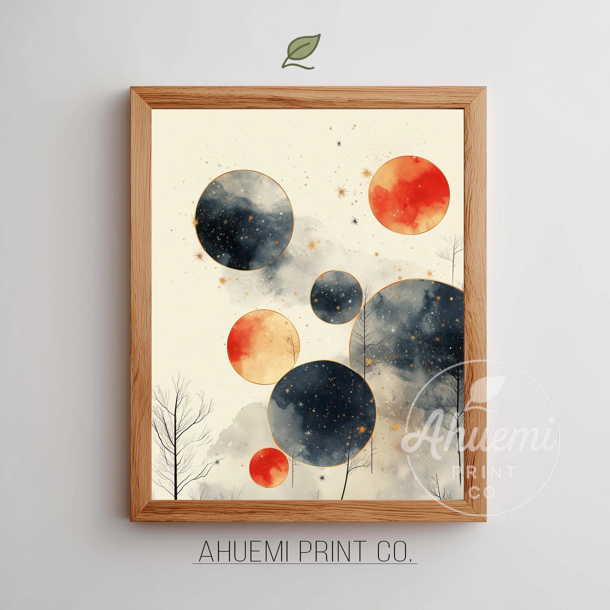 Immerse yourself in the charm of this rustic painting of a serene winter landscape featuring ethereal circular orbs. An instantly downloadable print, it's perfect for elevating your decor with budget-friendly charm. This gives you the flexibility to customize the size, frame, and material according to your personal taste and space, ensuring a perfect fit for your walls.