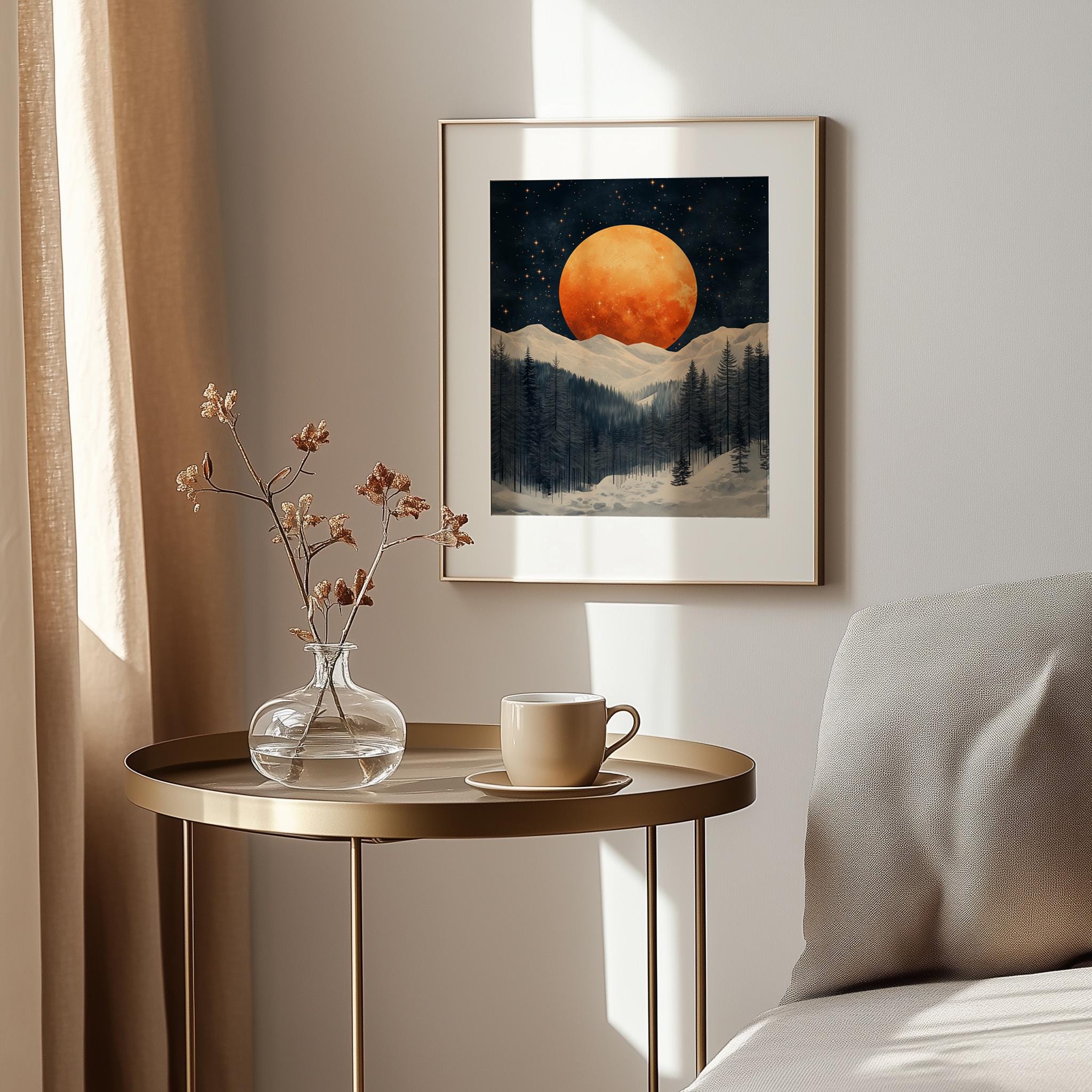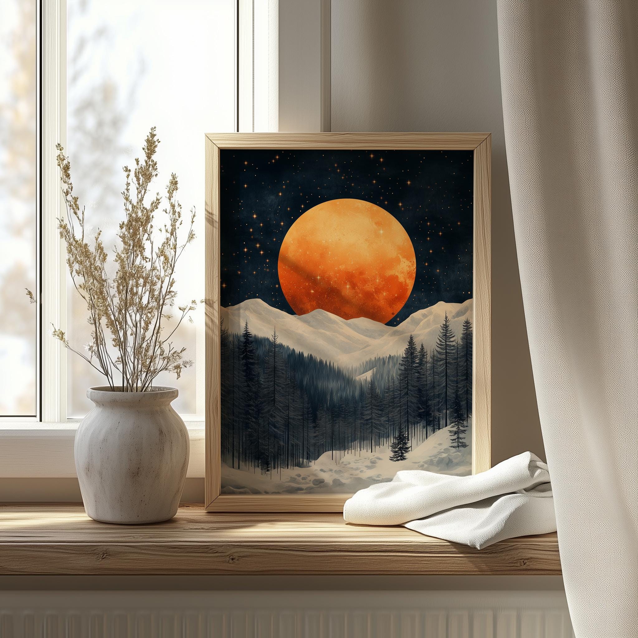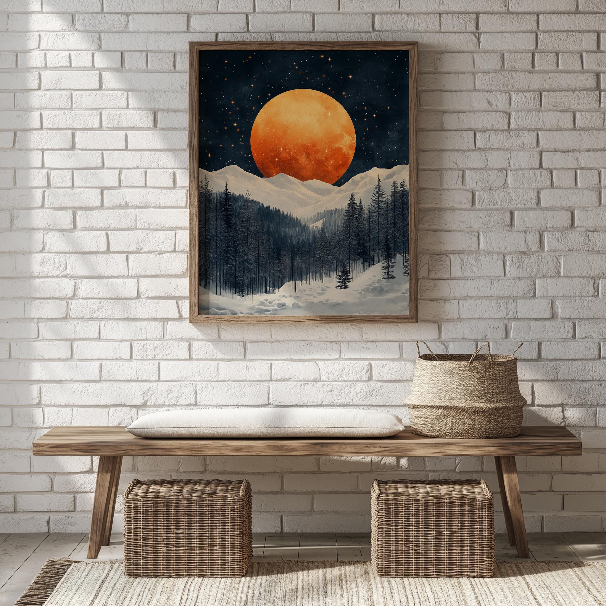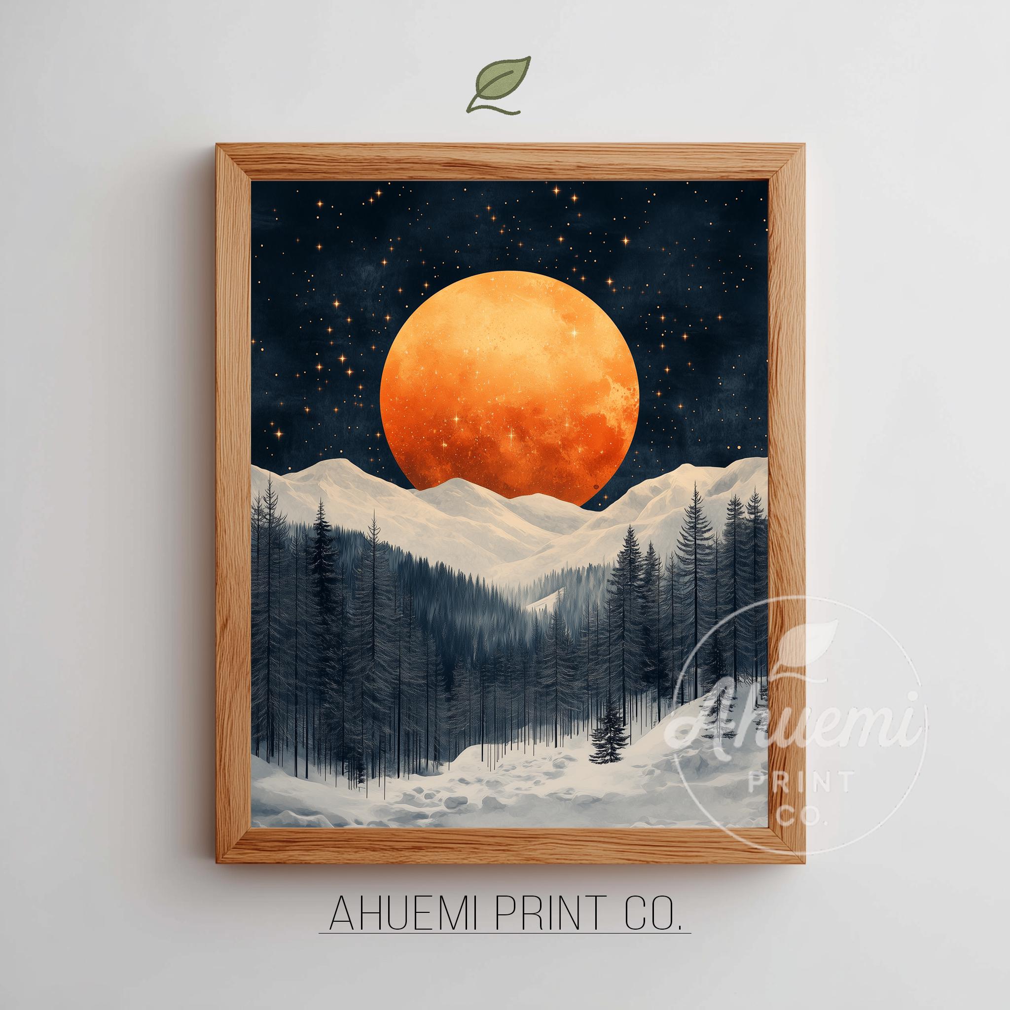 Immerse yourself in the charm of this rustic painting of a moody winter moon illuminating a serene snowy mountain landscape. An instantly downloadable print, it's perfect for elevating your decor with budget-friendly charm. This gives you the flexibility to customize the size, frame, and material according to your personal taste and space, ensuring a perfect fit for your walls.