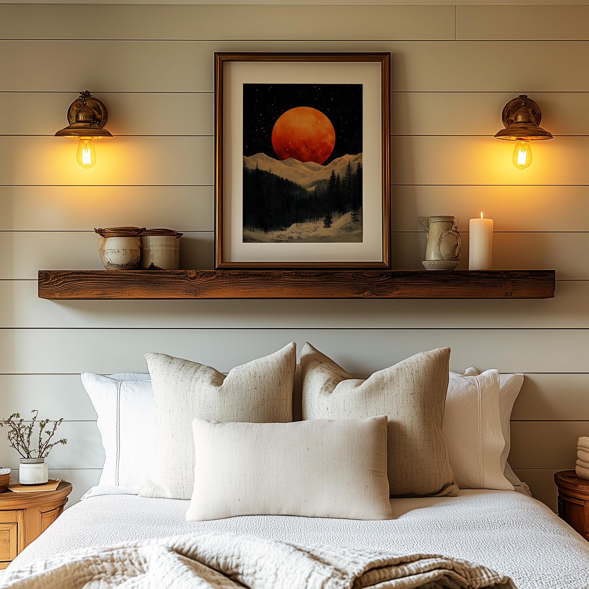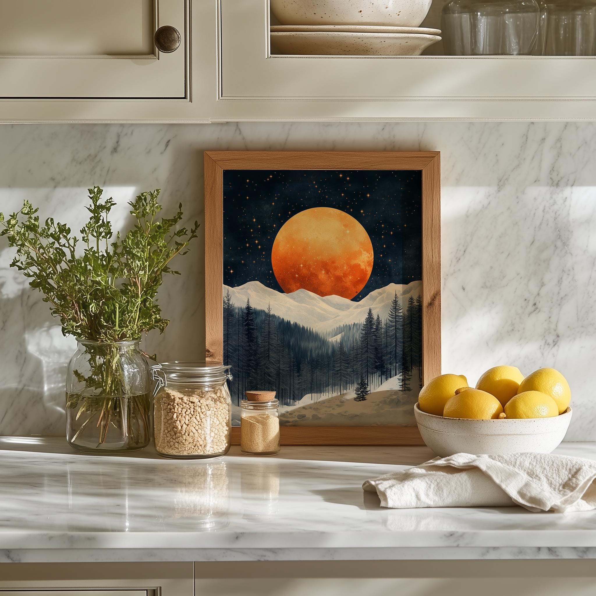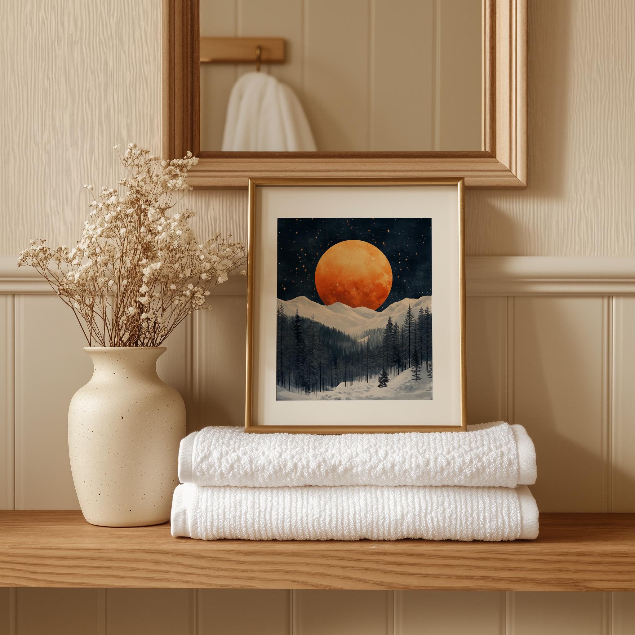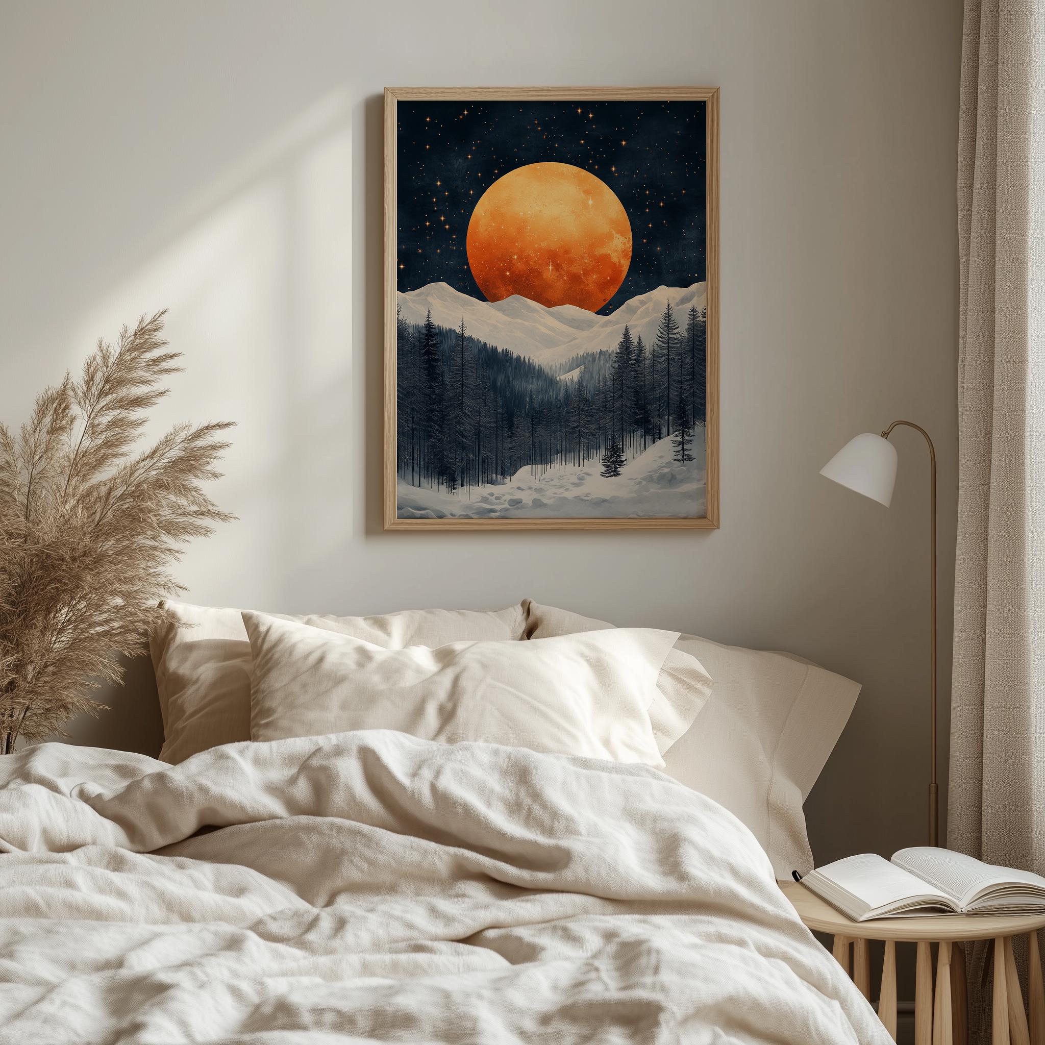 Immerse yourself in the charm of this rustic painting of a moody winter moon illuminating a serene snowy mountain landscape. An instantly downloadable print, it's perfect for elevating your decor with budget-friendly charm. This gives you the flexibility to customize the size, frame, and material according to your personal taste and space, ensuring a perfect fit for your walls.