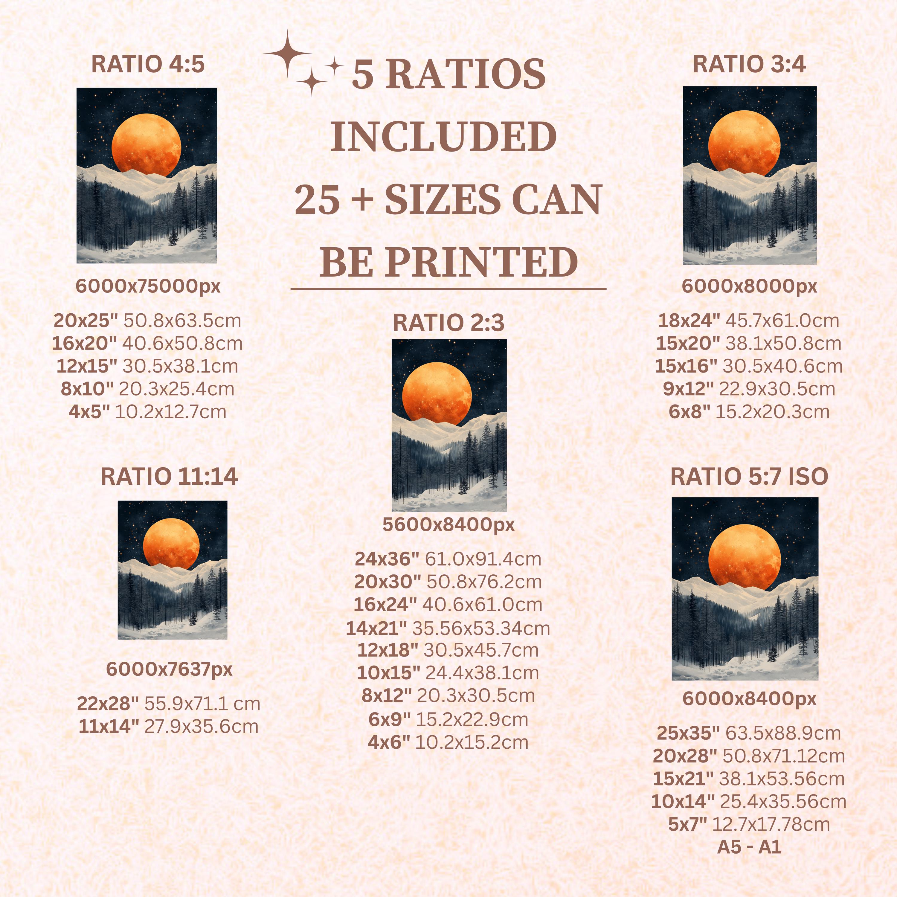 Each artwork includes 5 aspect ratios with 25+ print sizes. Most standard frames are covered. One custom resize per purchase available—message before ordering.