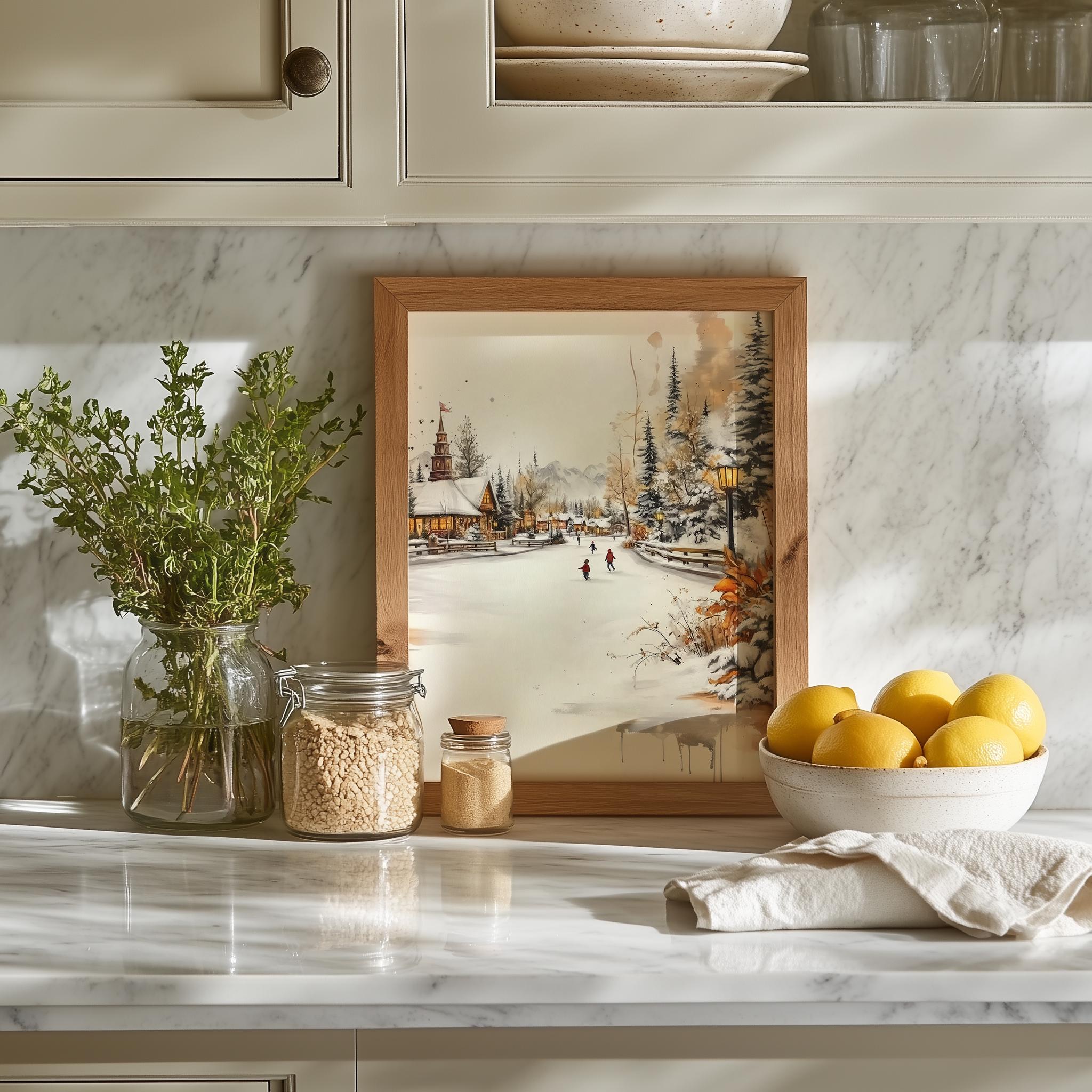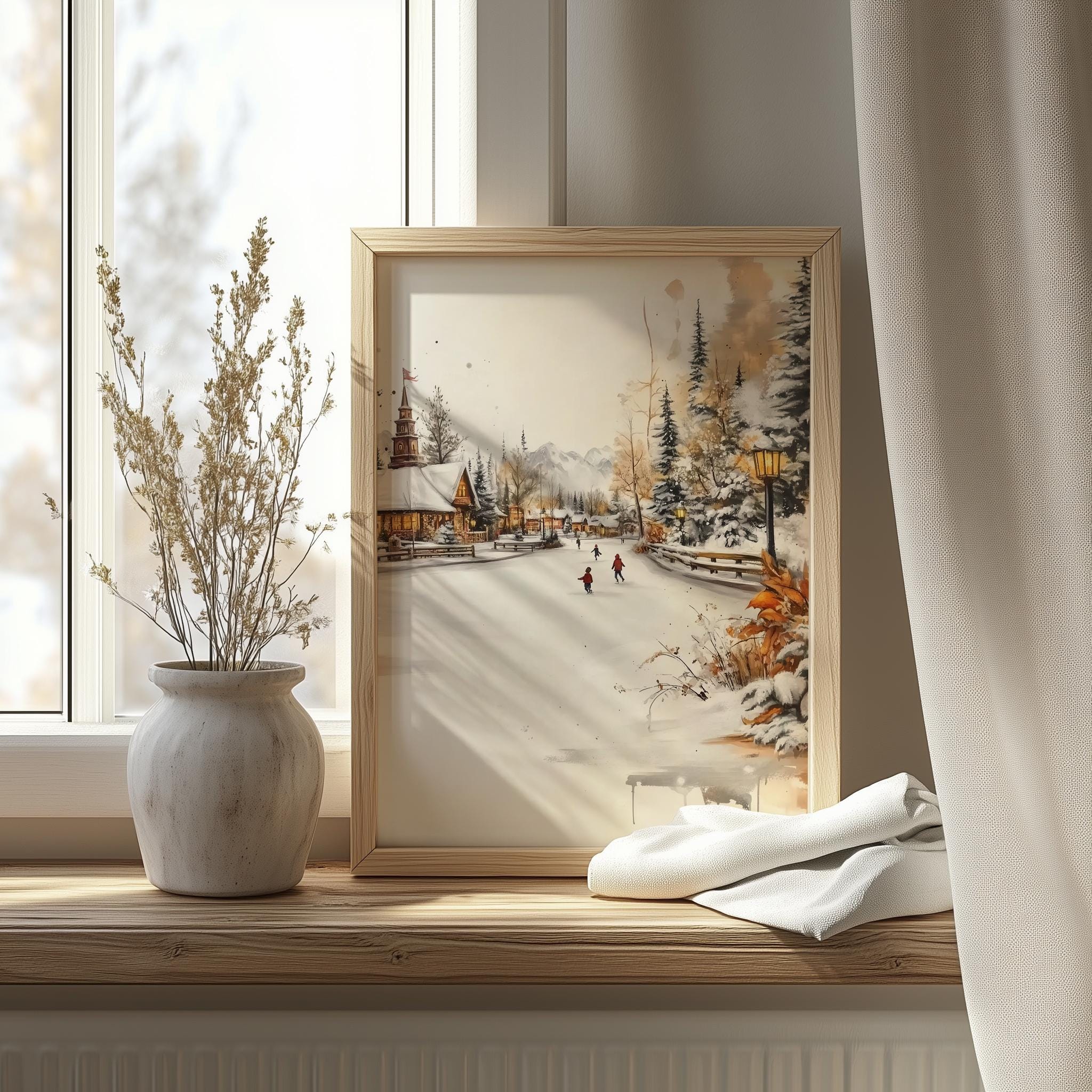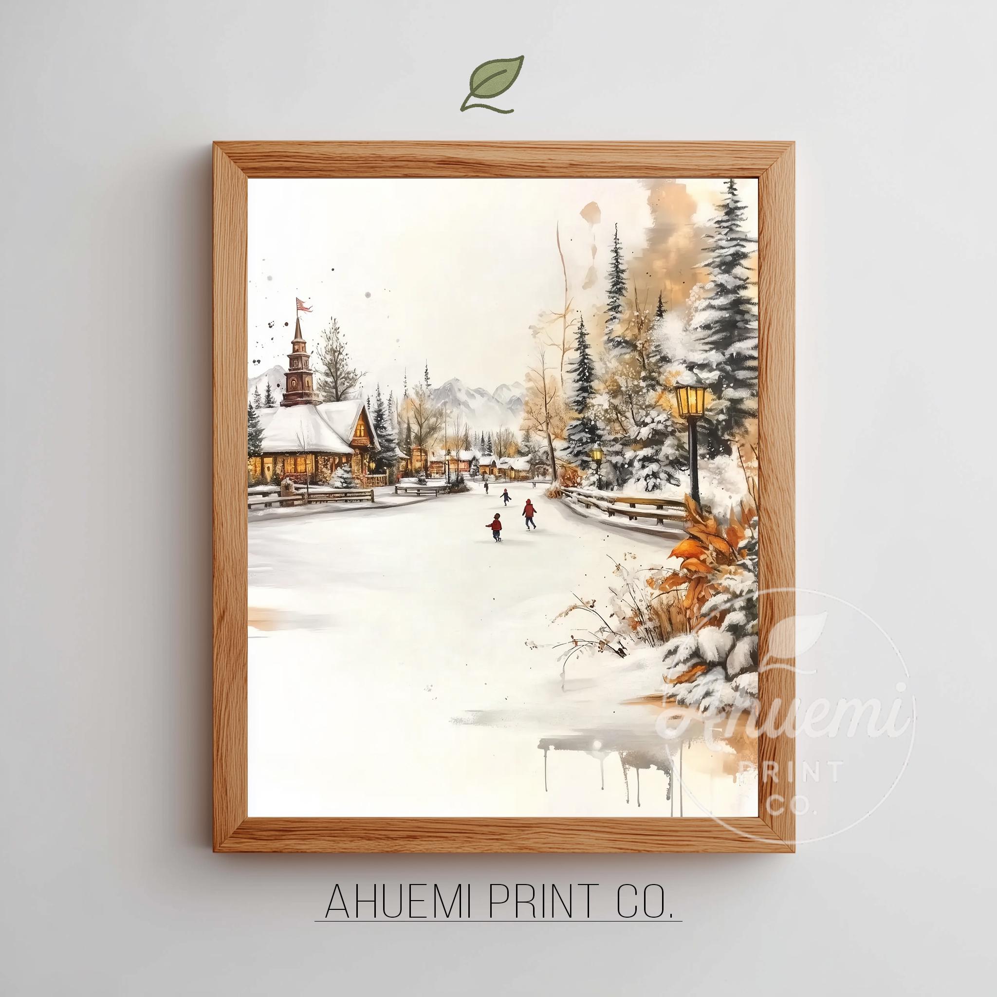 Immerse yourself in the charm of this rustic painting of children joyfully ice skating in a picturesque winter village. An instantly downloadable print, it's perfect for elevating your decor with budget-friendly charm. This gives you the flexibility to customize the size, frame, and material according to your personal taste and space, ensuring a perfect fit for your walls.