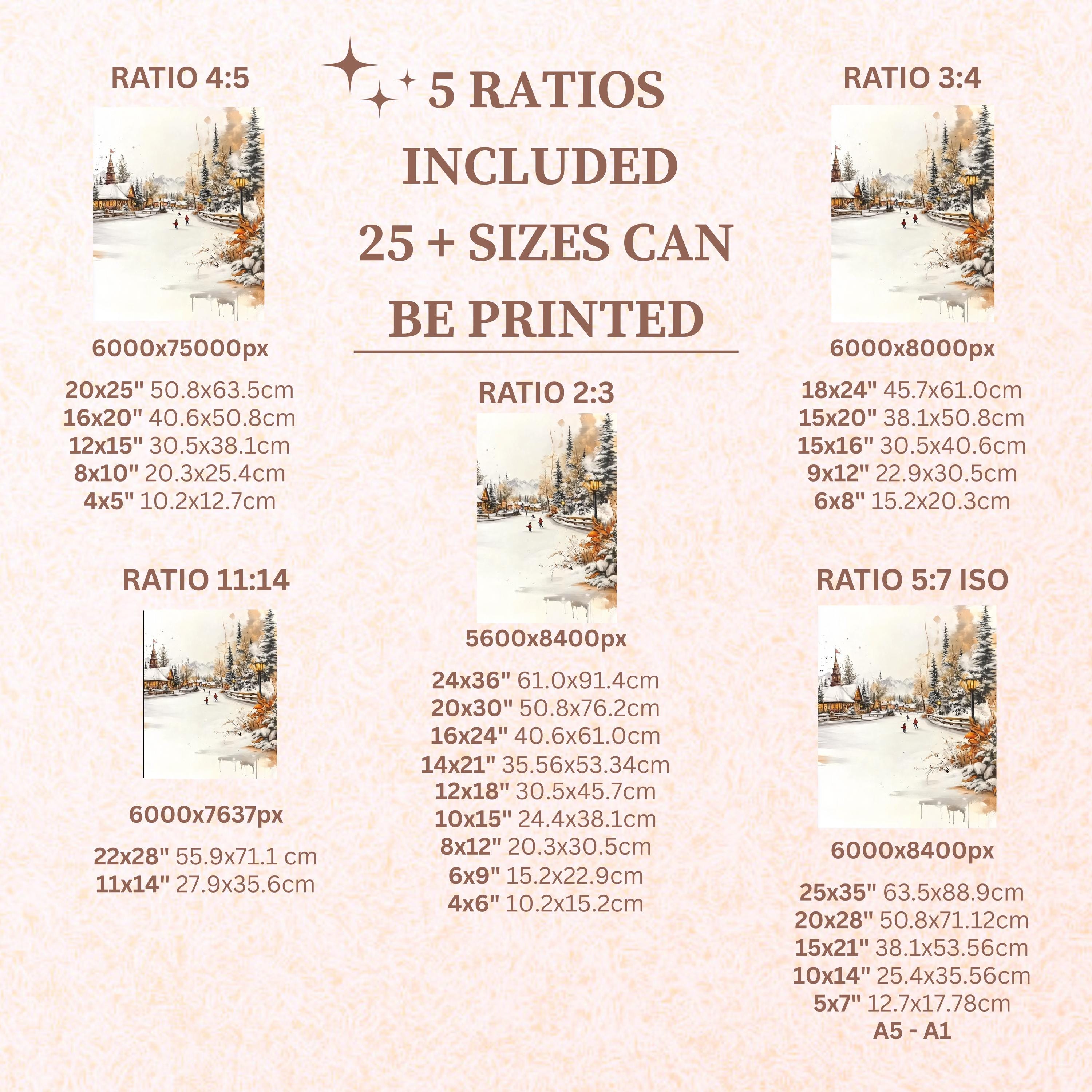 Each artwork includes 5 aspect ratios with 25+ print sizes. Most standard frames are covered. One custom resize per purchase available—message before ordering.