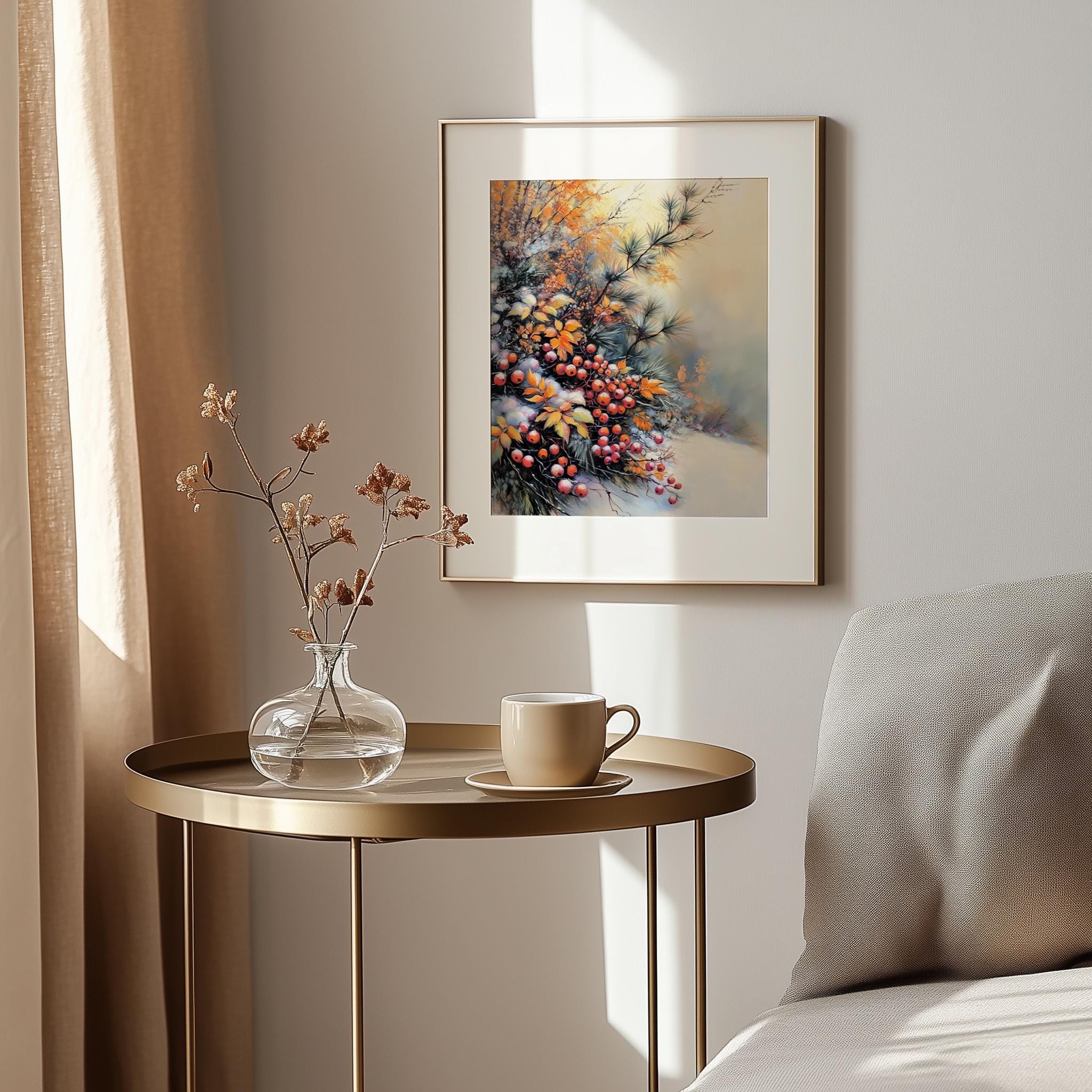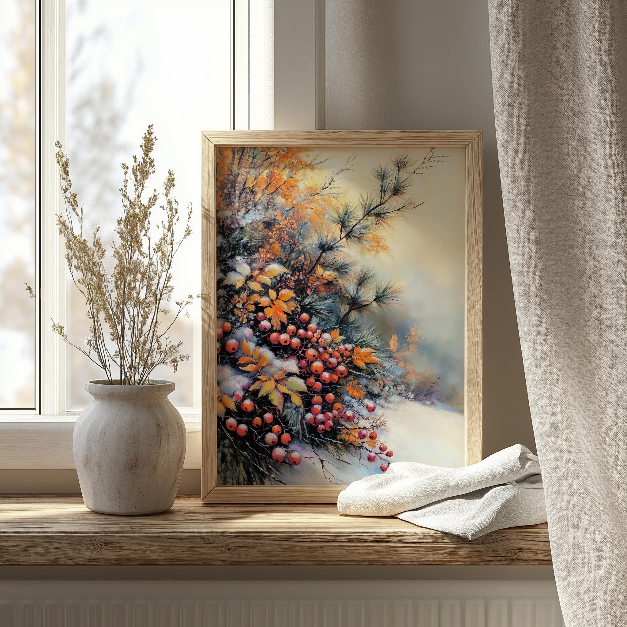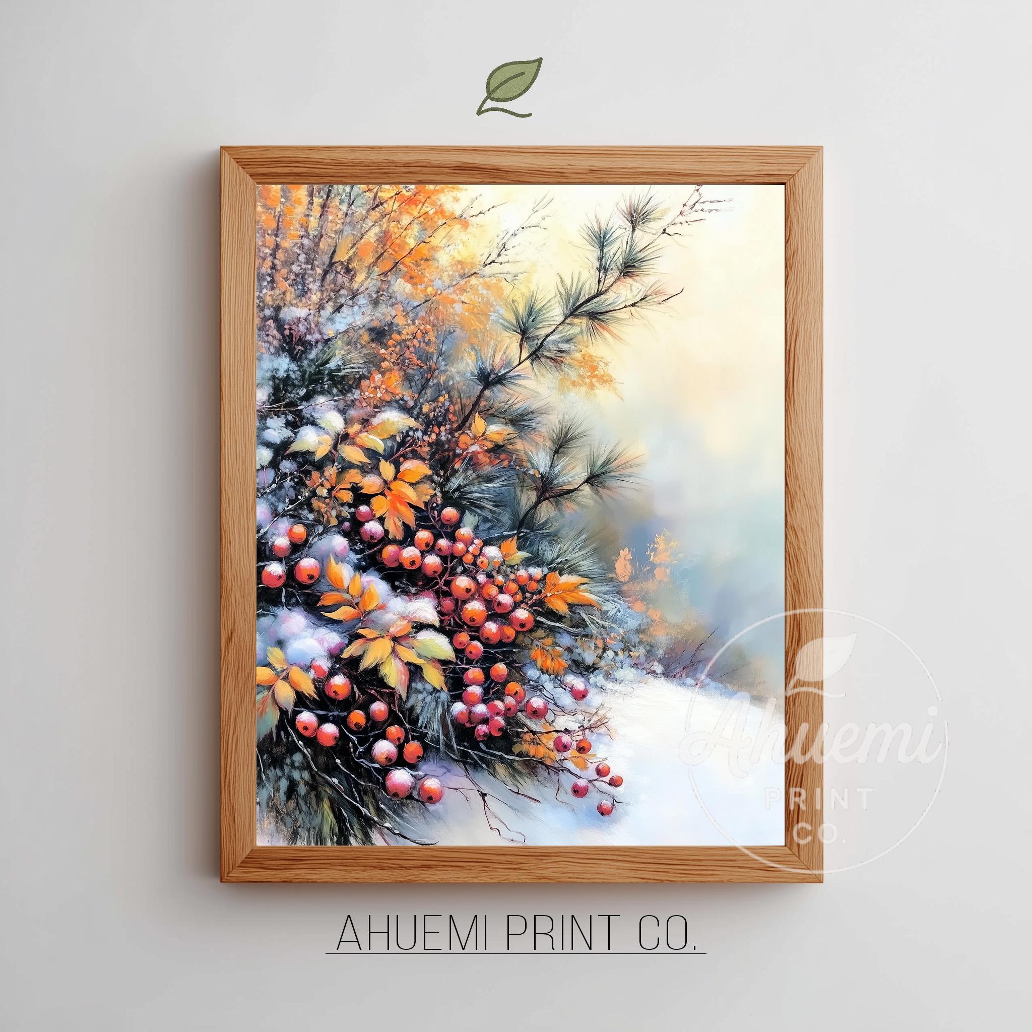 Immerse yourself in the charm of this rustic painting of vintage winter berries and pine needles. An instantly downloadable print, it's perfect for elevating your decor with budget-friendly charm. This gives you the flexibility to customize the size, frame, and material according to your personal taste and space, ensuring a perfect fit for your walls.