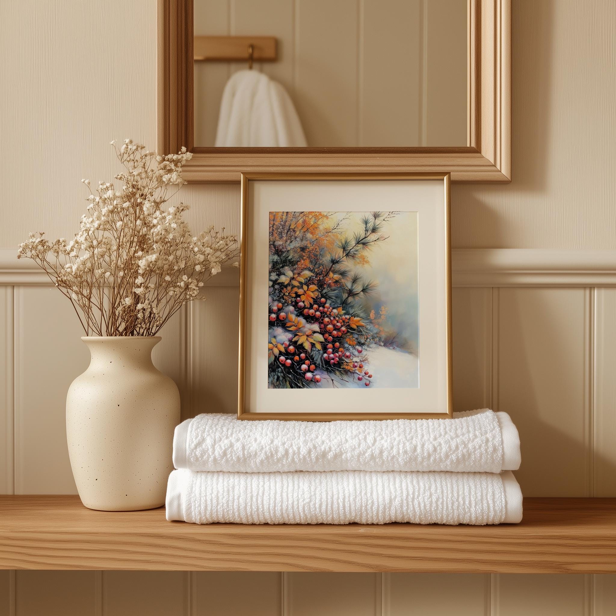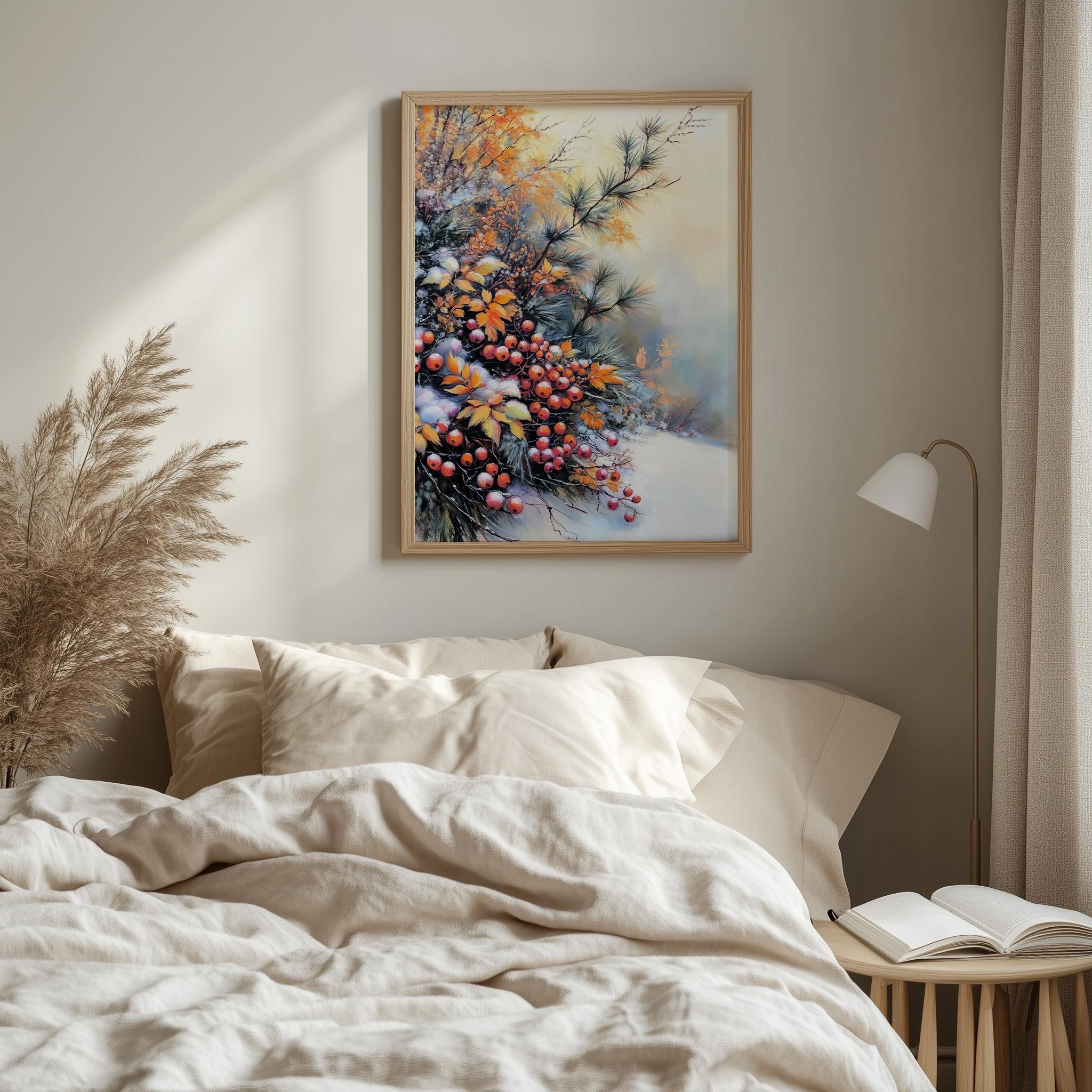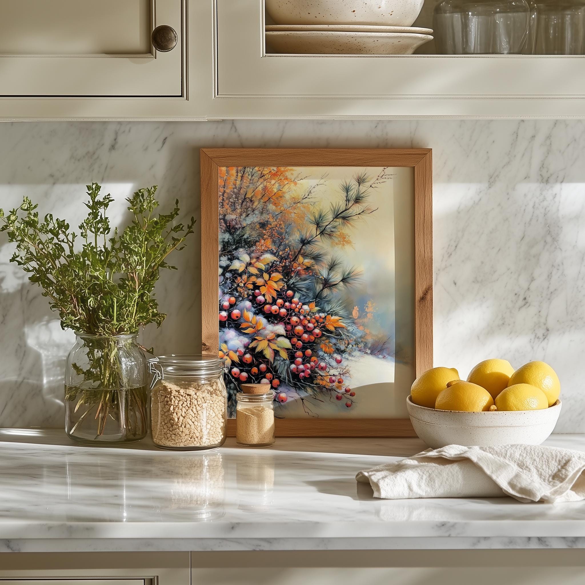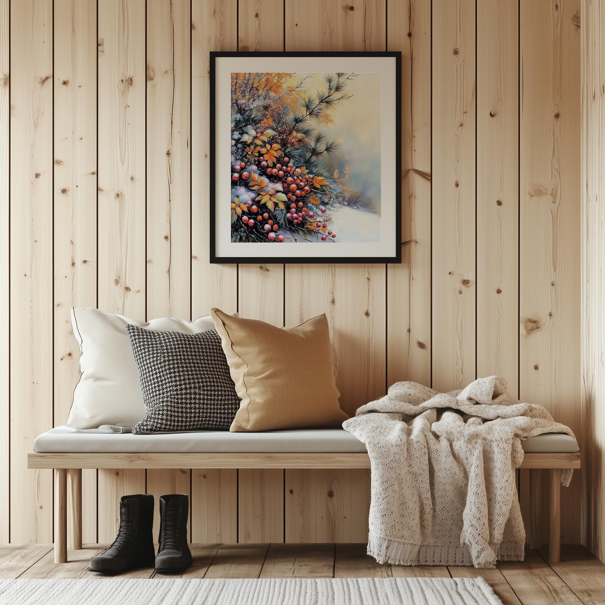Immerse yourself in the charm of this rustic painting of vintage winter berries and pine needles. An instantly downloadable print, it's perfect for elevating your decor with budget-friendly charm. This gives you the flexibility to customize the size, frame, and material according to your personal taste and space, ensuring a perfect fit for your walls.