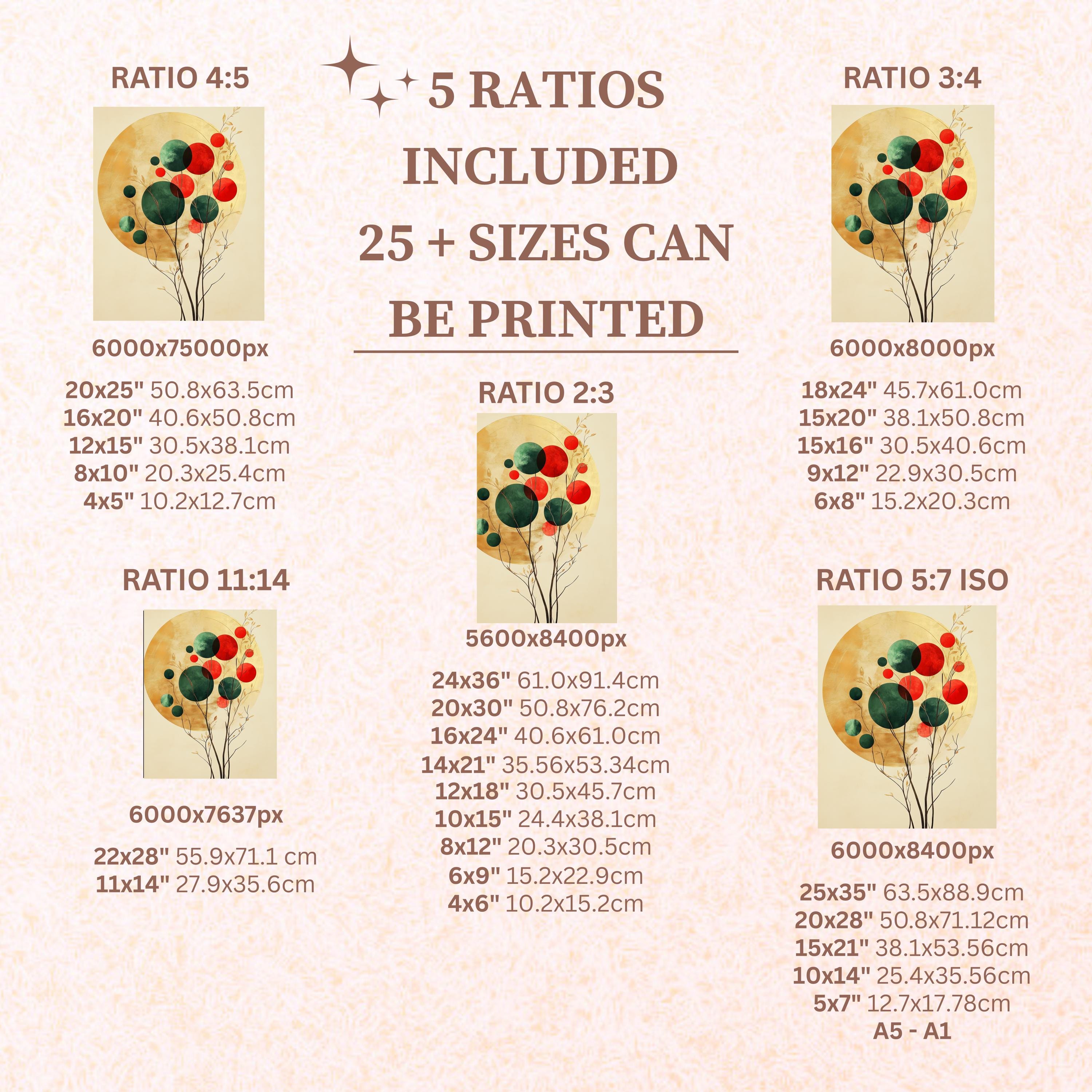 Each artwork includes 5 aspect ratios with 25+ print sizes. Most standard frames are covered. One custom resize per purchase available—message before ordering.