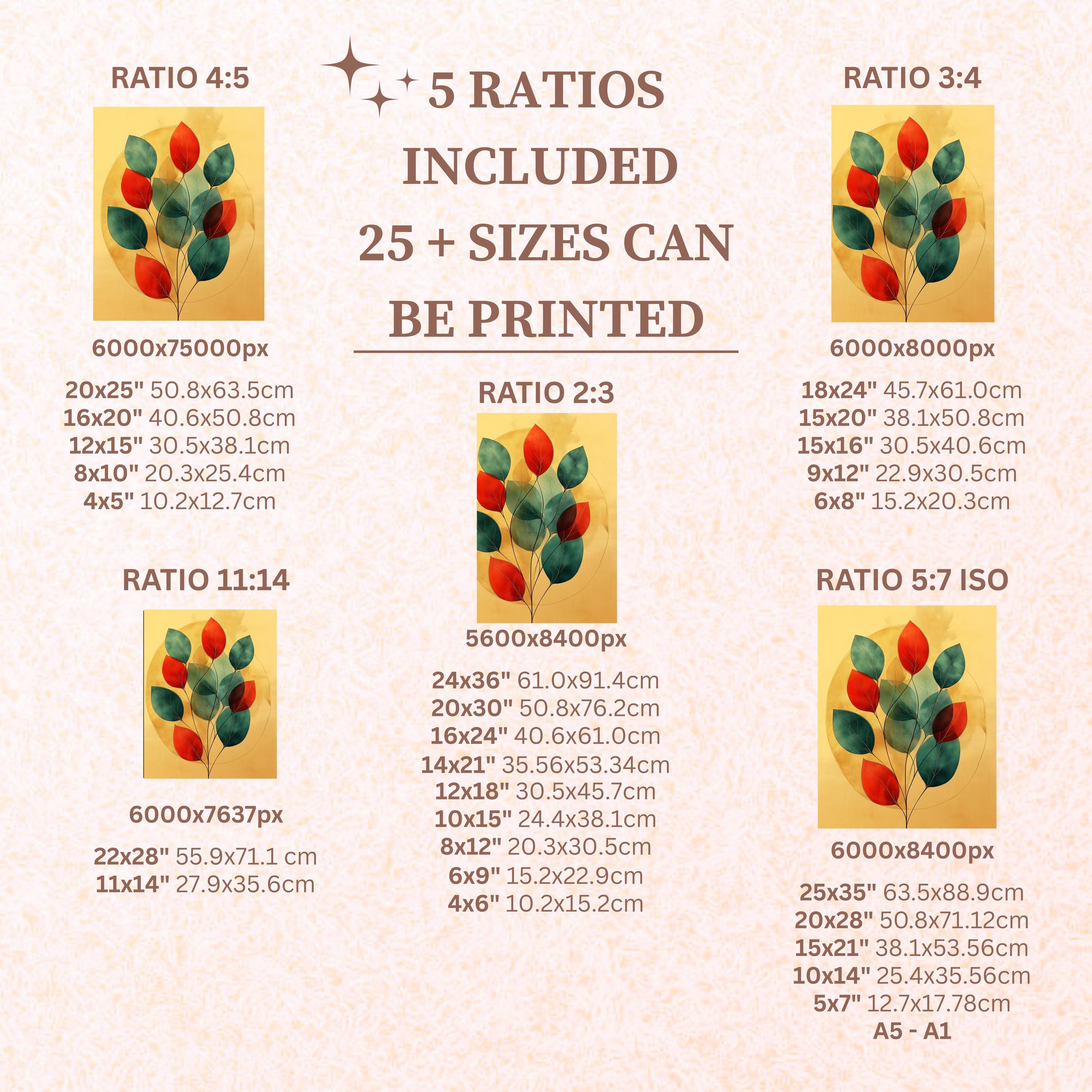 Each artwork includes 5 aspect ratios with 25+ print sizes. Most standard frames are covered. One custom resize per purchase available—message before ordering.