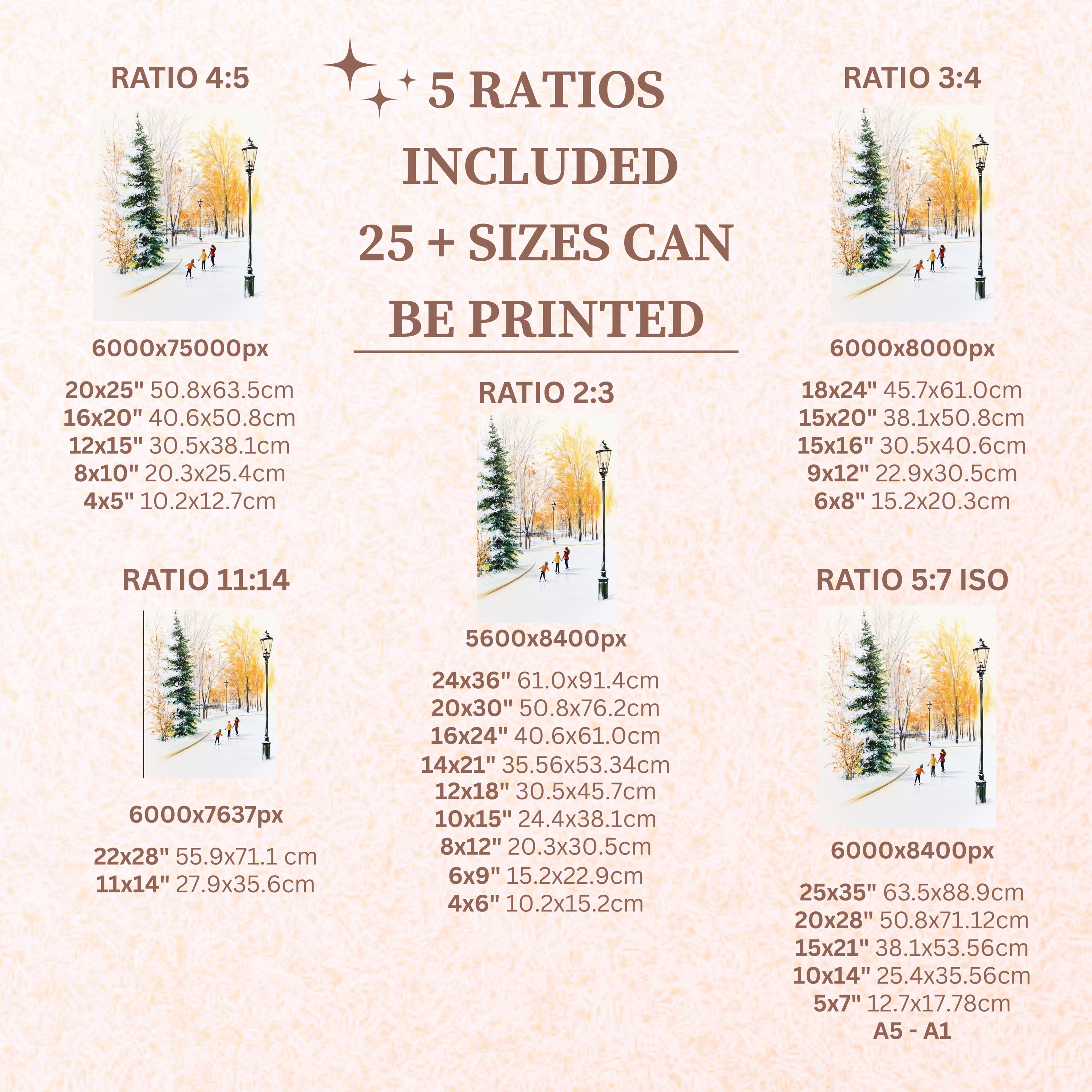 Each artwork includes 5 aspect ratios with 25+ print sizes. Most standard frames are covered. One custom resize per purchase available—message before ordering.