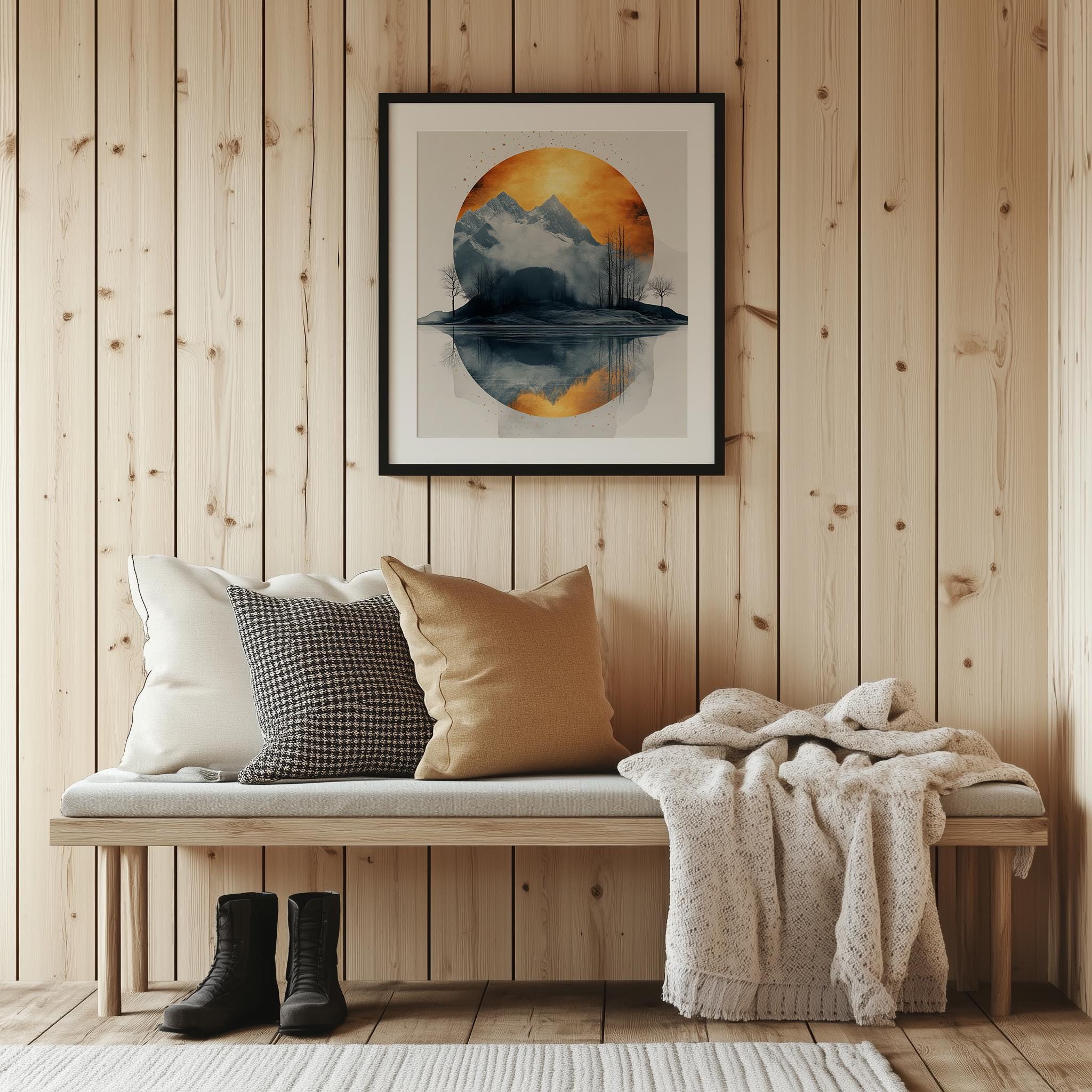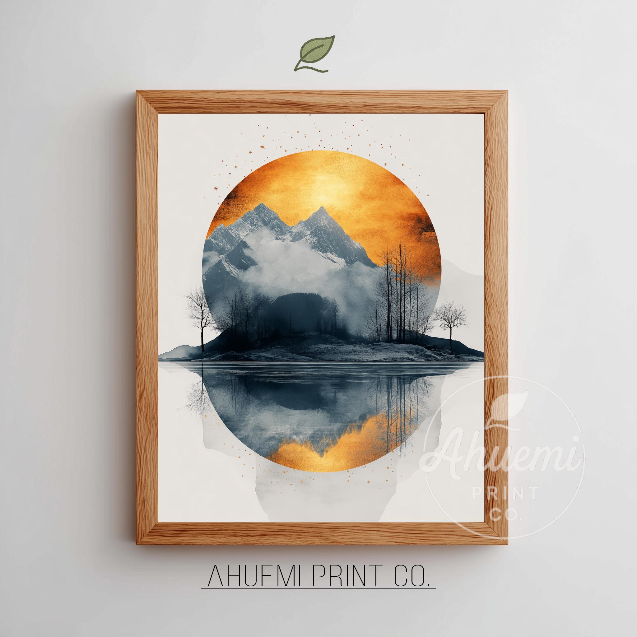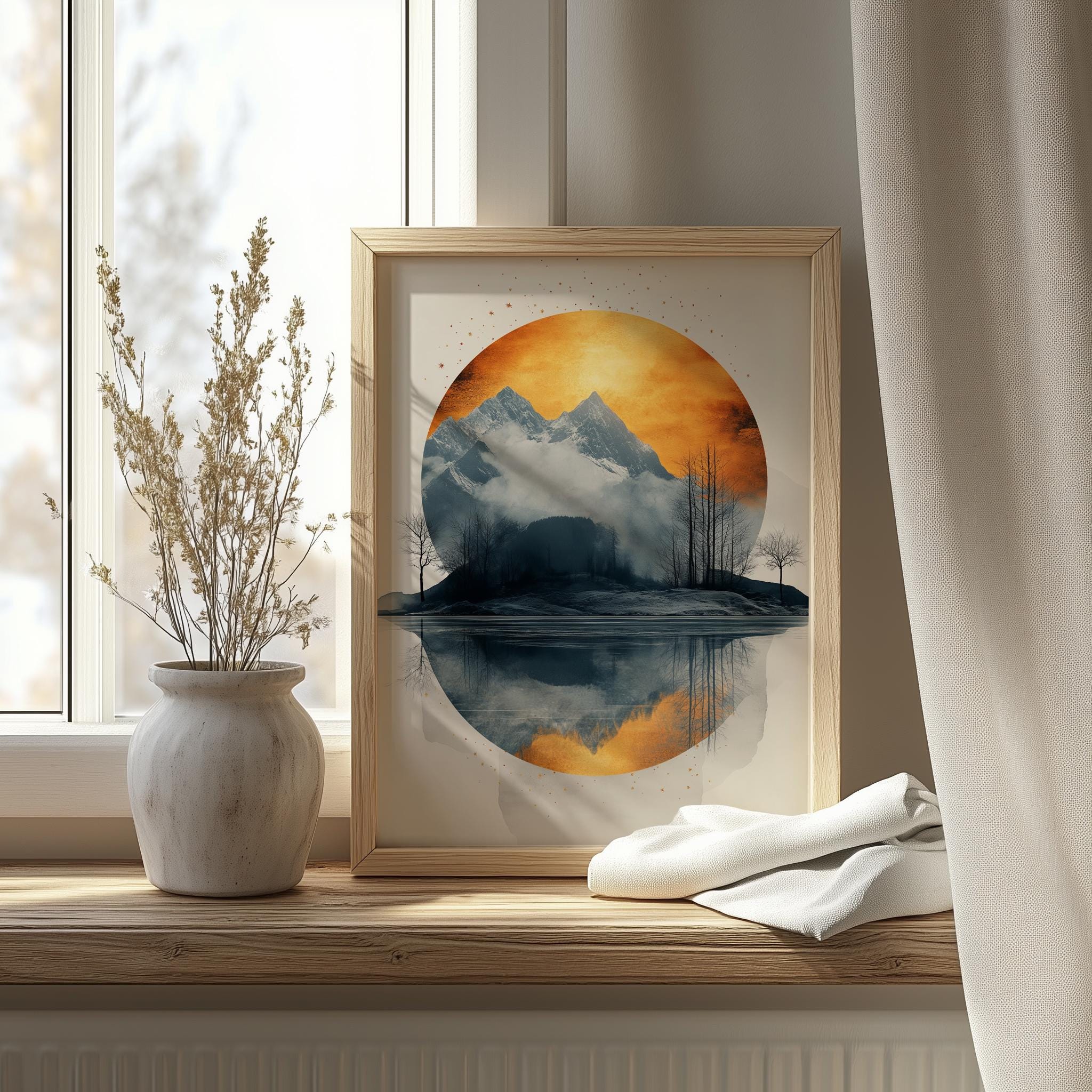 Immerse yourself in the charm of this rustic painting of a serene winter landscape featuring a tranquil lake surrounded by a moody island. An instantly downloadable print, it's perfect for elevating your decor with budget-friendly charm. This gives you the flexibility to customize the size, frame, and material according to your personal taste and space, ensuring a perfect fit for your walls.