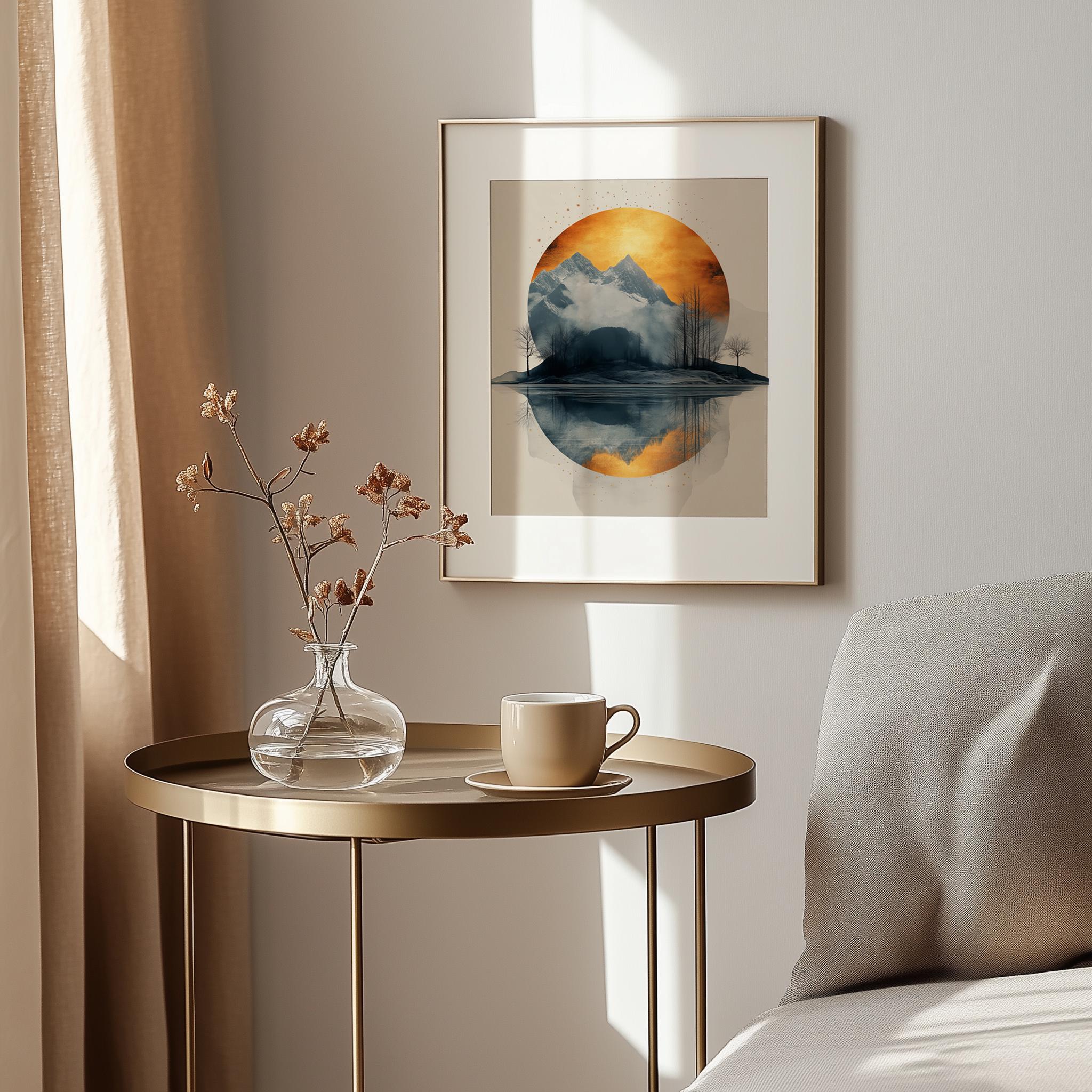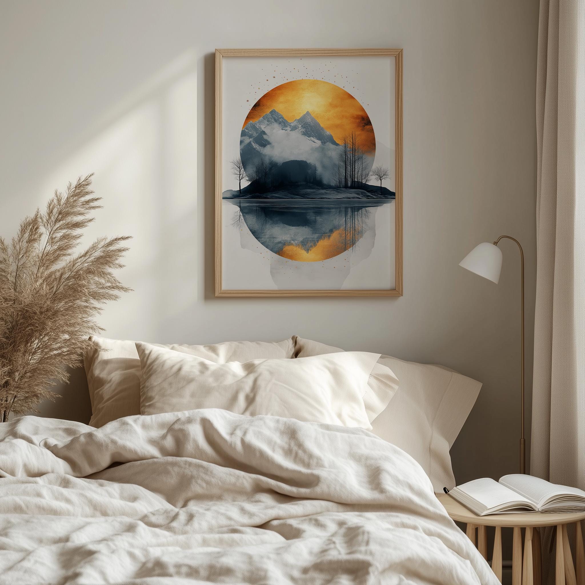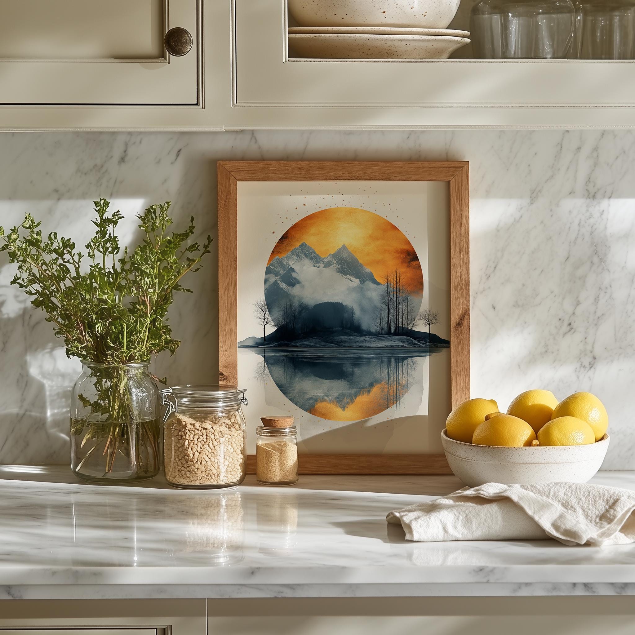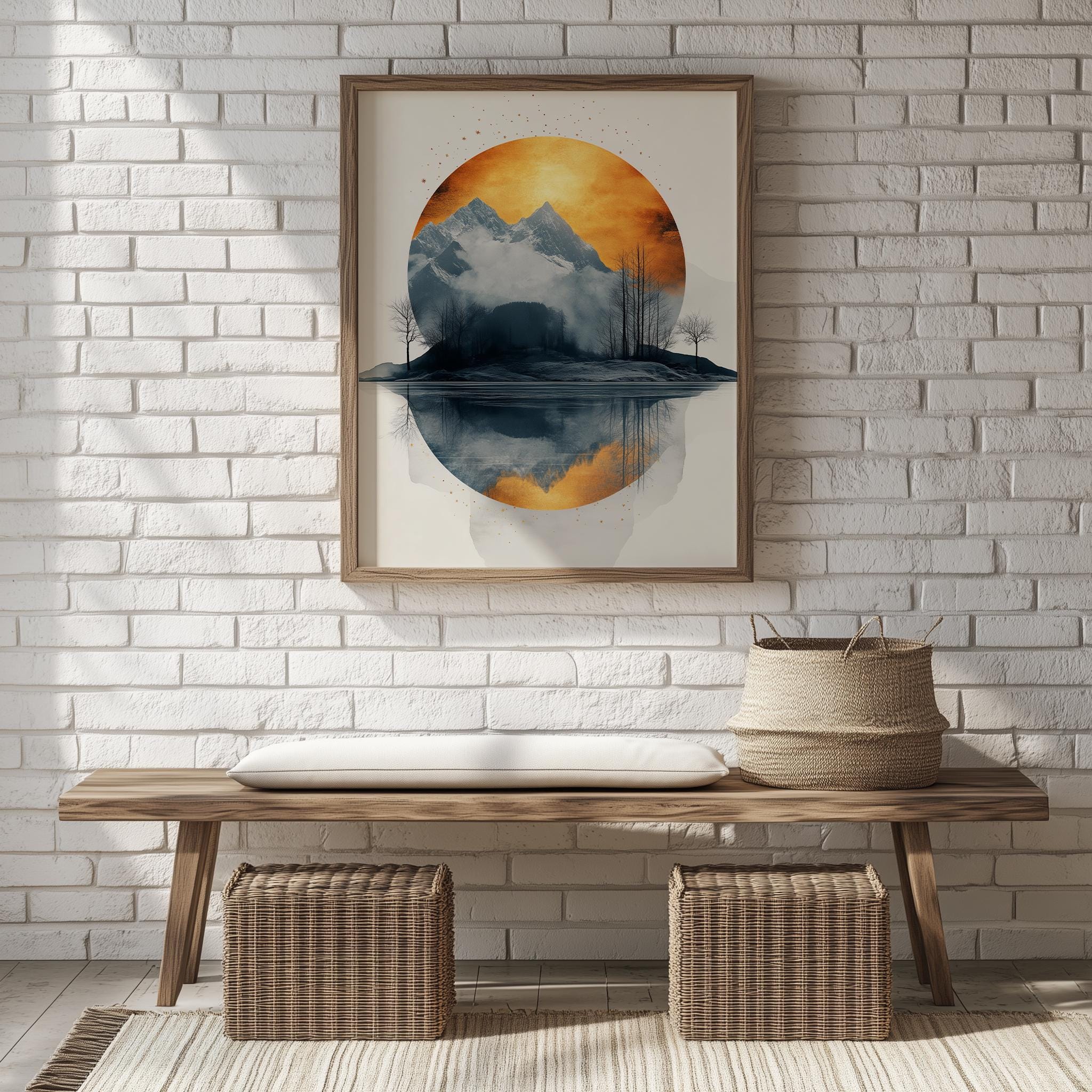 Immerse yourself in the charm of this rustic painting of a serene winter landscape featuring a tranquil lake surrounded by a moody island. An instantly downloadable print, it's perfect for elevating your decor with budget-friendly charm. This gives you the flexibility to customize the size, frame, and material according to your personal taste and space, ensuring a perfect fit for your walls.