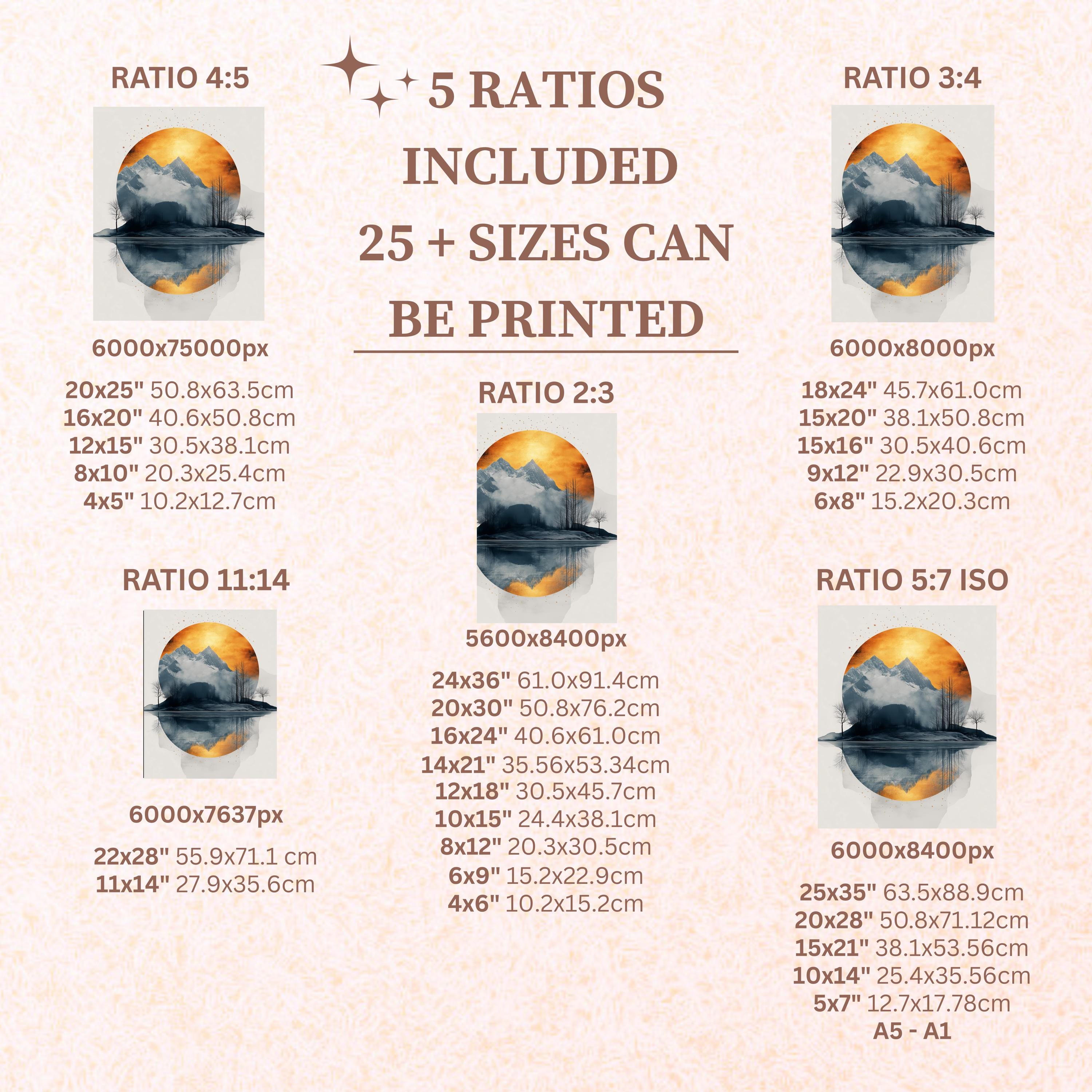 Each artwork includes 5 aspect ratios with 25+ print sizes. Most standard frames are covered. One custom resize per purchase available—message before ordering.